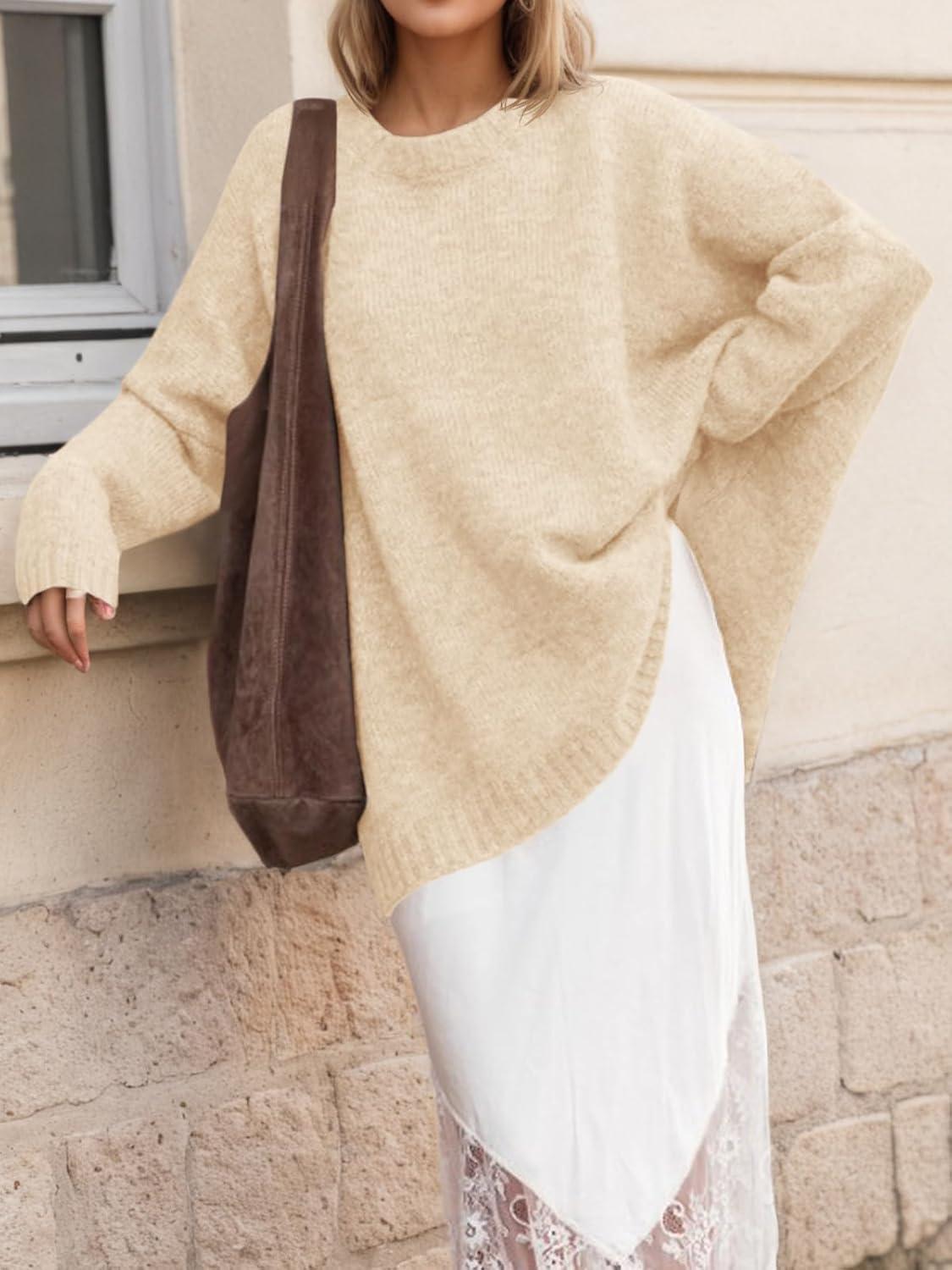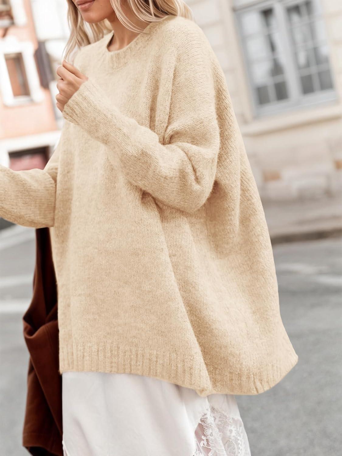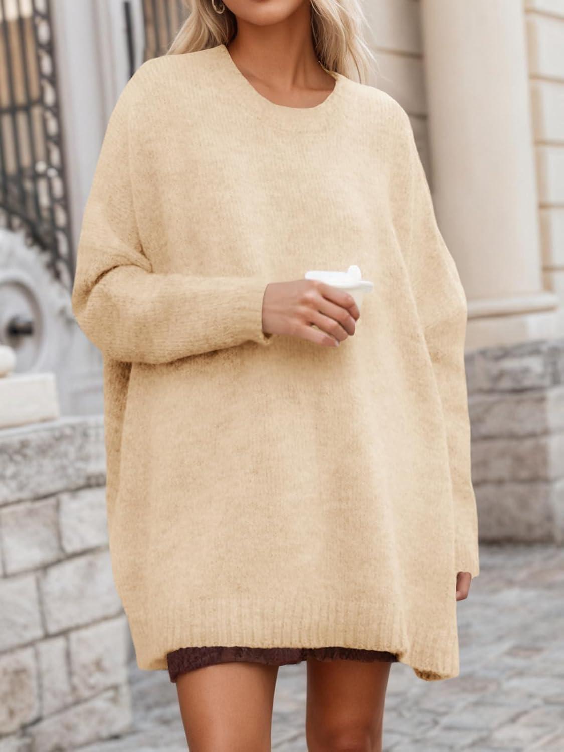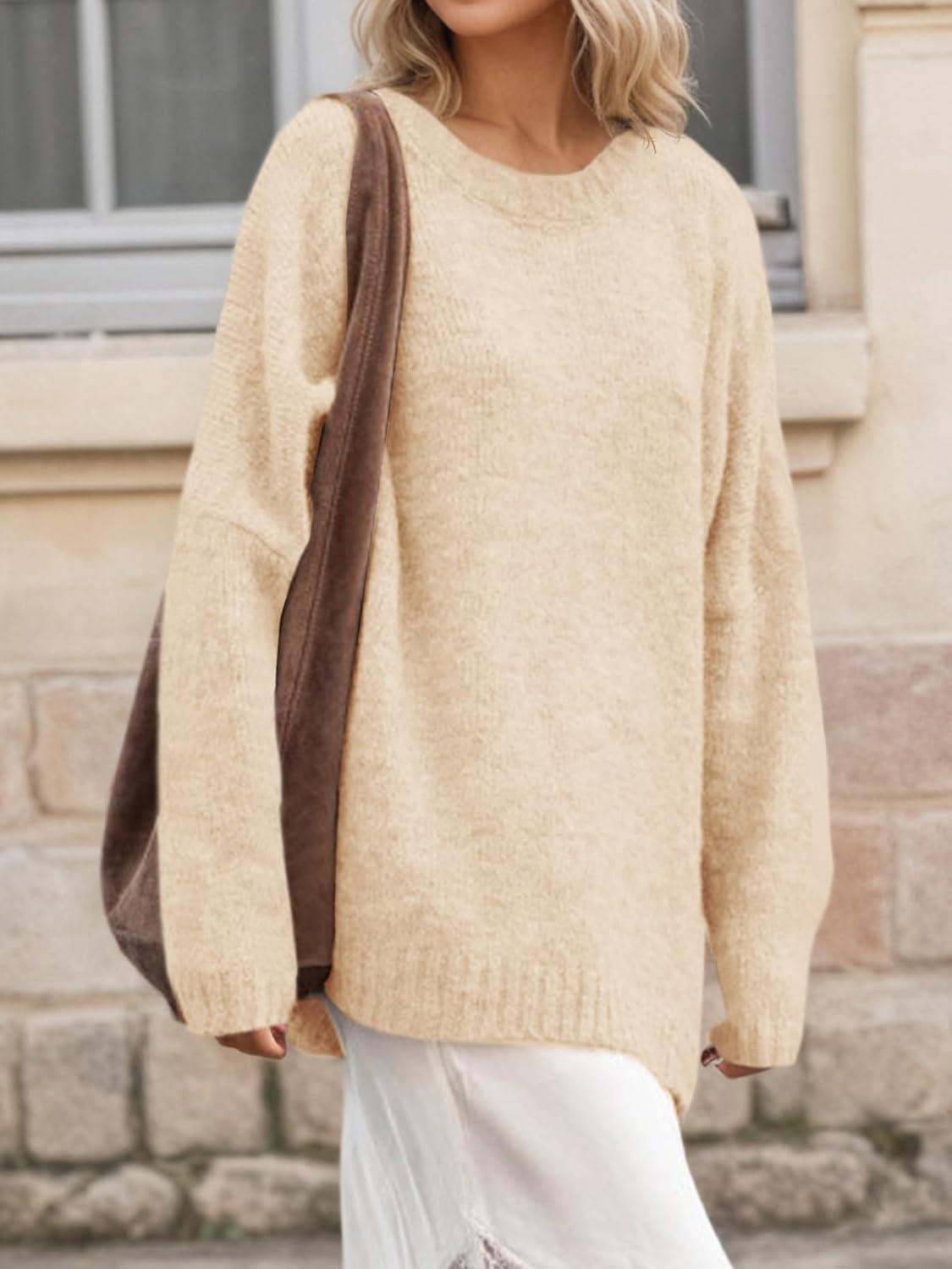 Saodimallsu Womens Oversized Tunic Sweaters Long Sleeve Crew Neck Chunky Knit Slouchy Casual Pullover Sweater Tops(Apricot)