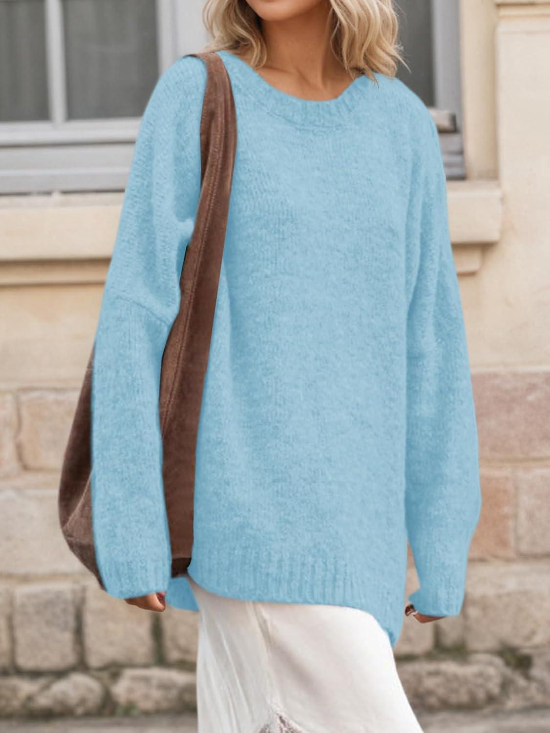 Saodimallsu Womens Oversized Tunic Sweaters Long Sleeve Crew Neck Chunky Knit Slouchy Casual Pullover Sweater Tops(Light Blue)
