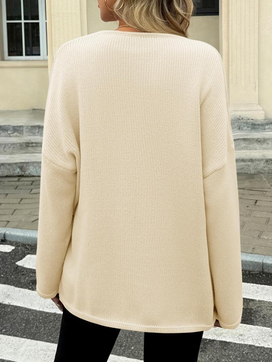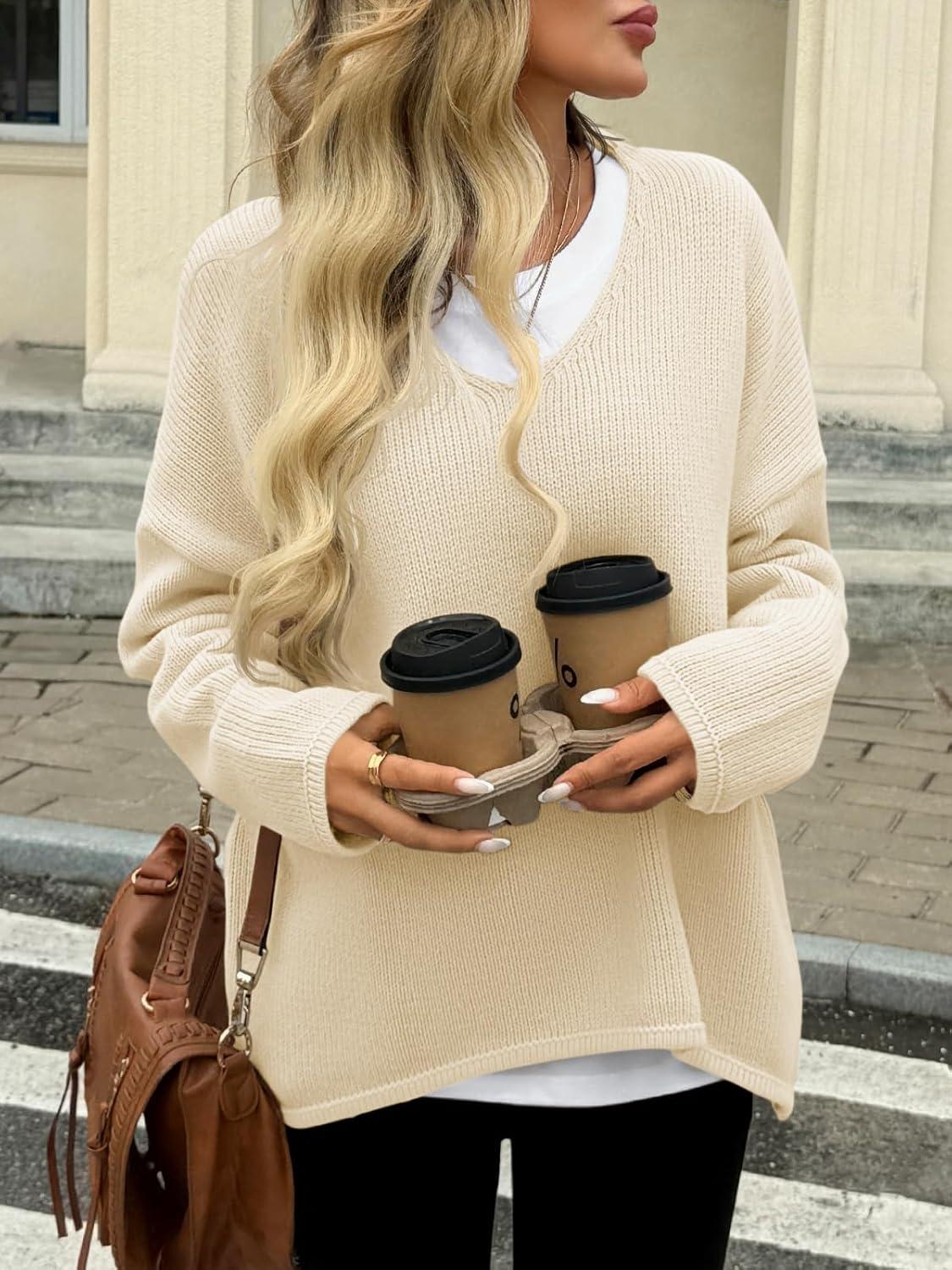 Saodimallsu Womens Oversized V Neck Sweaters Batwing Long Sleeve Knit Fall Slouchy Pullover Sweater Tops(Cream)