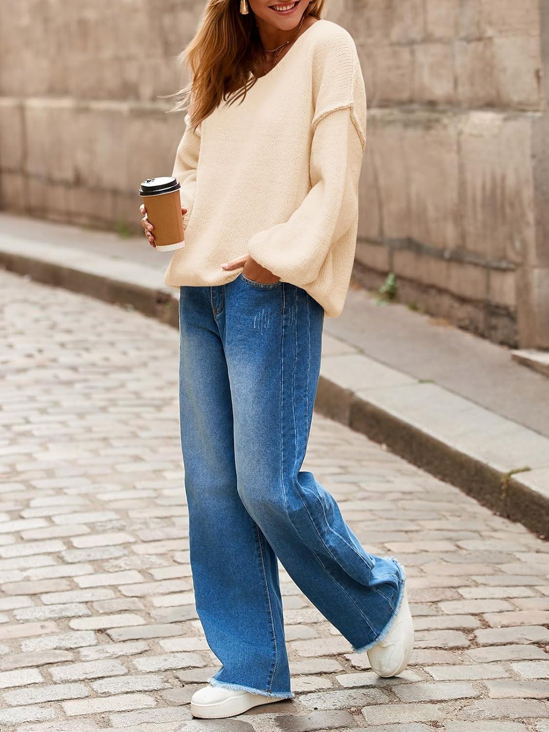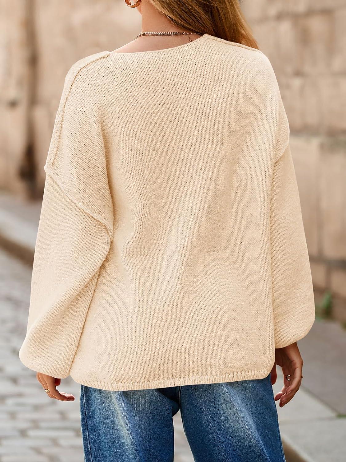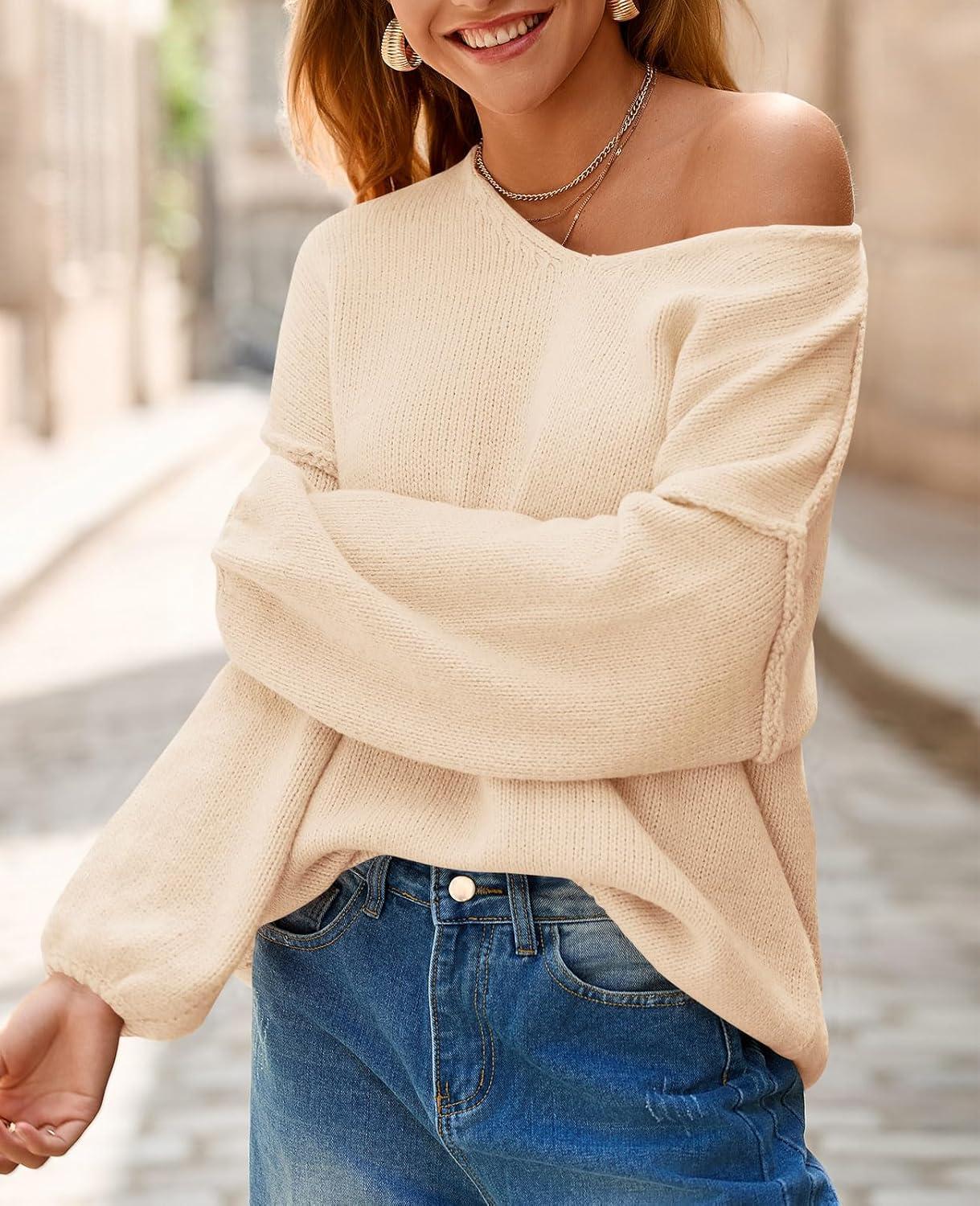 Saodimallsu Womens Oversized V Neck Sweaters Chunky Knit Lantern Long Sleeve Fall Winter Slouchy Tunic Sweater Tops(Apricot)