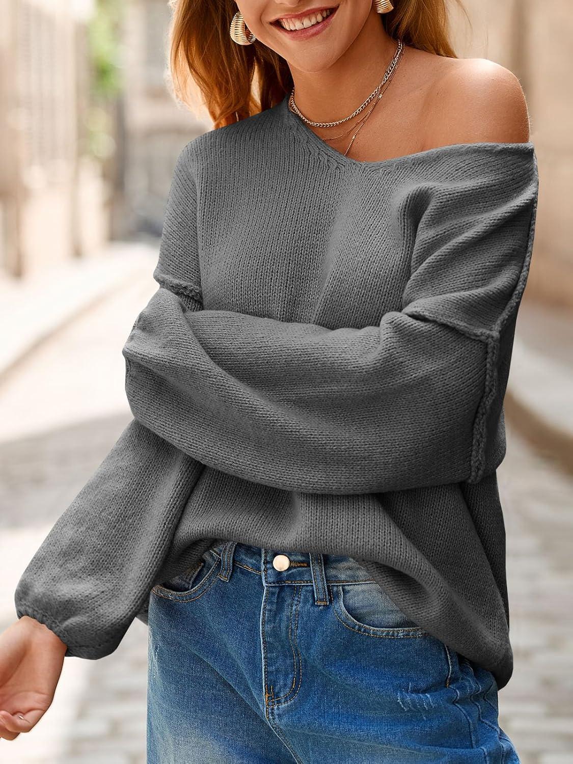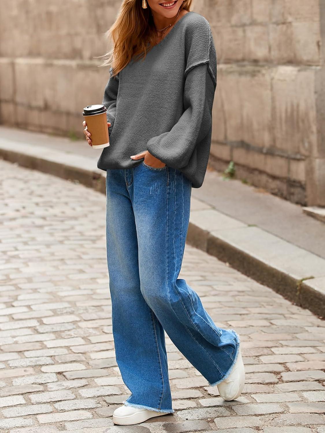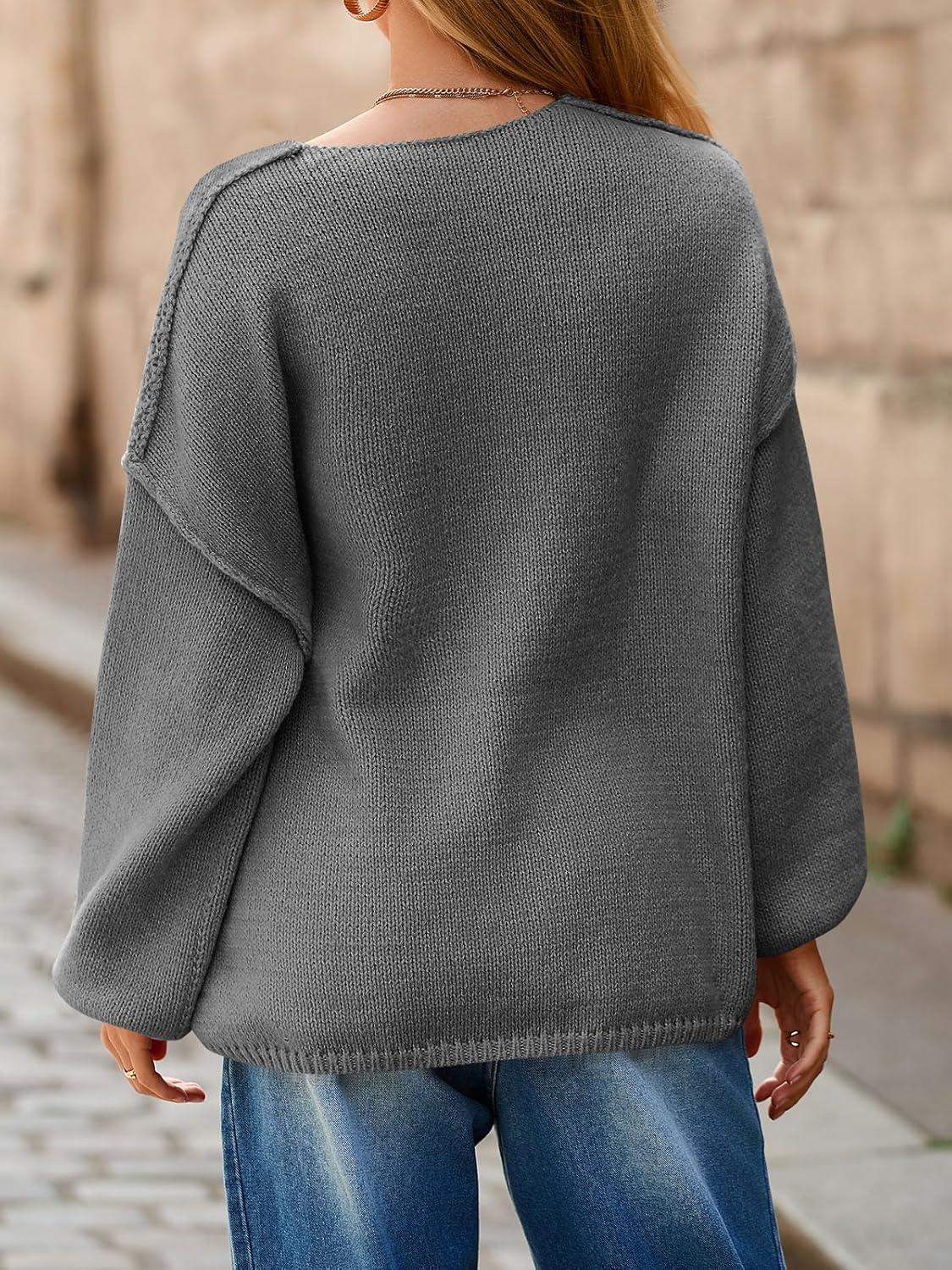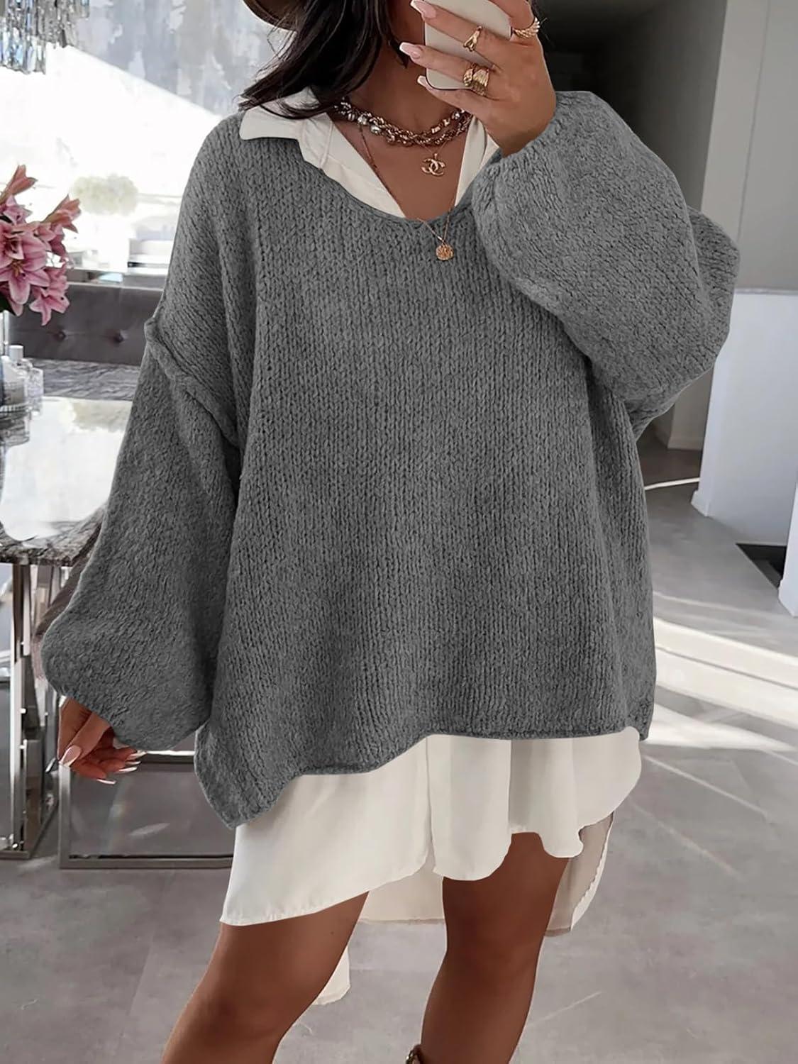 Saodimallsu Womens Oversized V Neck Sweaters Chunky Knit Lantern Long Sleeve Fall Winter Slouchy Tunic Sweater Tops(Dark Grey)
