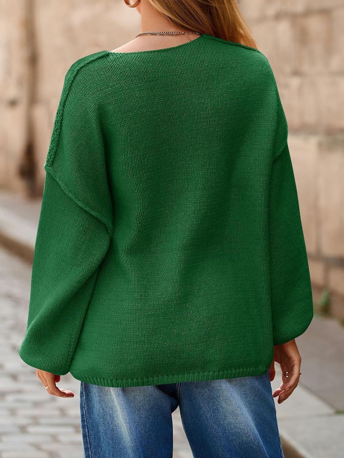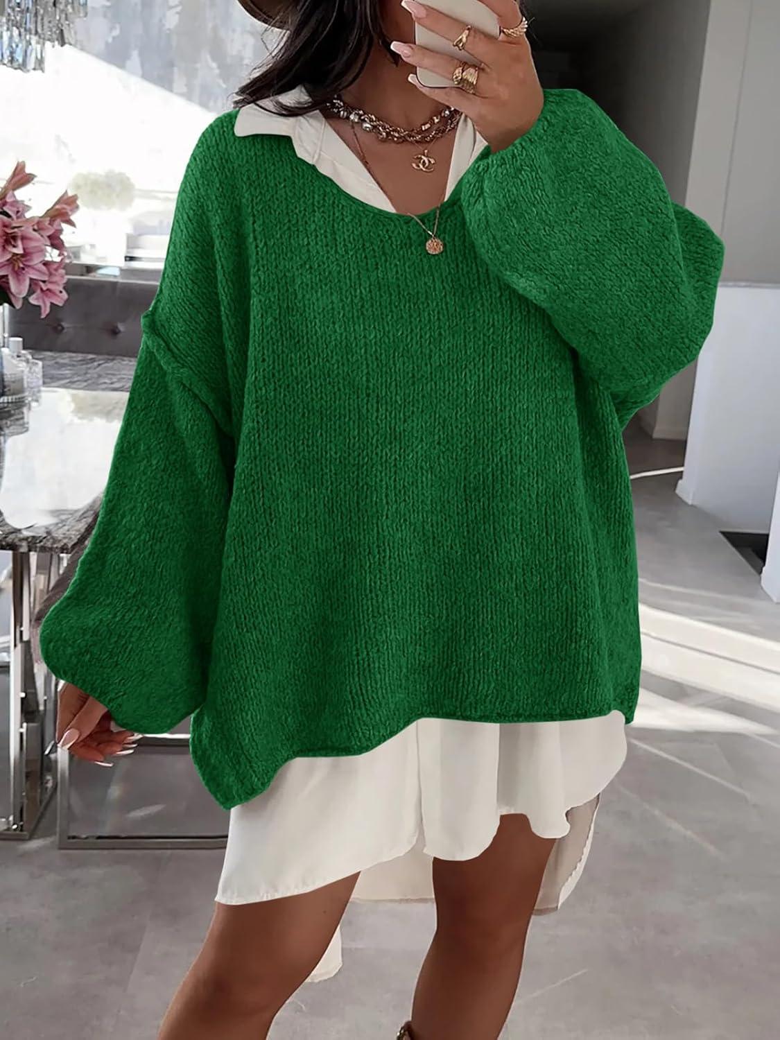 Saodimallsu Womens Oversized V Neck Sweaters Chunky Knit Lantern Long Sleeve Fall Winter Slouchy Tunic Sweater Tops(Deep Green)