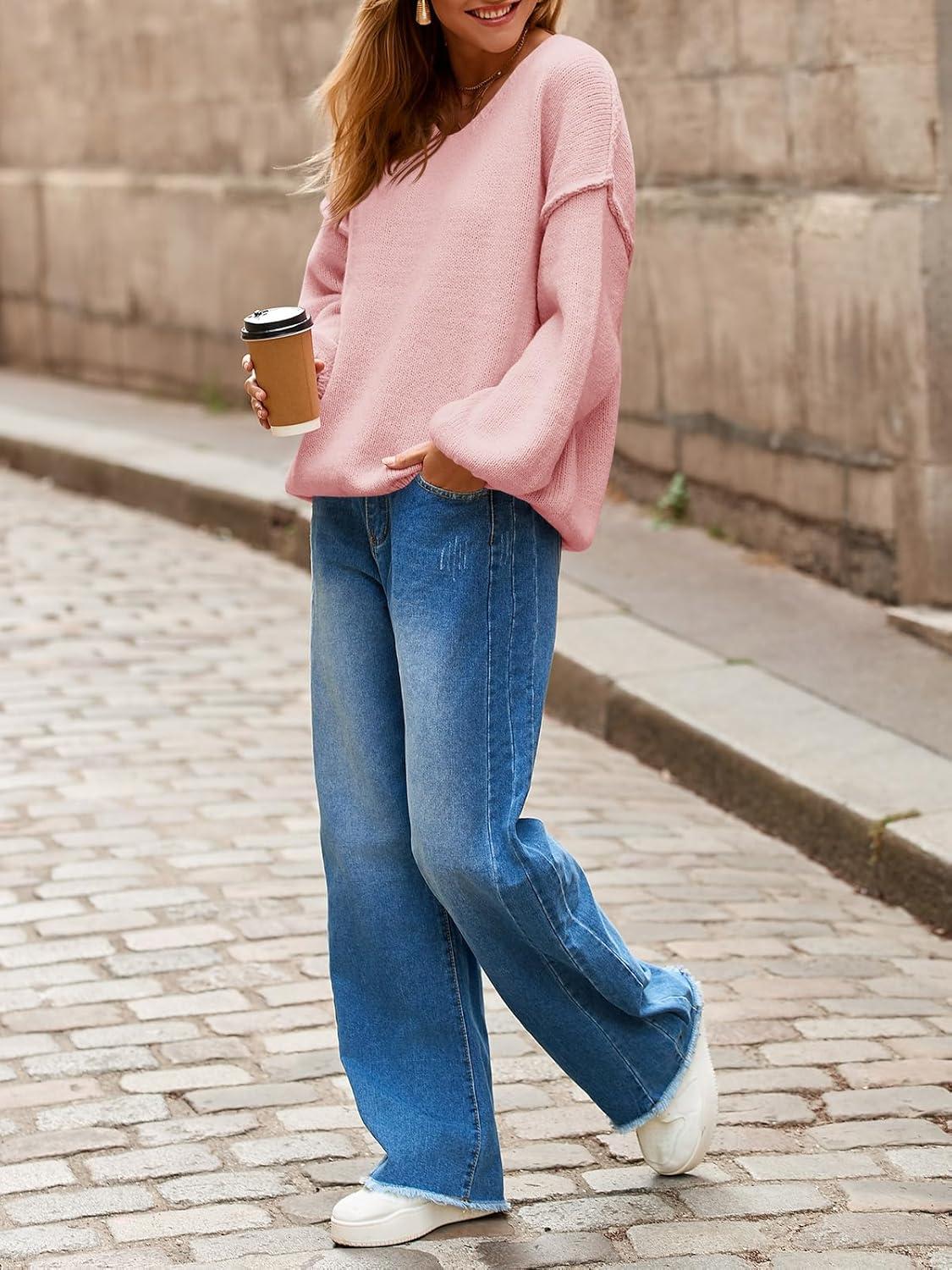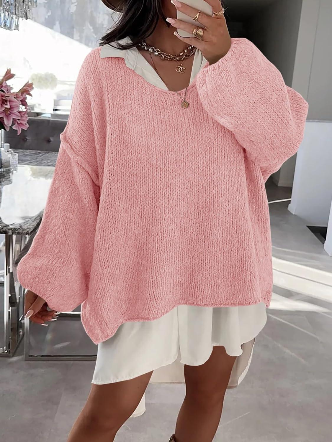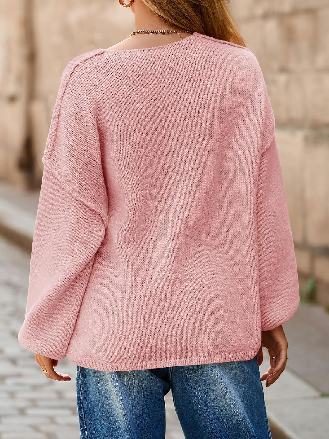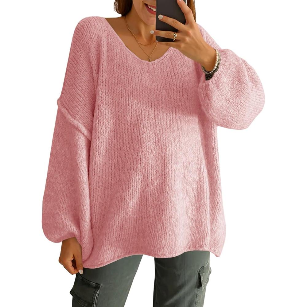 Saodimallsu Womens Oversized V Neck Sweaters Chunky Knit Lantern Long Sleeve Fall Winter Slouchy Tunic Sweater Tops(Pink)