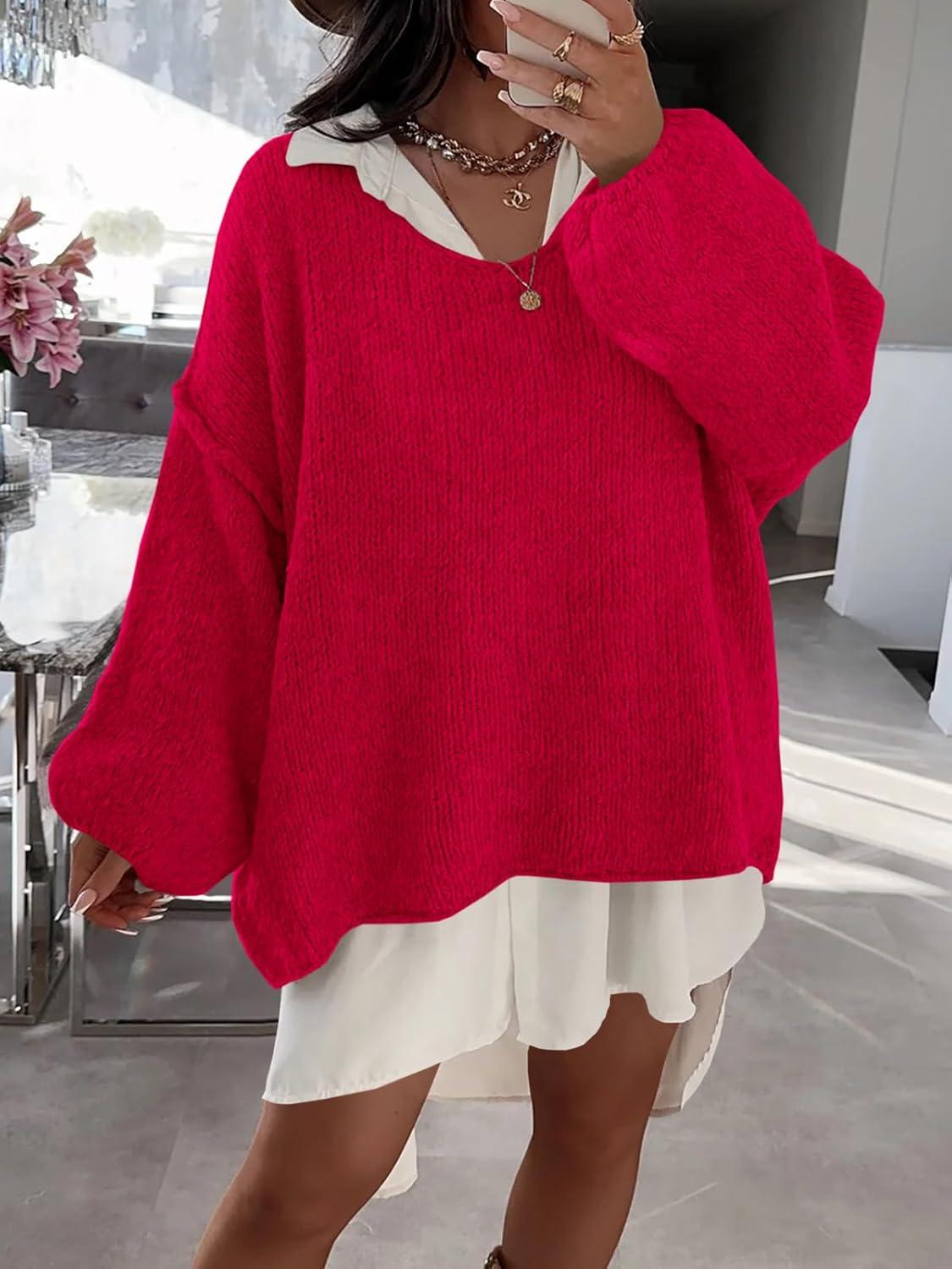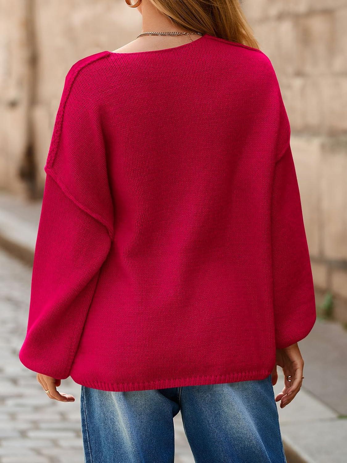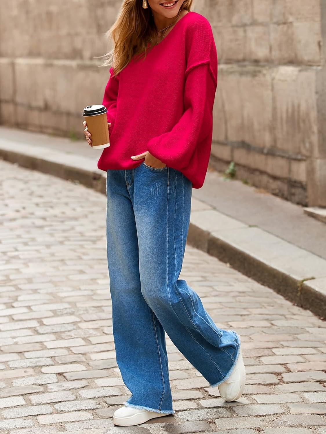 Saodimallsu Womens Oversized V Neck Sweaters Chunky Knit Lantern Long Sleeve Fall Winter Slouchy Tunic Sweater Tops(Red)
