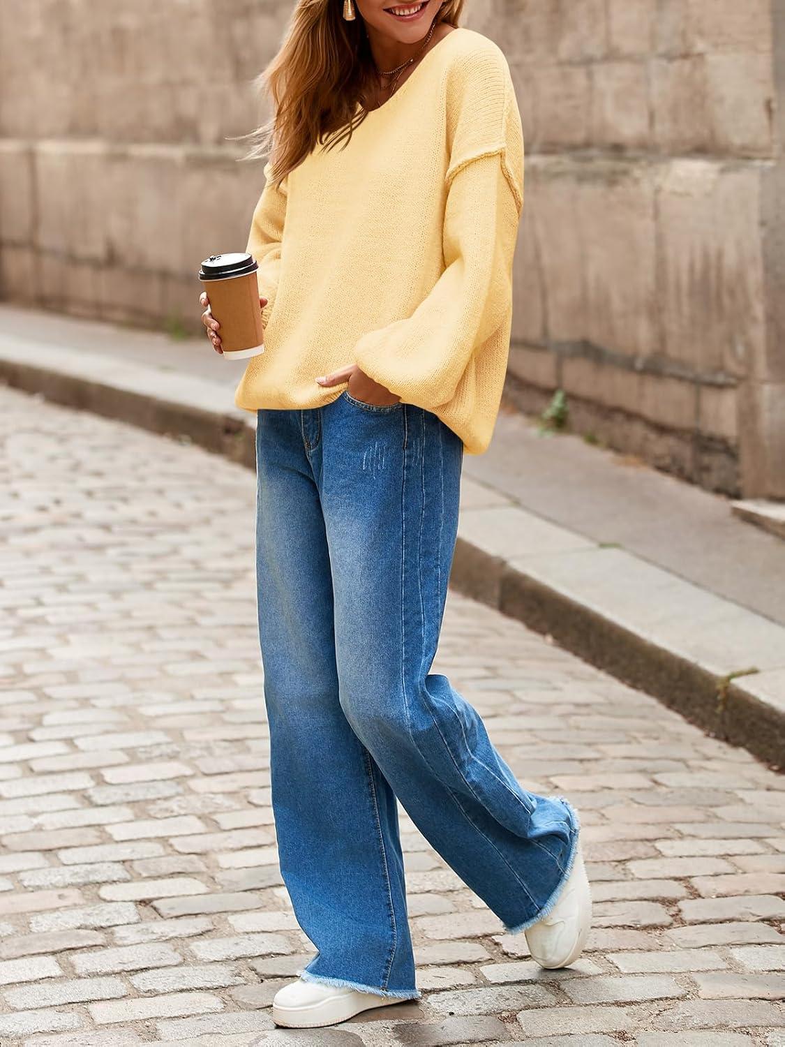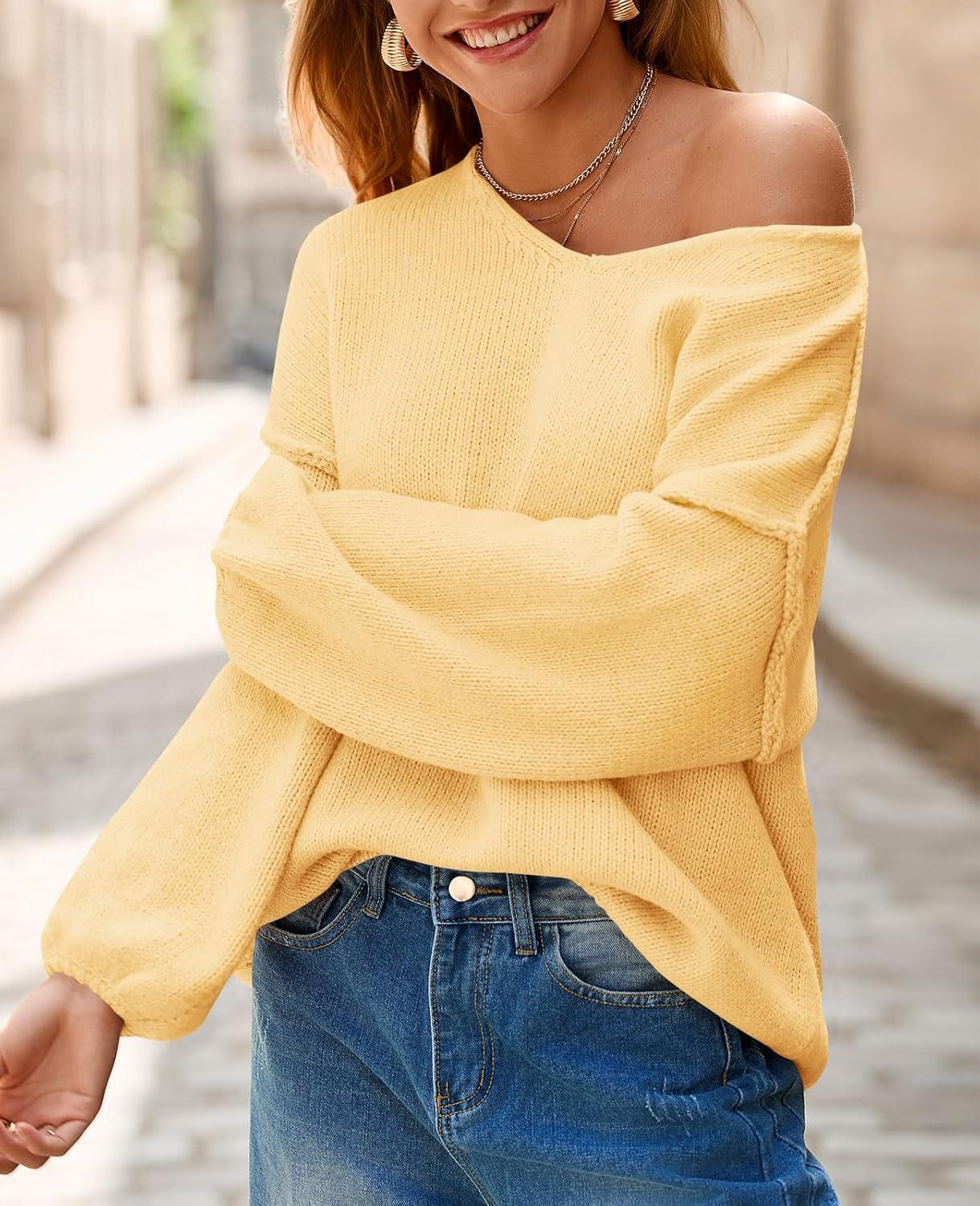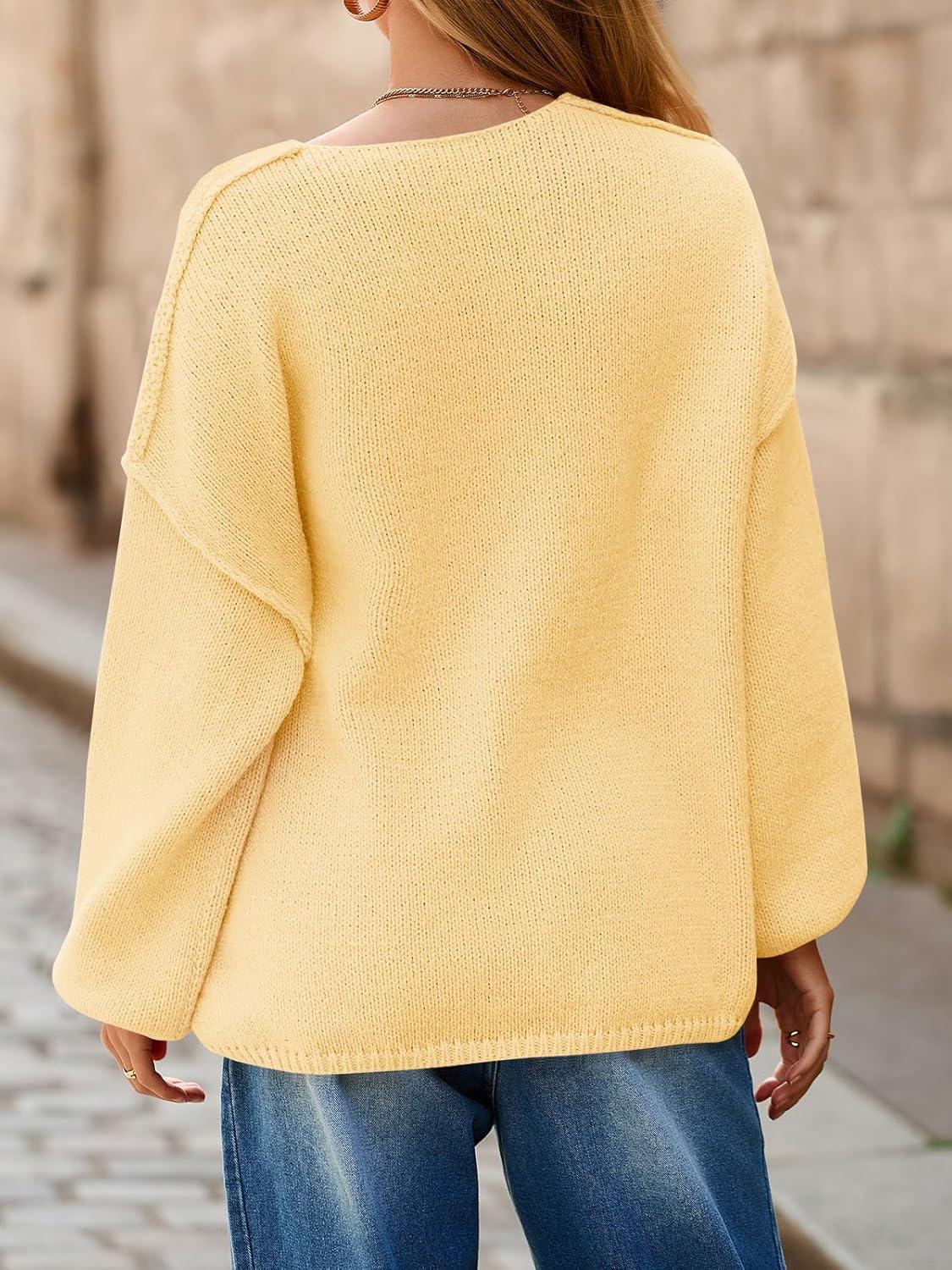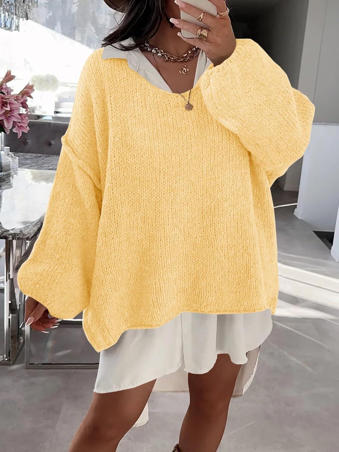 Saodimallsu Womens Oversized V Neck Sweaters Chunky Knit Lantern Long Sleeve Fall Winter Slouchy Tunic Sweater Tops(Yellow)