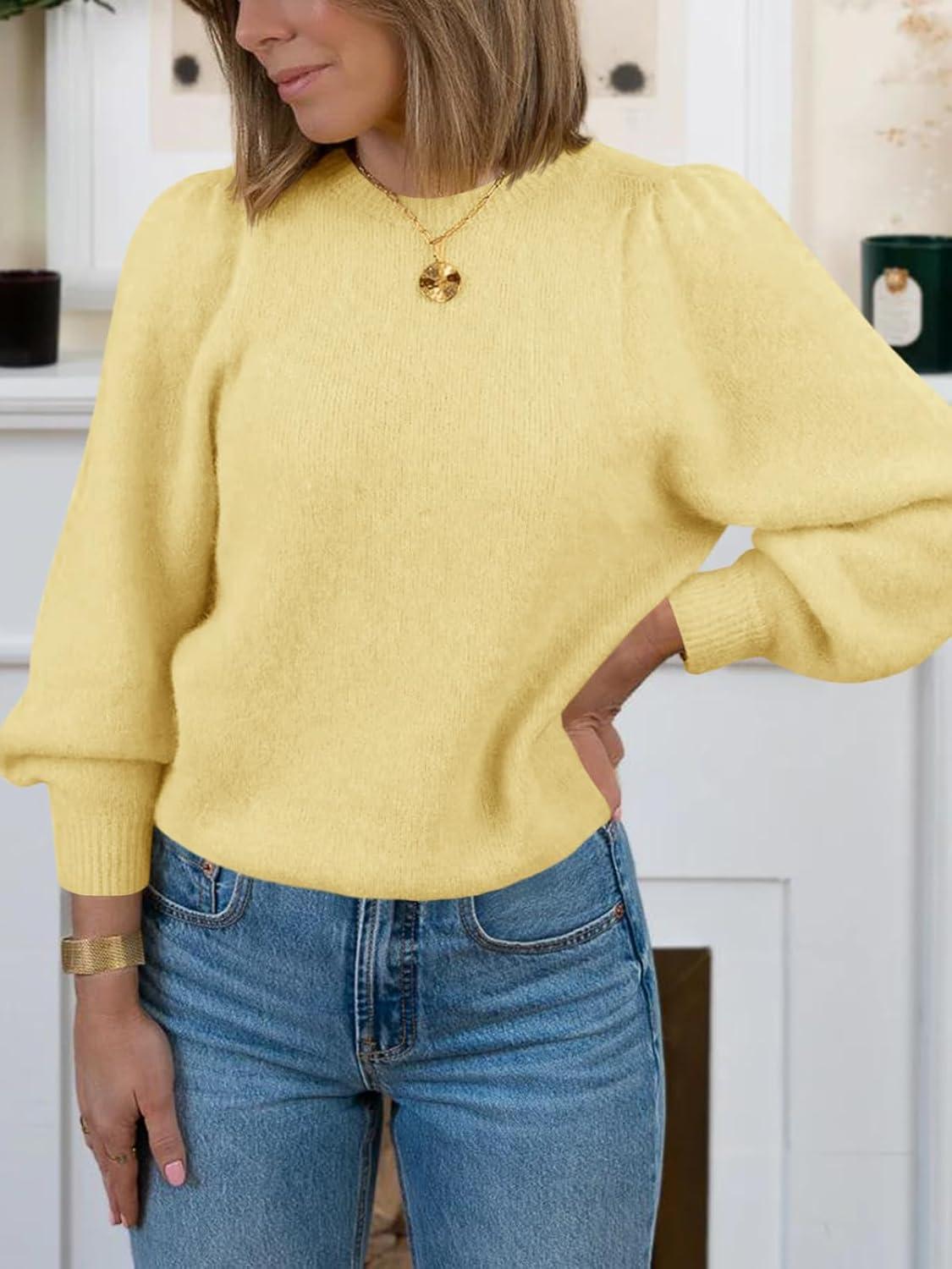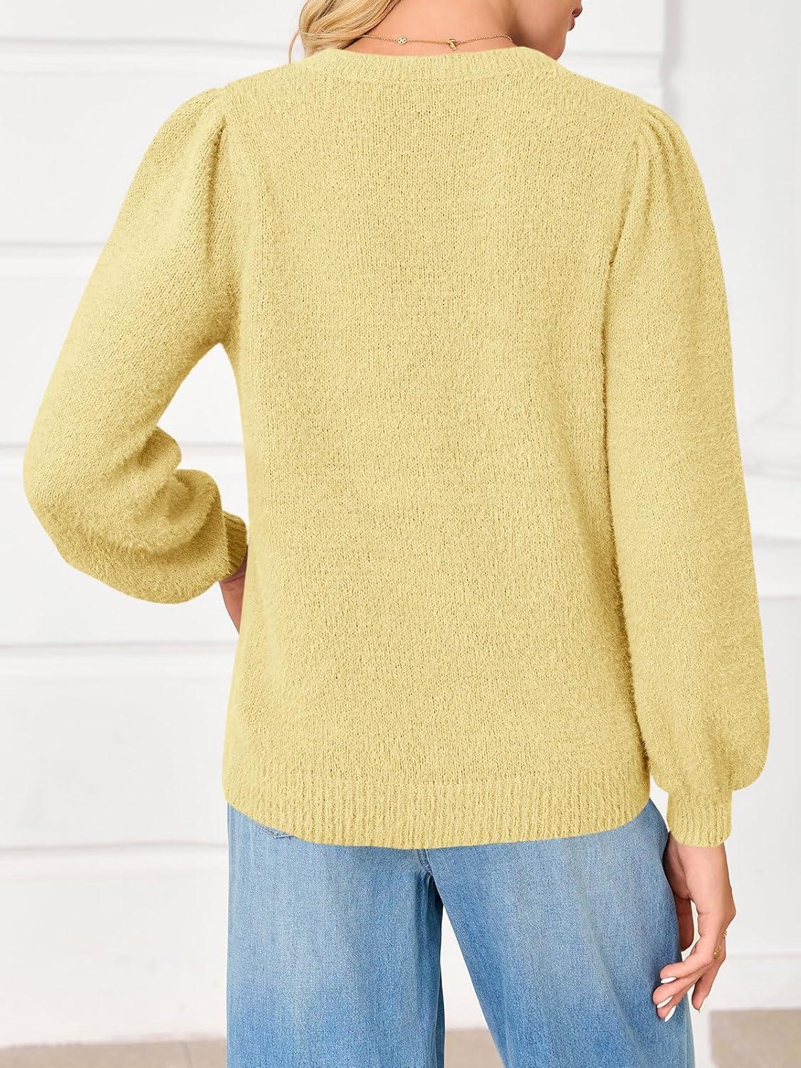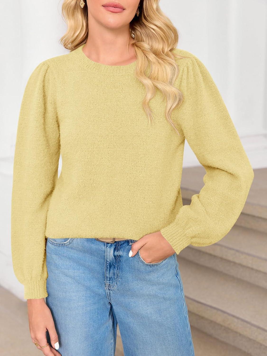 Saodimallsu Womens Puff Long Sleeve Sweaters Fall Crew Neck Cozy Soft Knit Loose Casual Pullover Tops(Yellow)