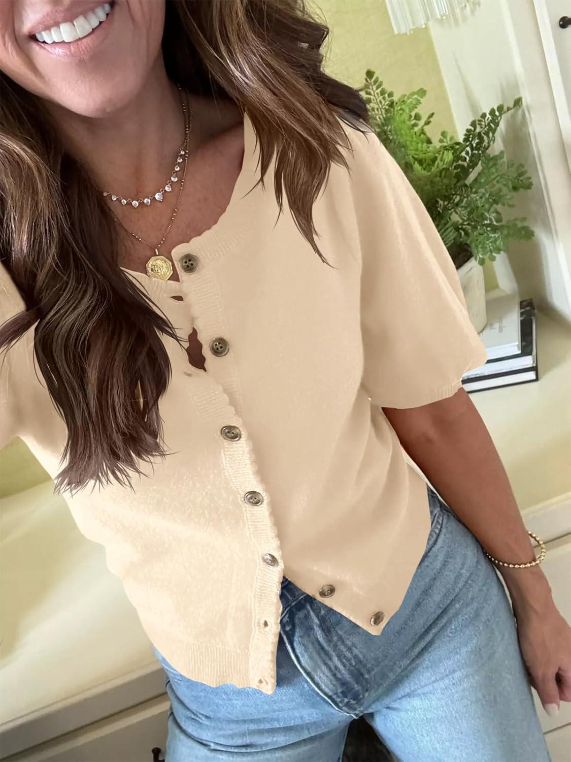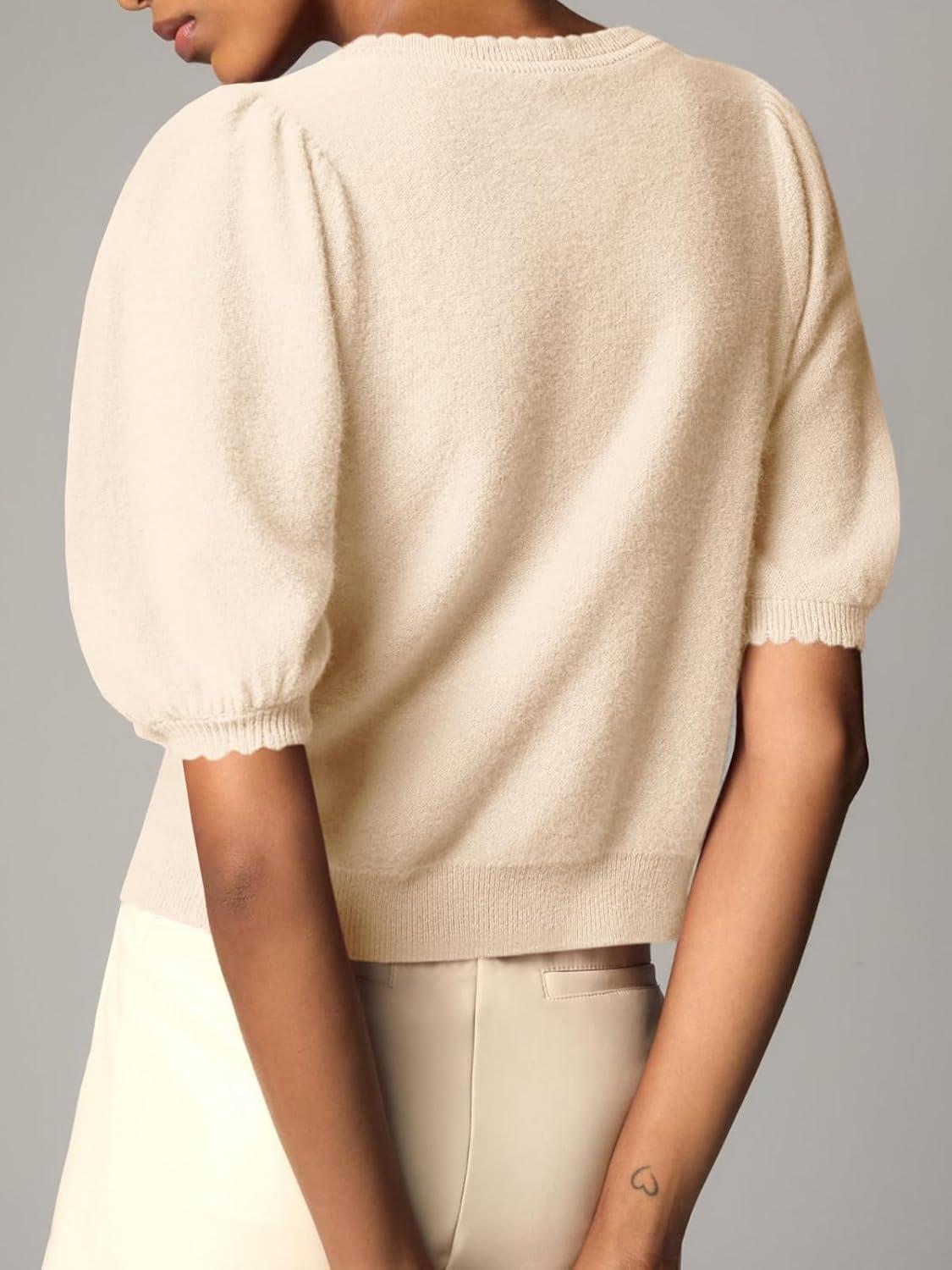 Saodimallsu Womens Puff Short Sleeve Cardigan Lightweight Summer Button Down Shirts Knit Crew Neck Sweater Tops(Apricot)