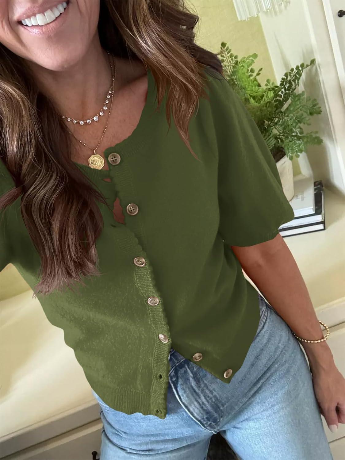 Saodimallsu Womens Puff Short Sleeve Cardigan Lightweight Summer Button Down Shirts Knit Crew Neck Sweater Tops(Army Green)