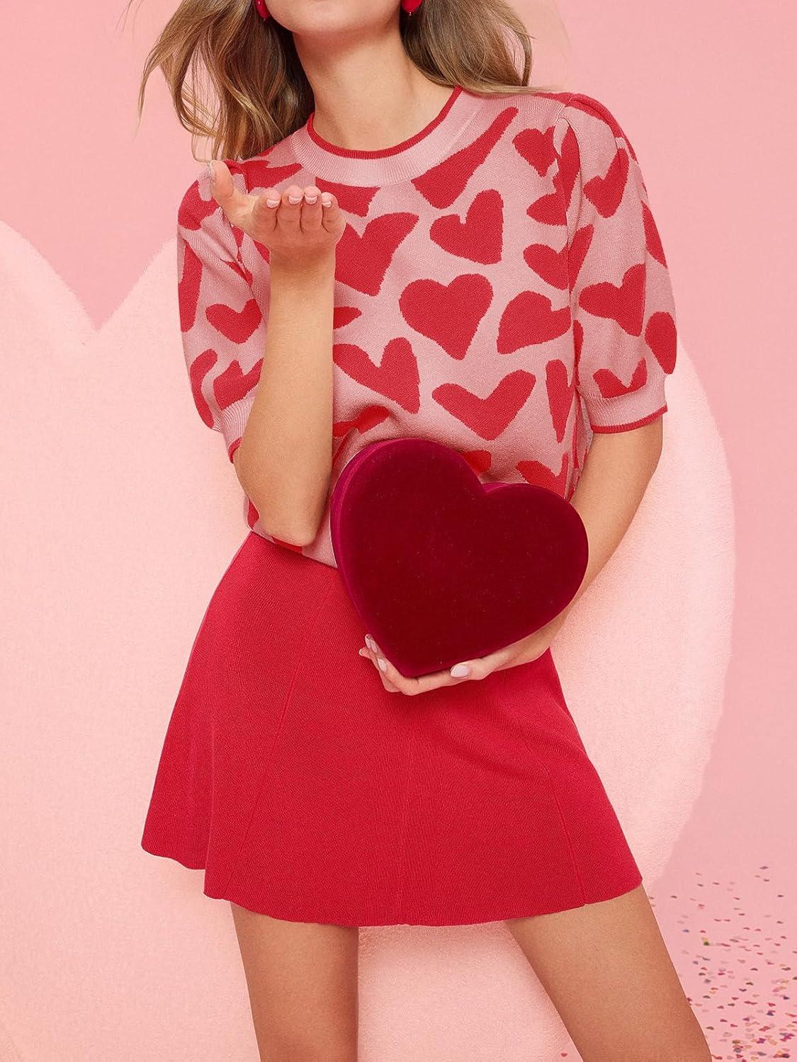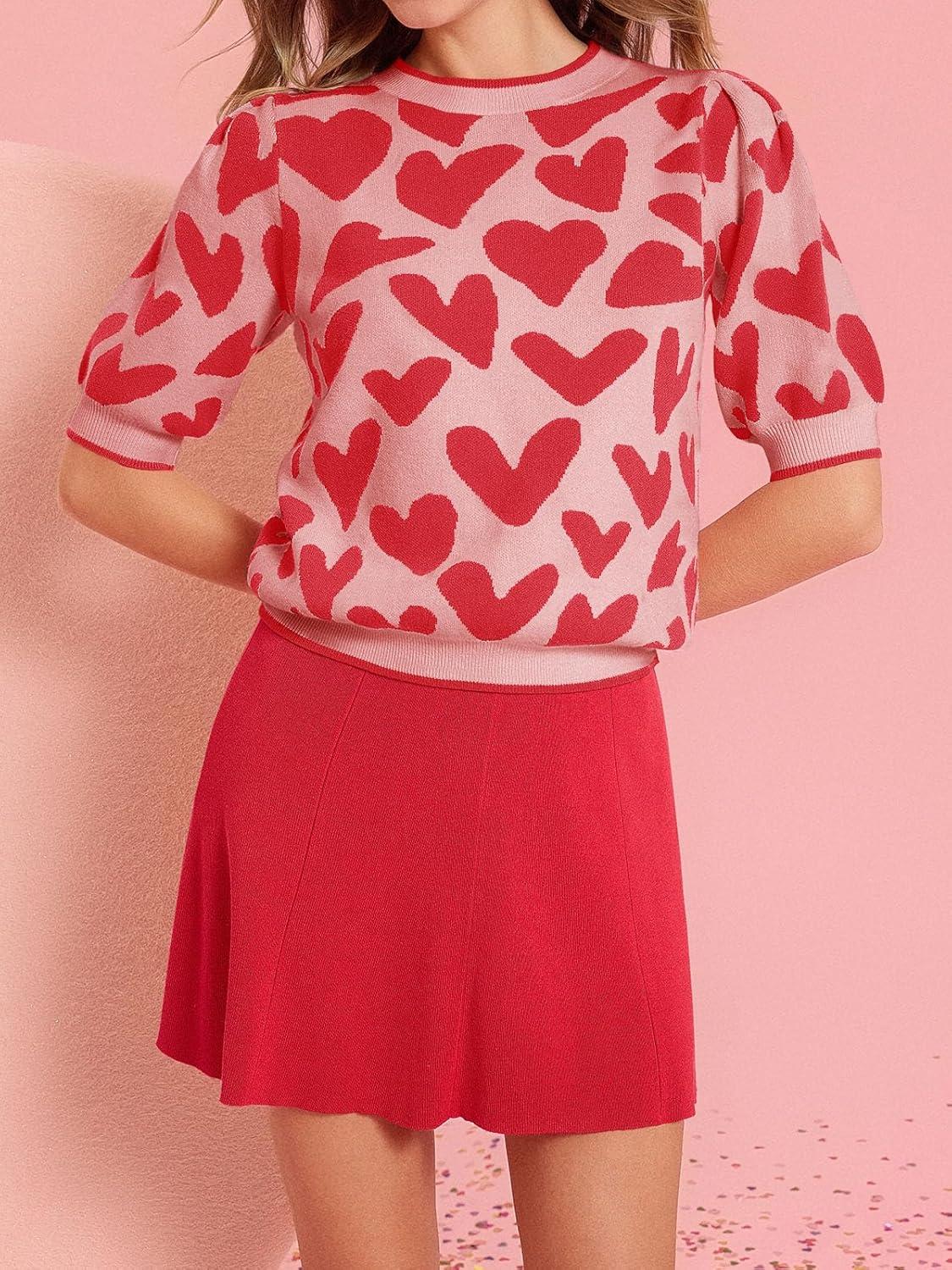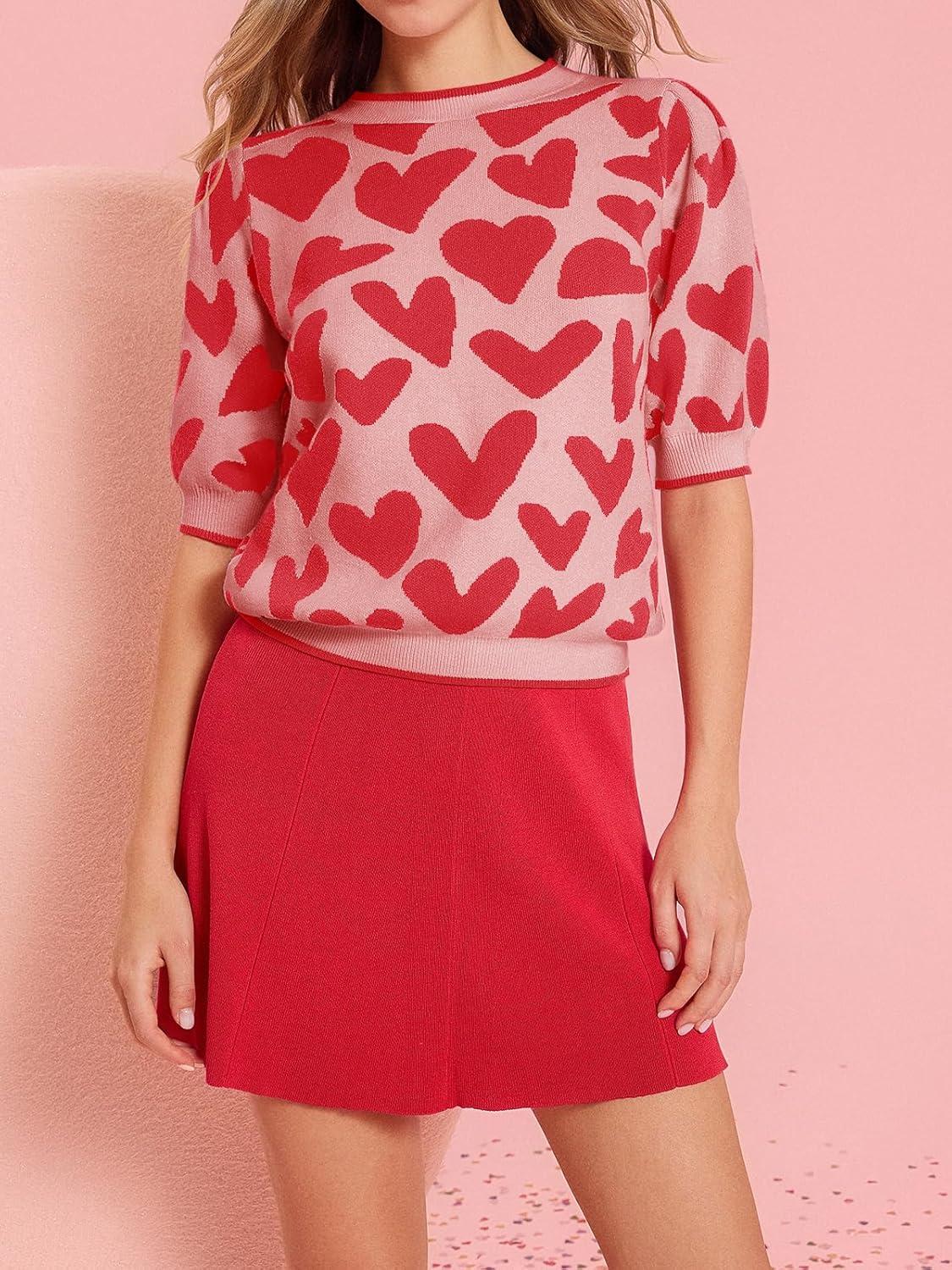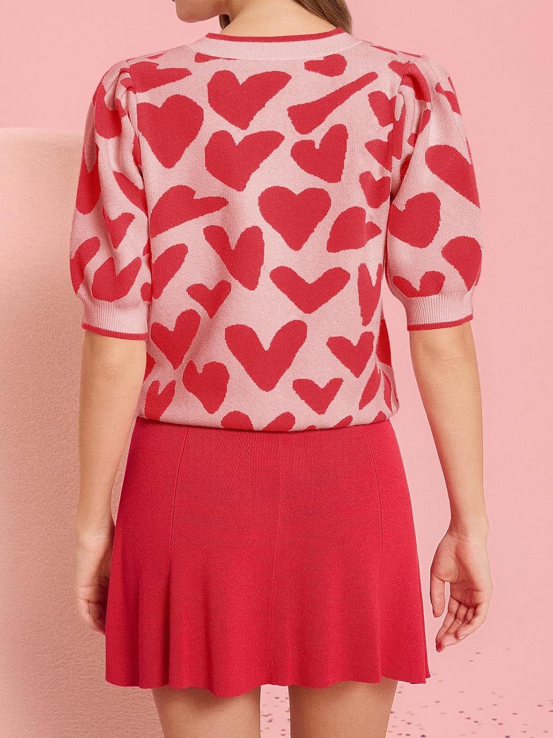 Saodimallsu Womens Puff Short Sleeve Heart Sweater Valentines Crew Neck Graphic Knit Pullover Crop Tops(Light Red)
