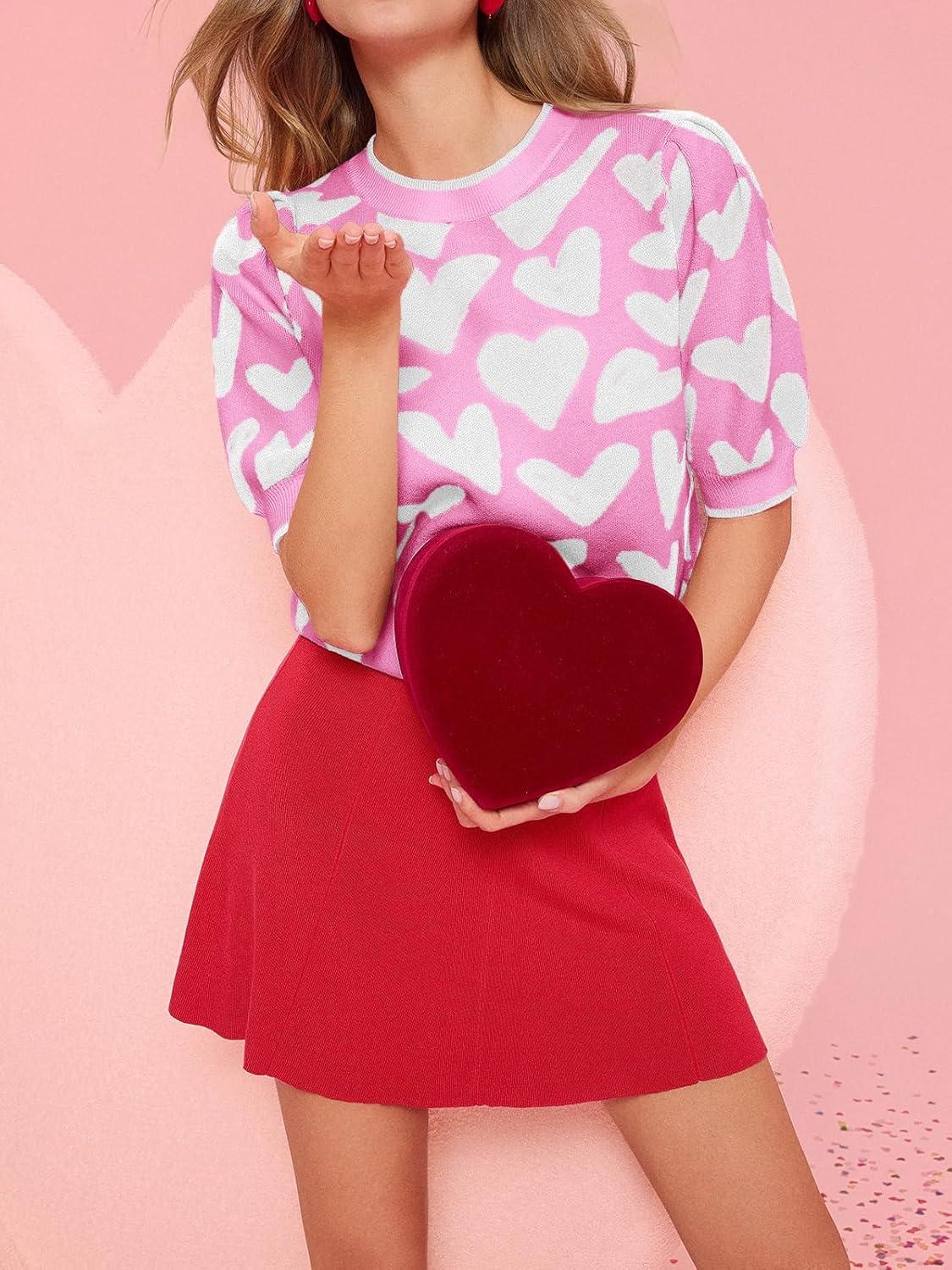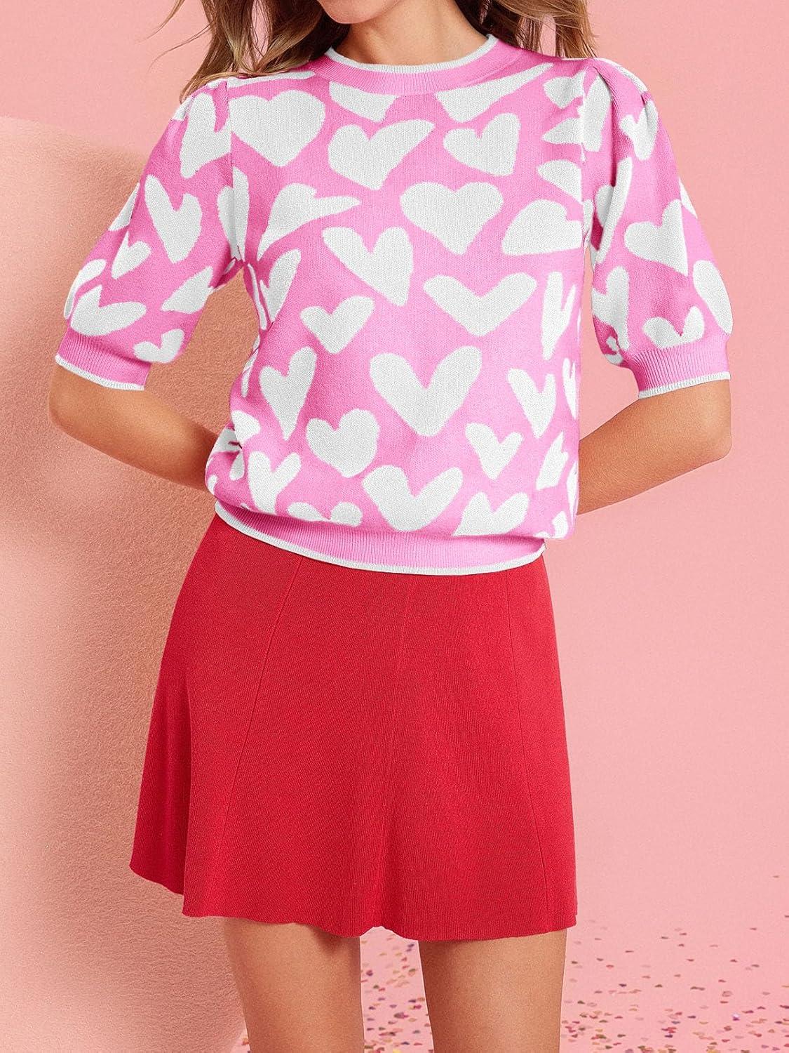 Saodimallsu Womens Puff Short Sleeve Heart Sweater Valentines Crew Neck Graphic Knit Pullover Crop Tops(Rose Red)