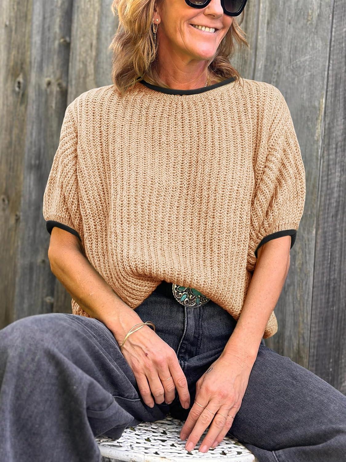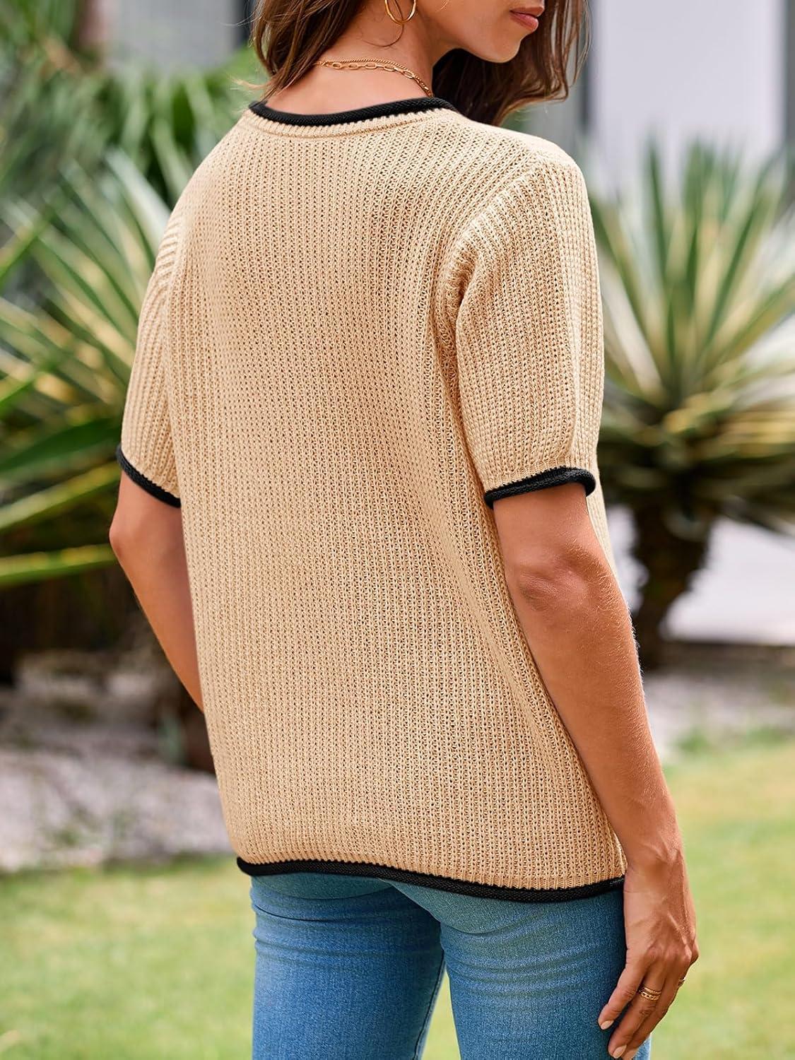 Saodimallsu Womens Puff Short Sleeve Sweater Tops Spring Summer Color Block Ribbed Knit Crew Neck Going Out Shirts(Apricot)