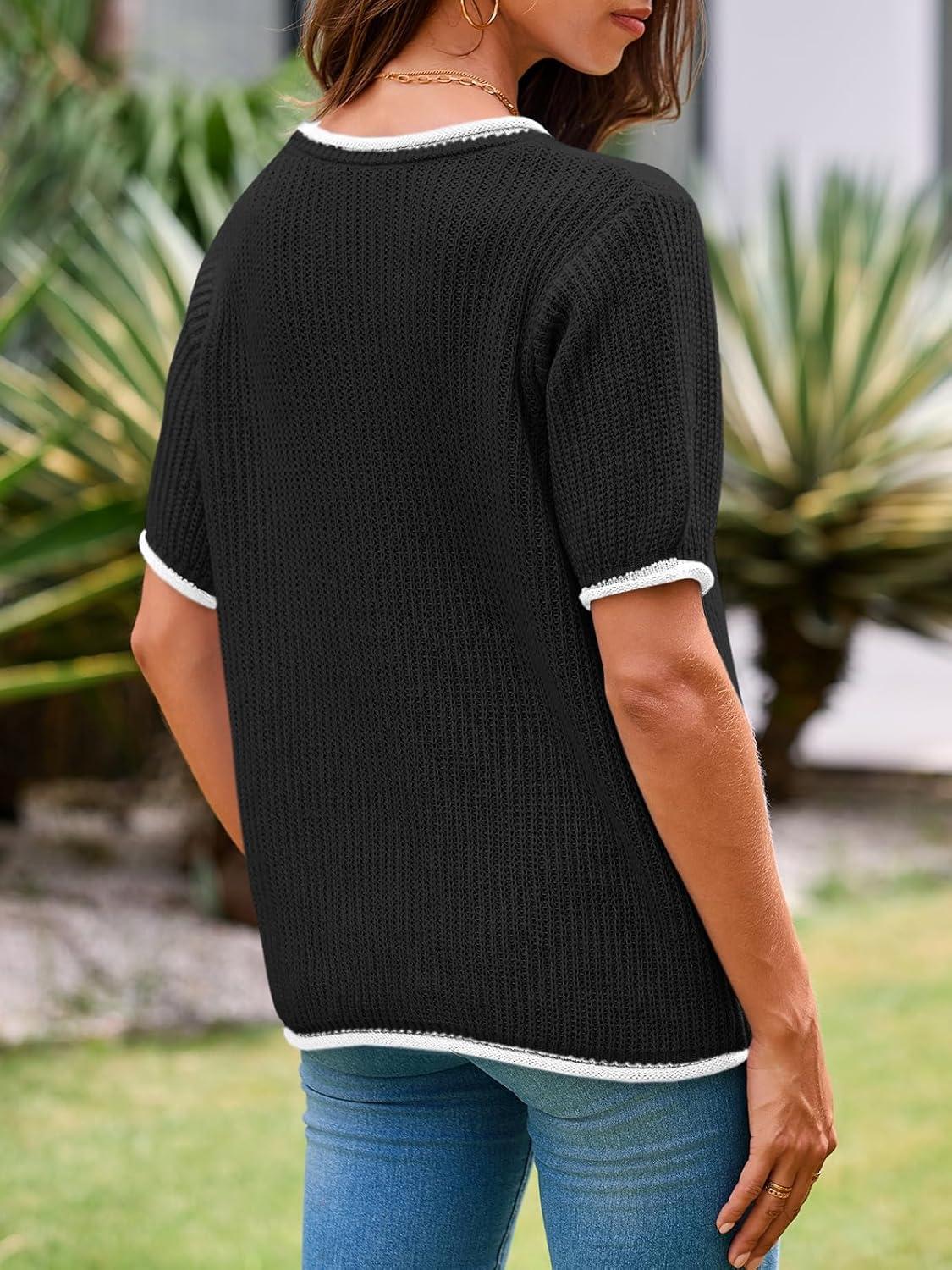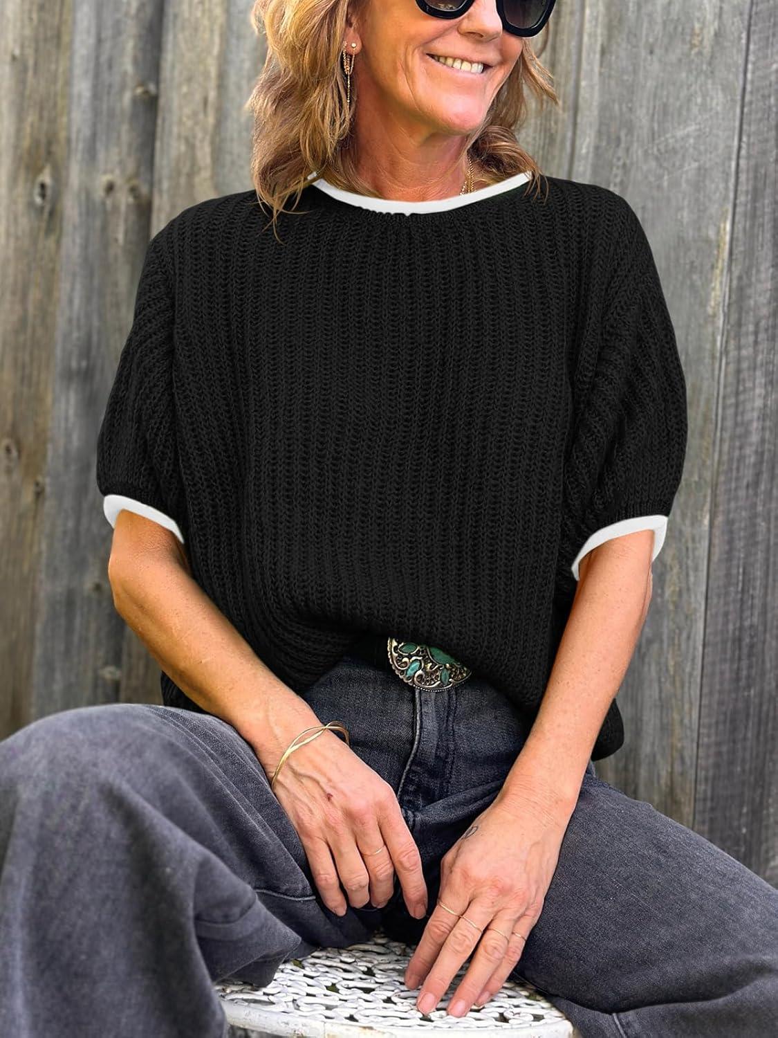 Saodimallsu Womens Puff Short Sleeve Sweater Tops Spring Summer Color Block Ribbed Knit Crew Neck Going Out Shirts(Black)