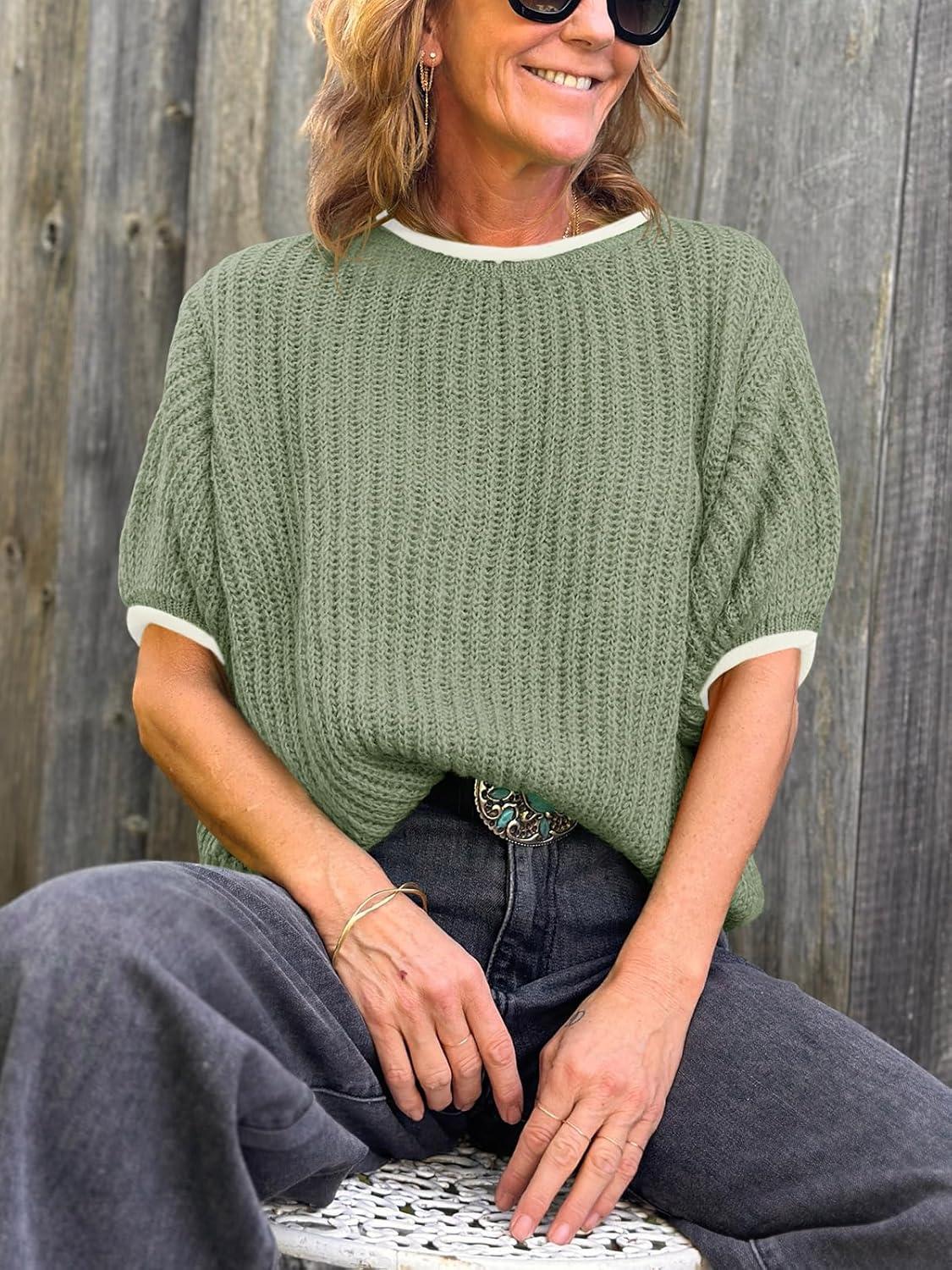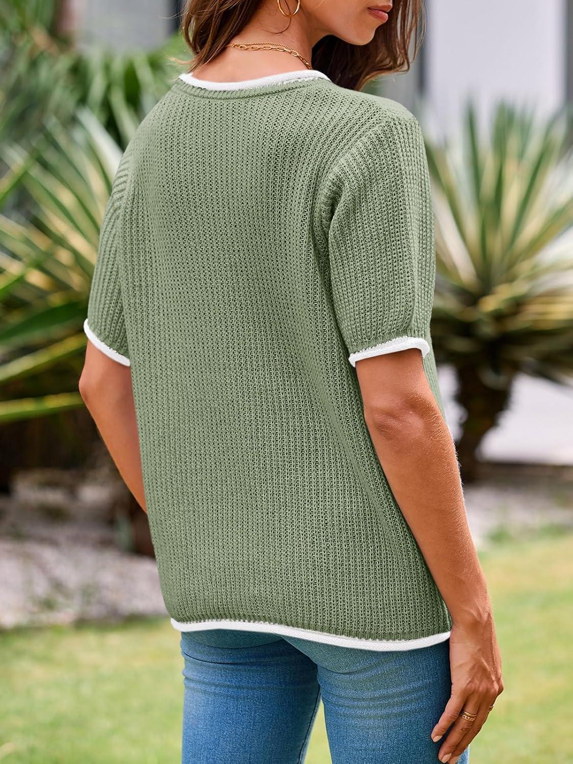 Saodimallsu Womens Puff Short Sleeve Sweater Tops Spring Summer Color Block Ribbed Knit Crew Neck Going Out Shirts(Pea Green)