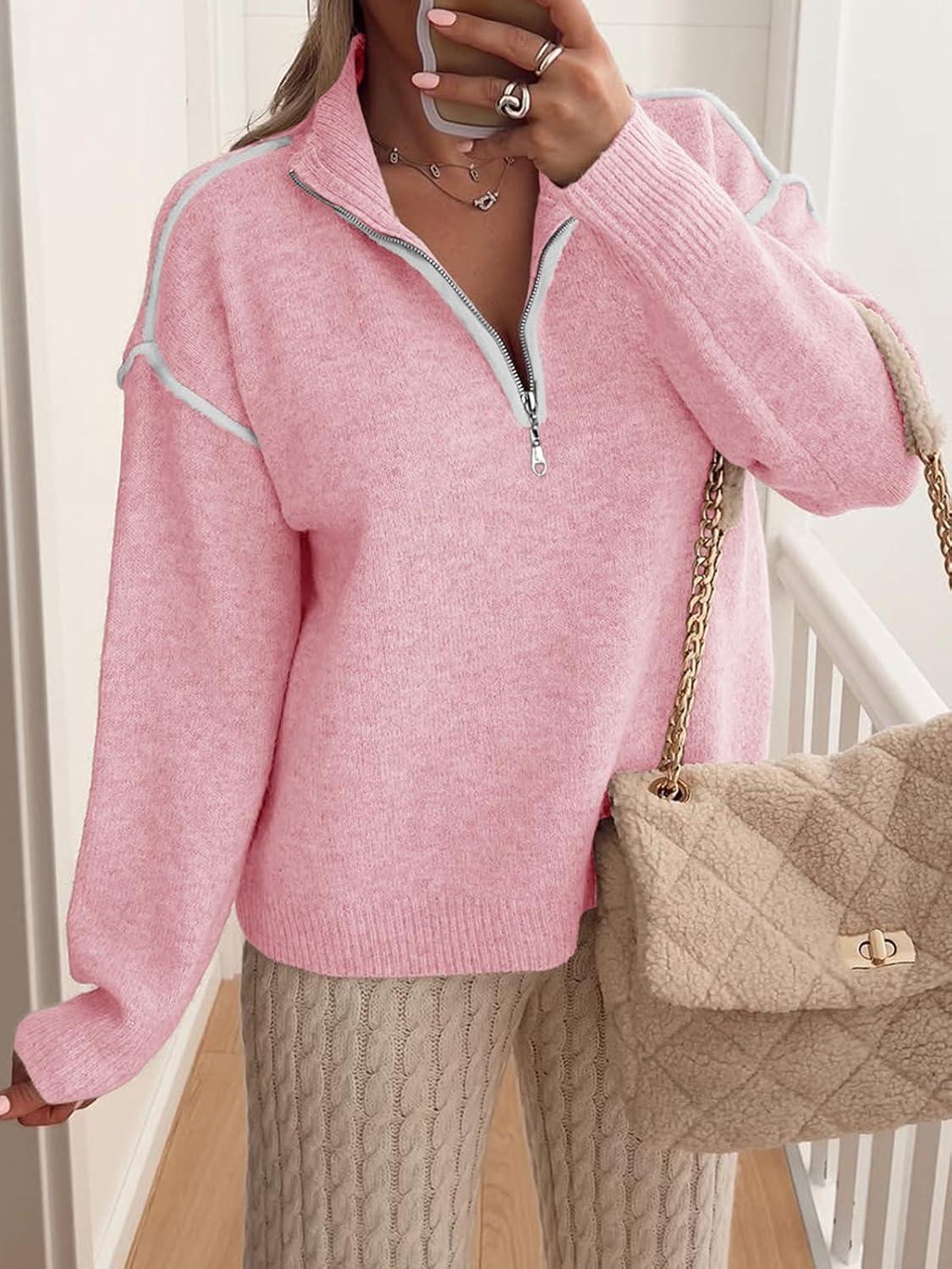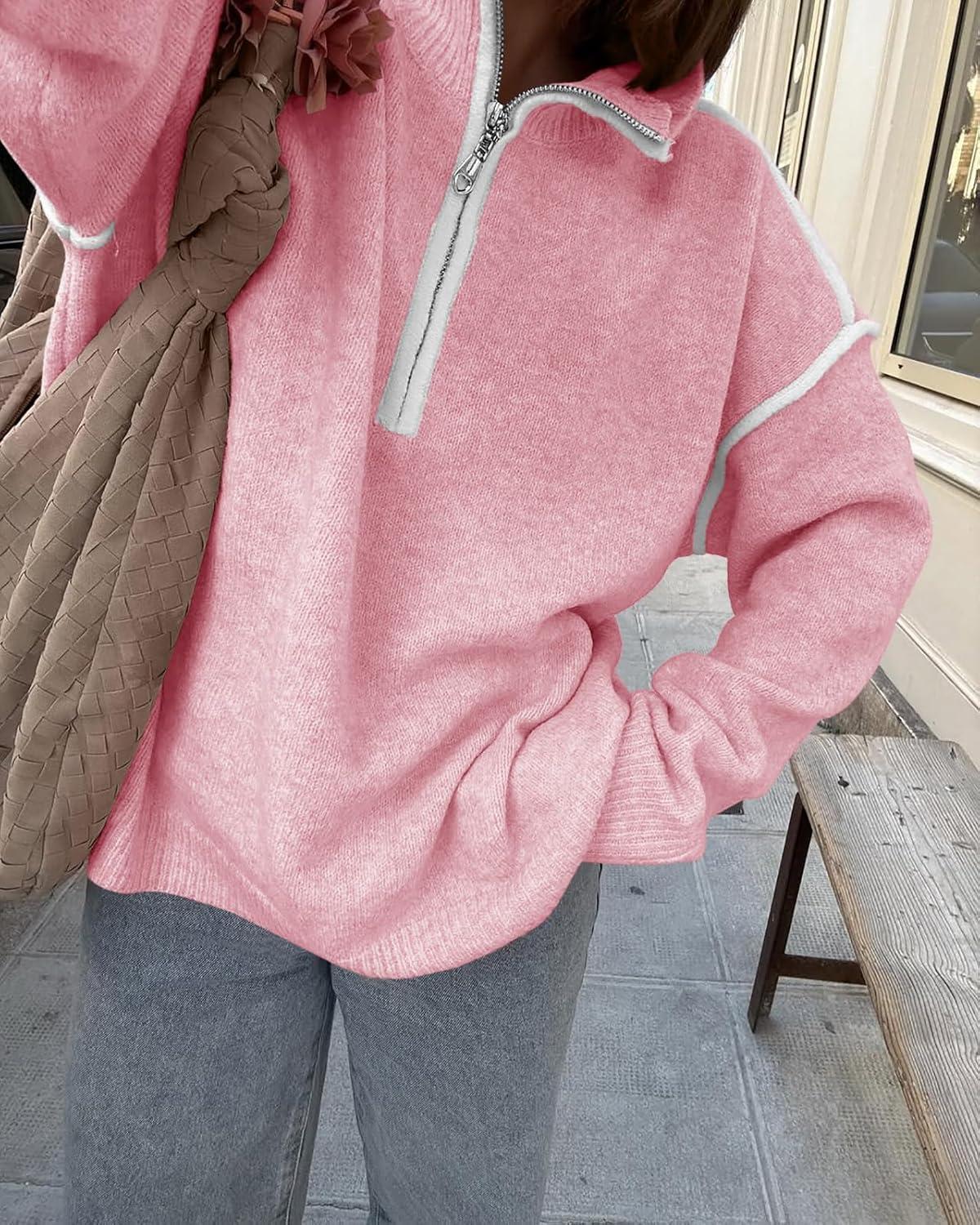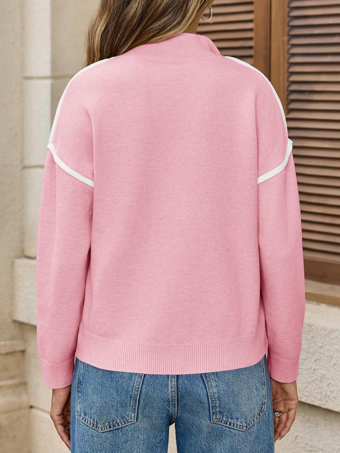 Saodimallsu Womens Quarter Zip Pullover Sweaters Casual Collared V Neck Color Block Long Sleeve Loose Knit Fall Sweater(Pink)
