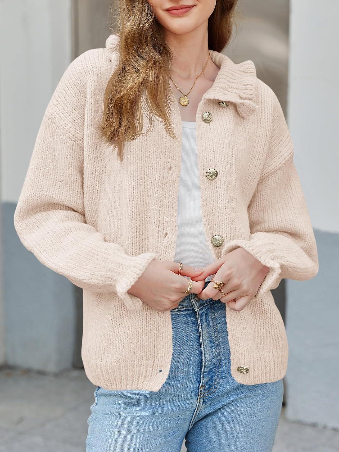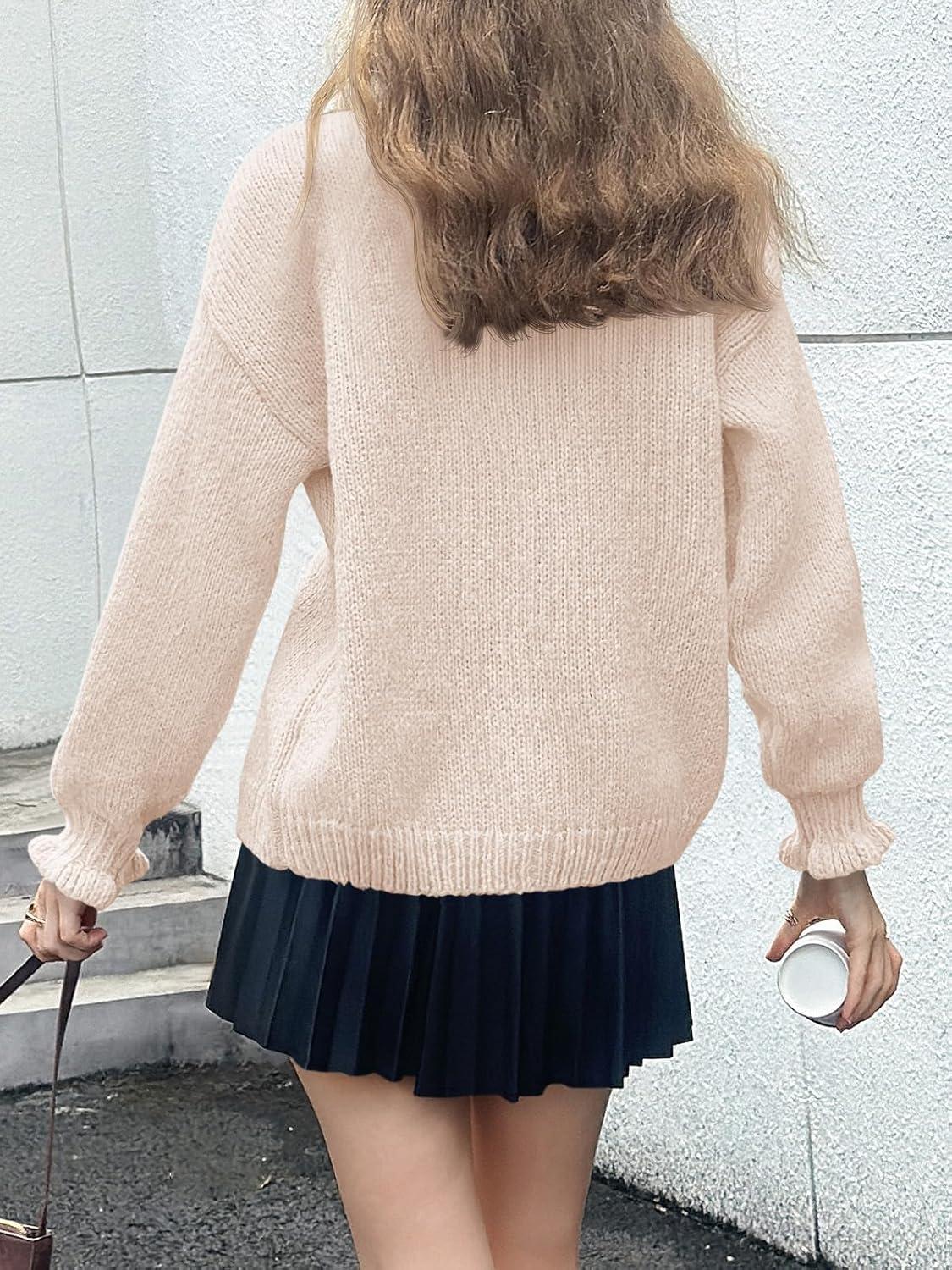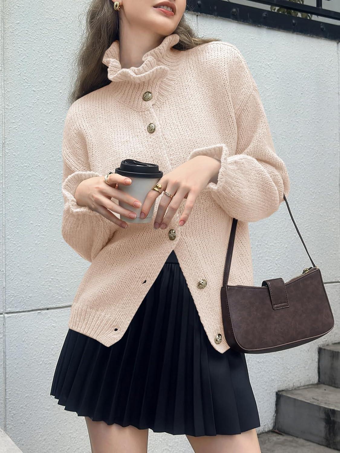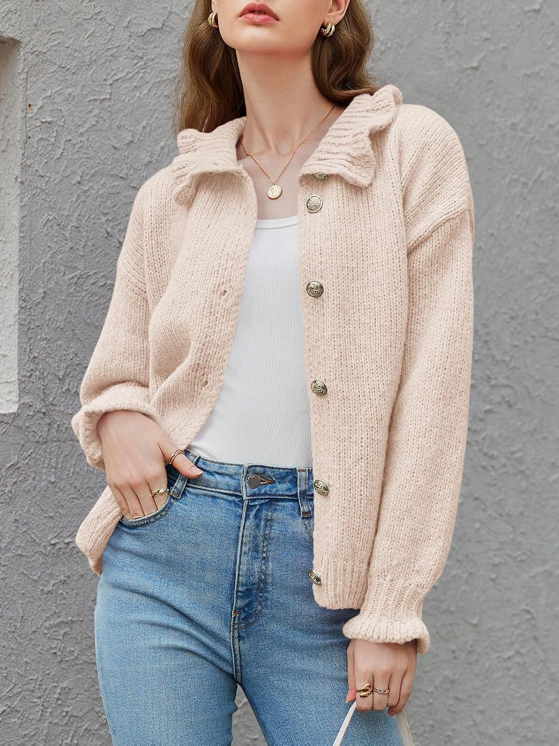 Saodimallsu Womens Ruffle Cardigan Oversized Button Up Fall Trendy Ribbed Knit Open Front Long Sleeve Loose Cute Sweater(Apricot)