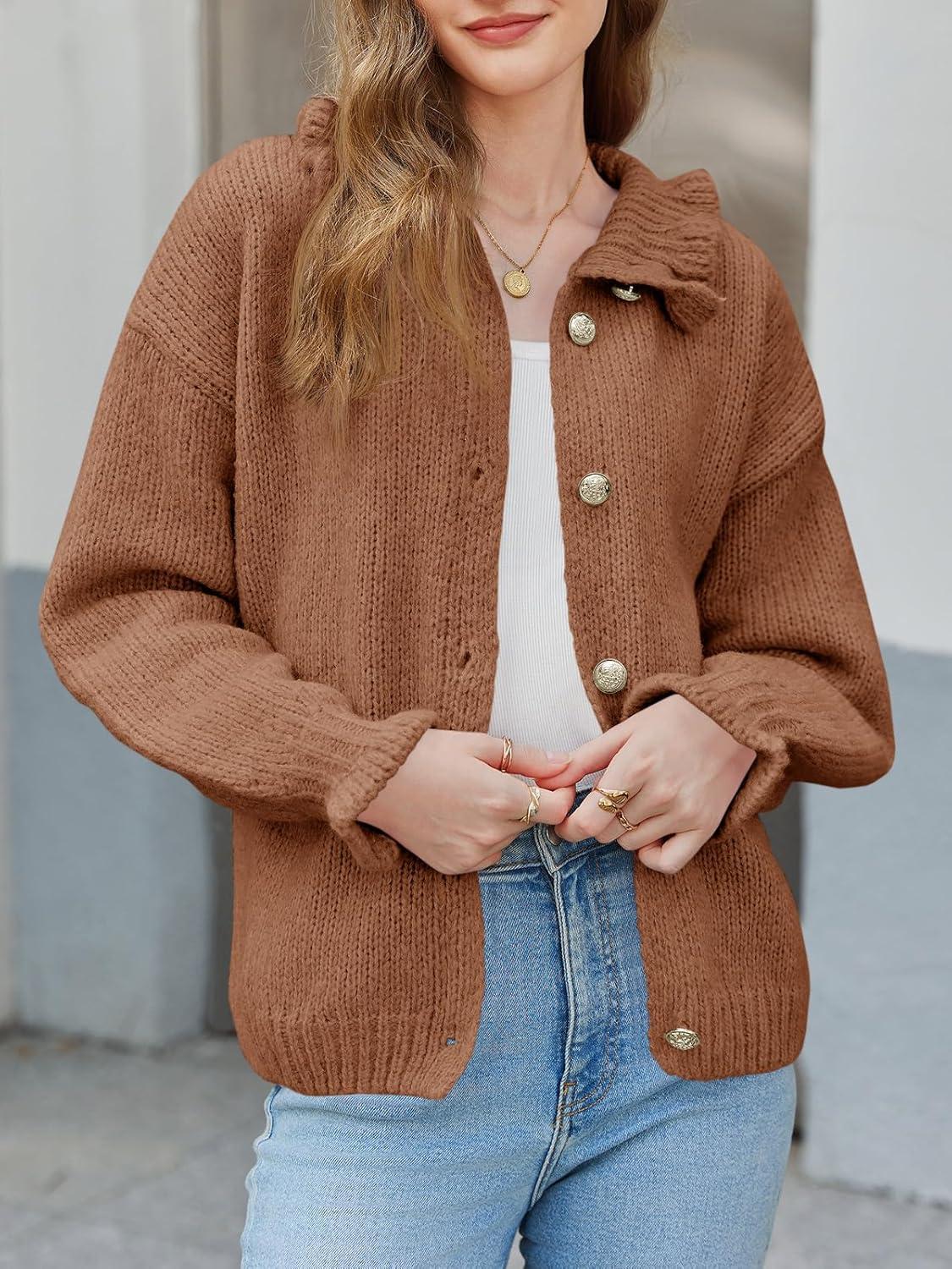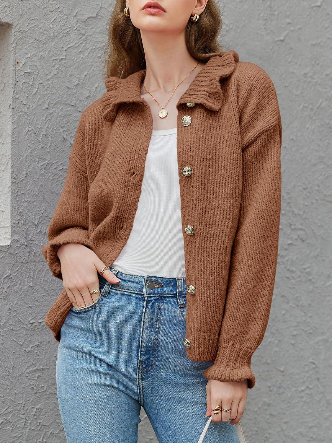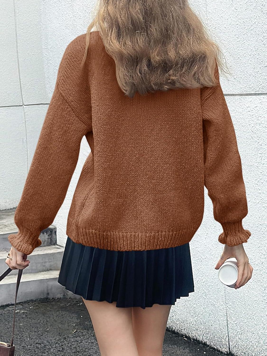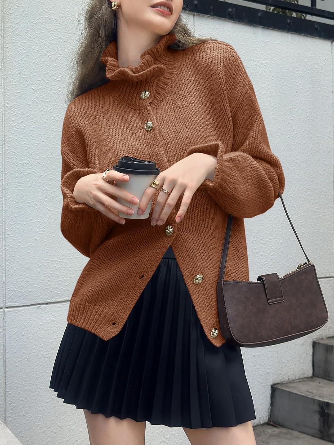 Saodimallsu Womens Ruffle Cardigan Oversized Button Up Fall Trendy Ribbed Knit Open Front Long Sleeve Loose Cute Sweater(Brown)