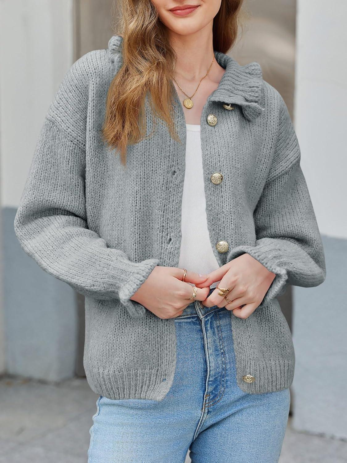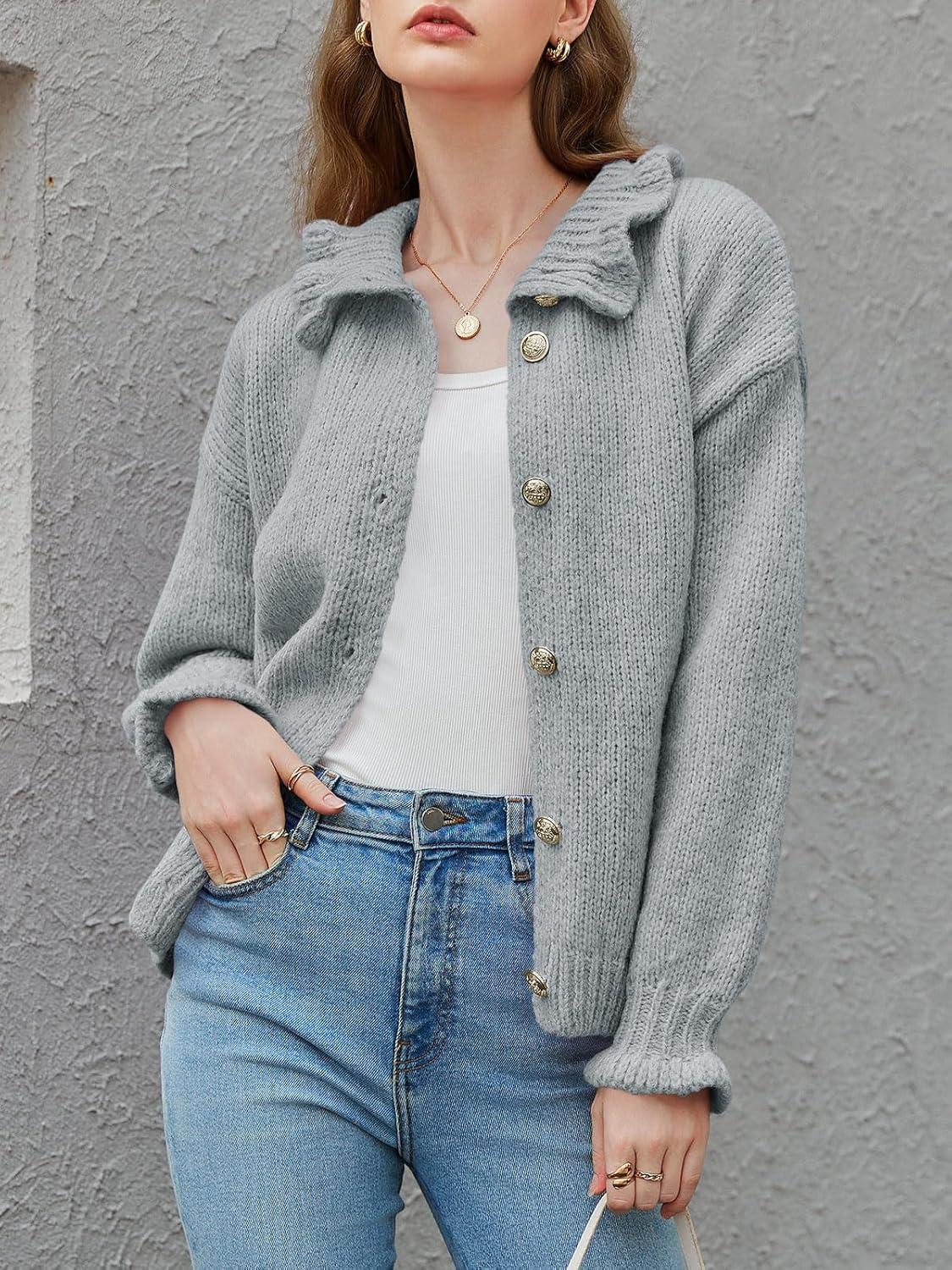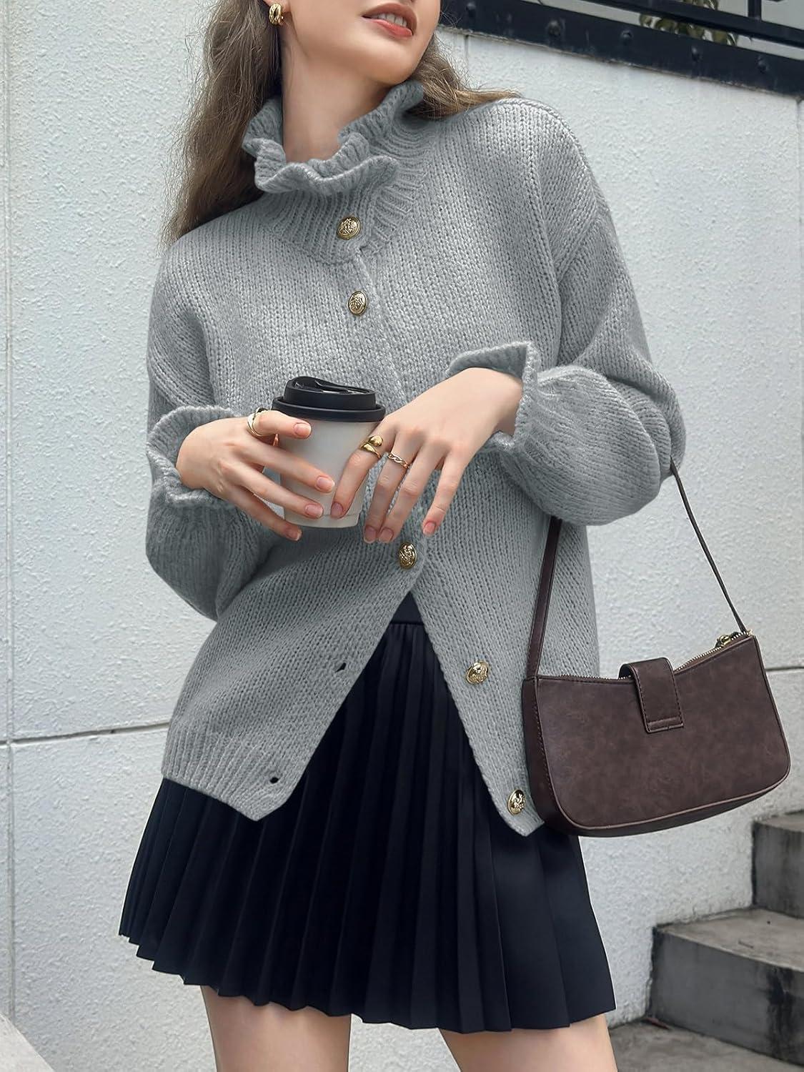 Saodimallsu Womens Ruffle Cardigan Oversized Button Up Fall Trendy Ribbed Knit Open Front Long Sleeve Loose Cute Sweater(Grey)
