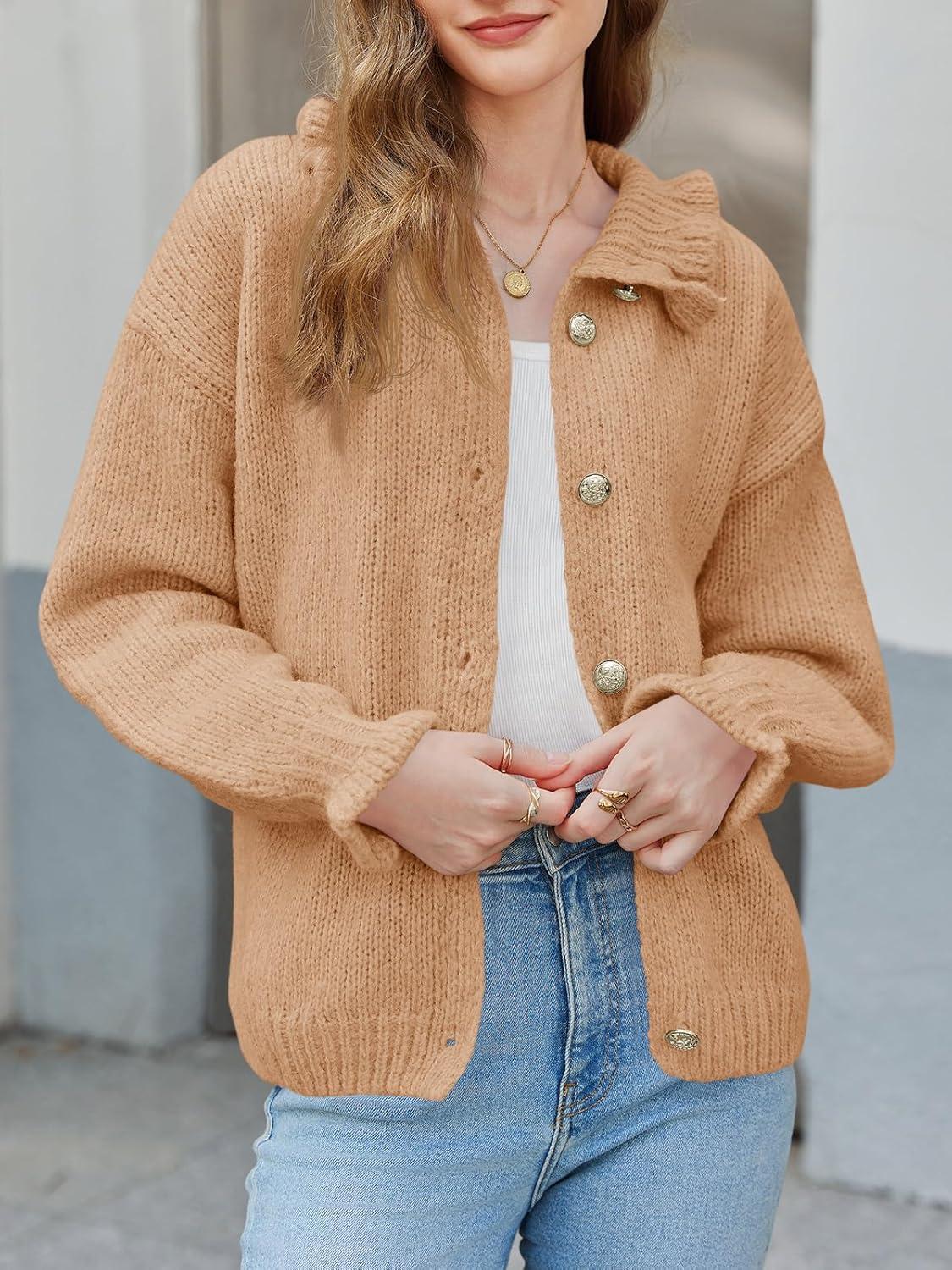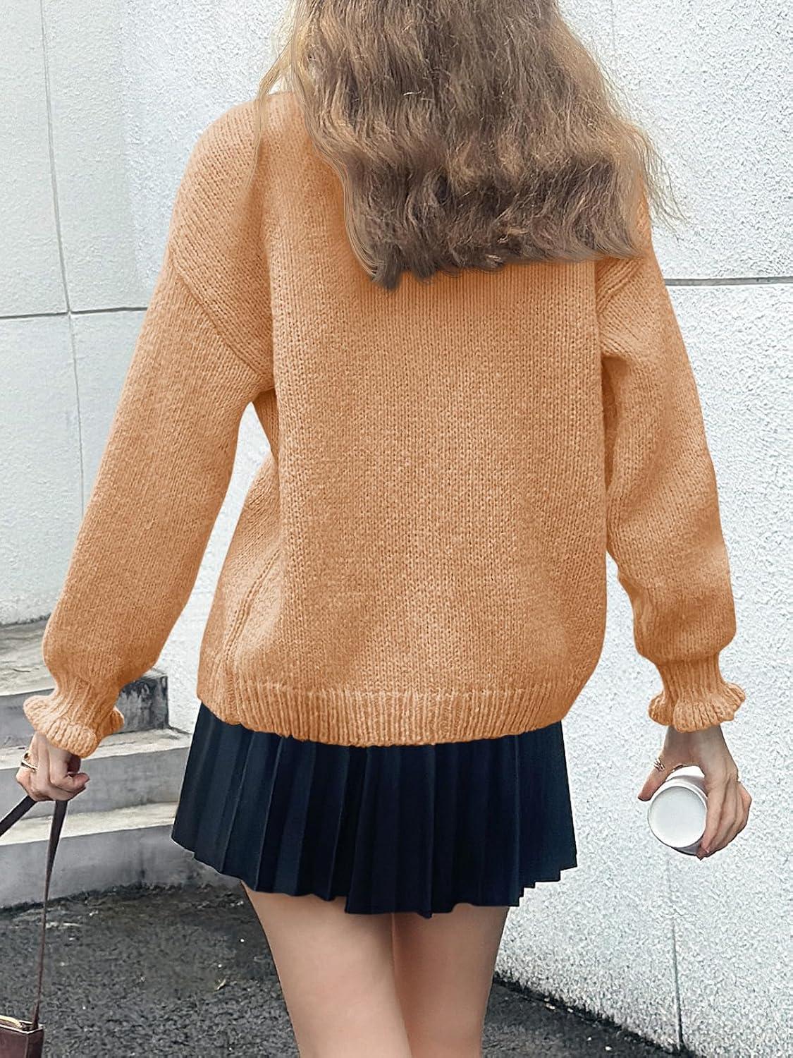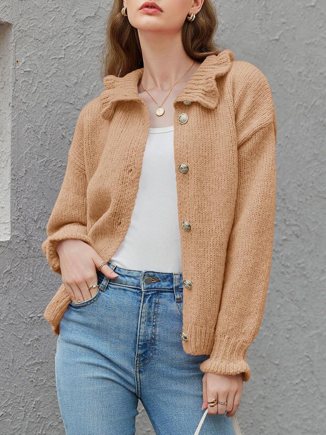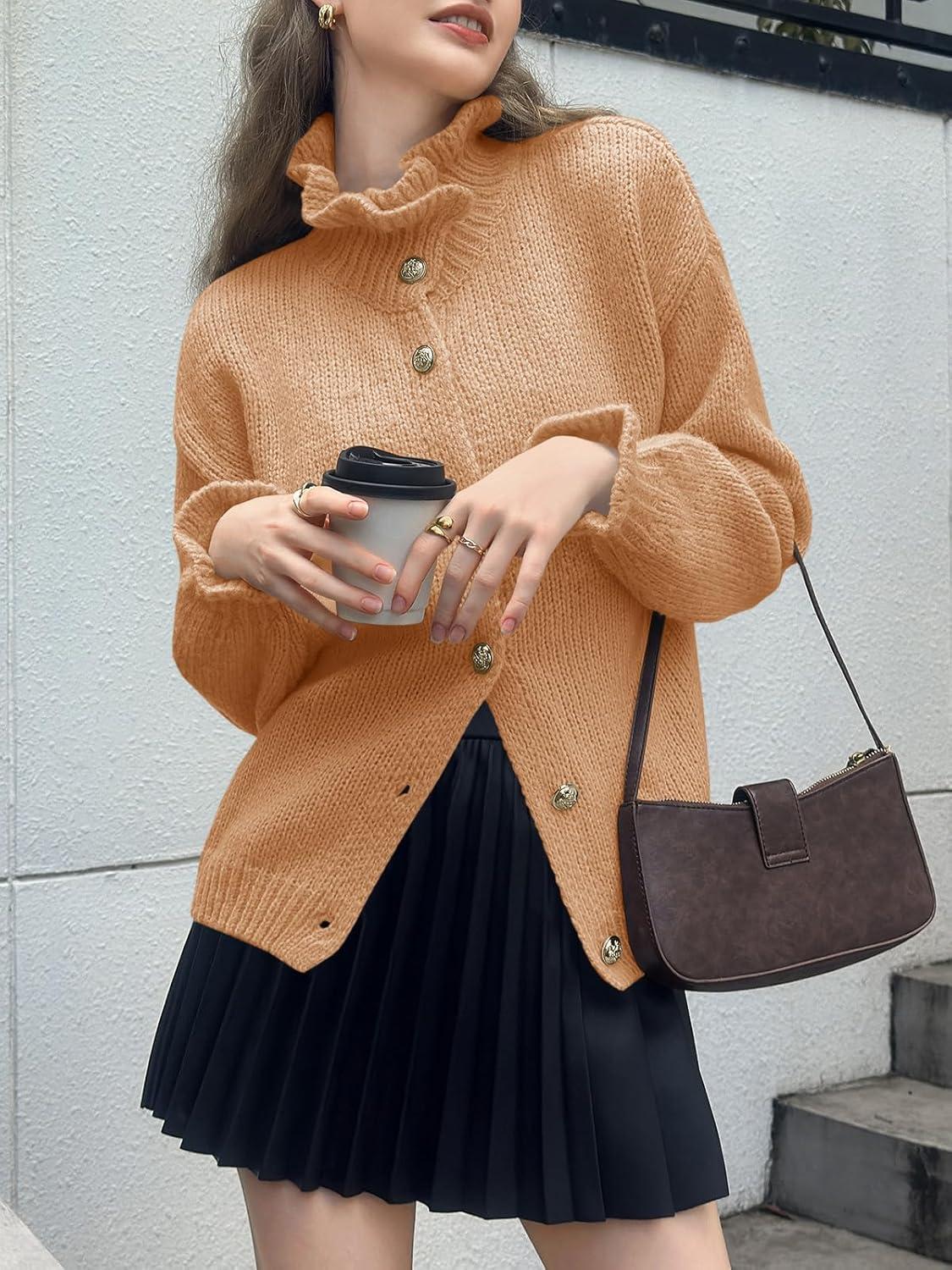 Saodimallsu Womens Ruffle Cardigan Oversized Button Up Fall Trendy Ribbed Knit Open Front Long Sleeve Loose Cute Sweater(Khaki)