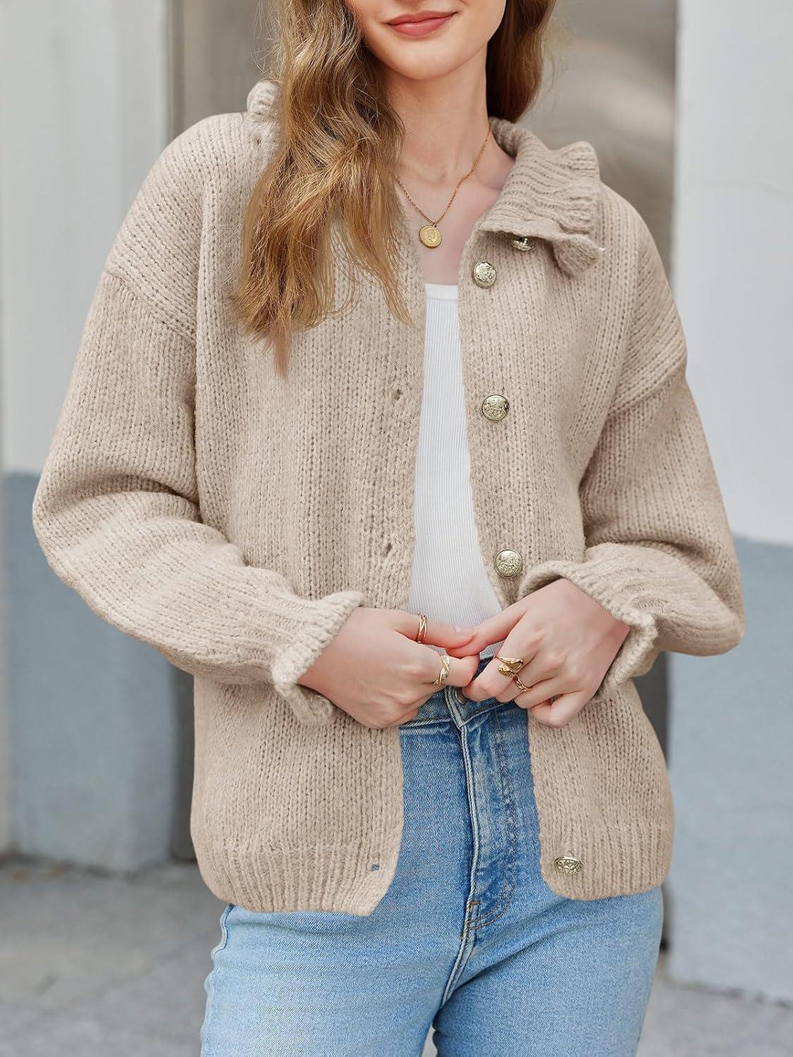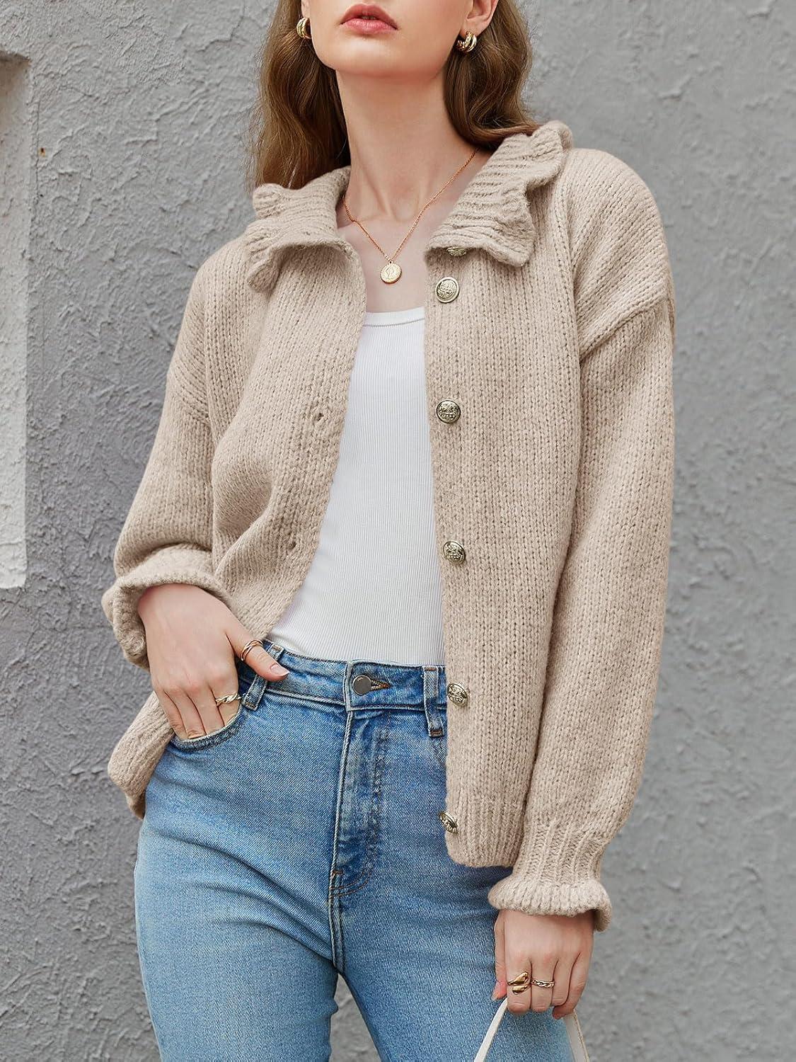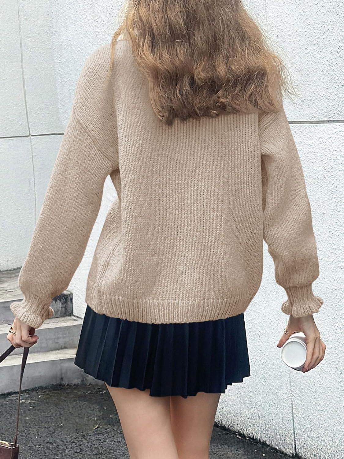Saodimallsu Womens Ruffle Cardigan Oversized Button Up Fall Trendy Ribbed Knit Open Front Long Sleeve Loose Cute Sweater(Light Khaki)