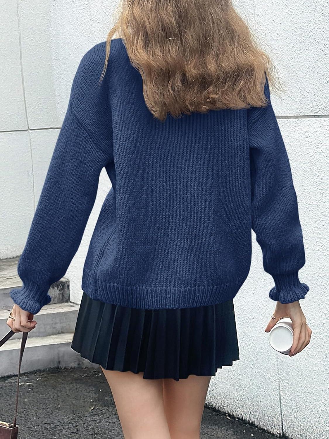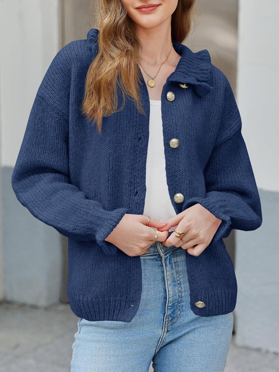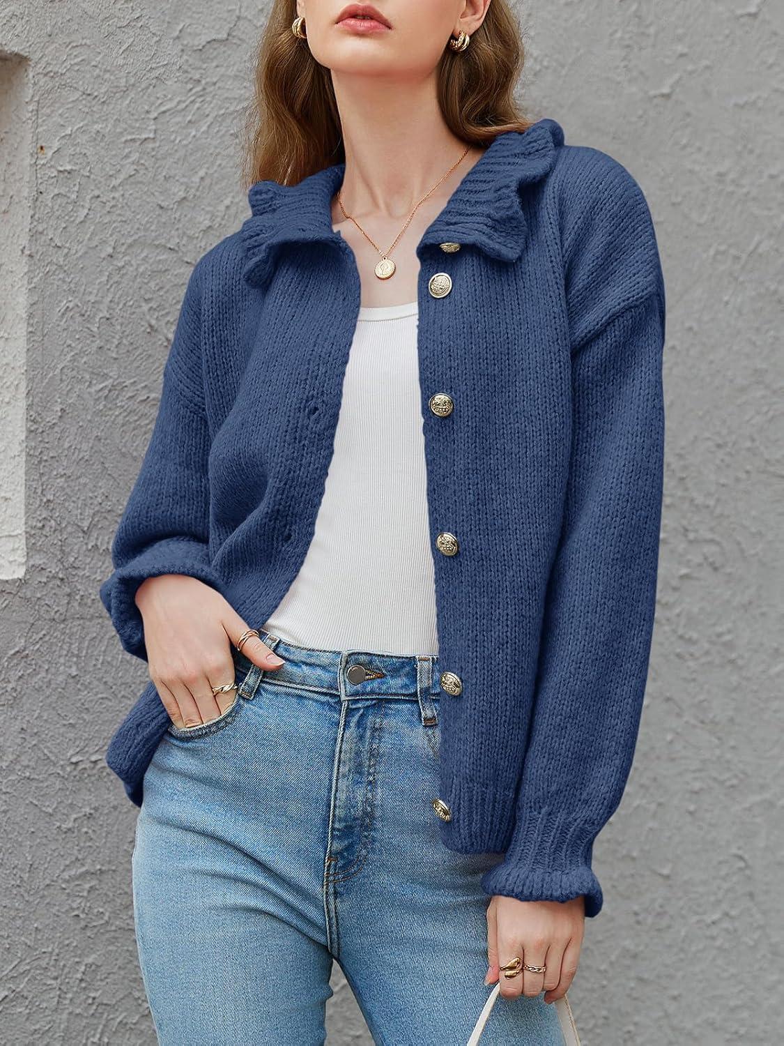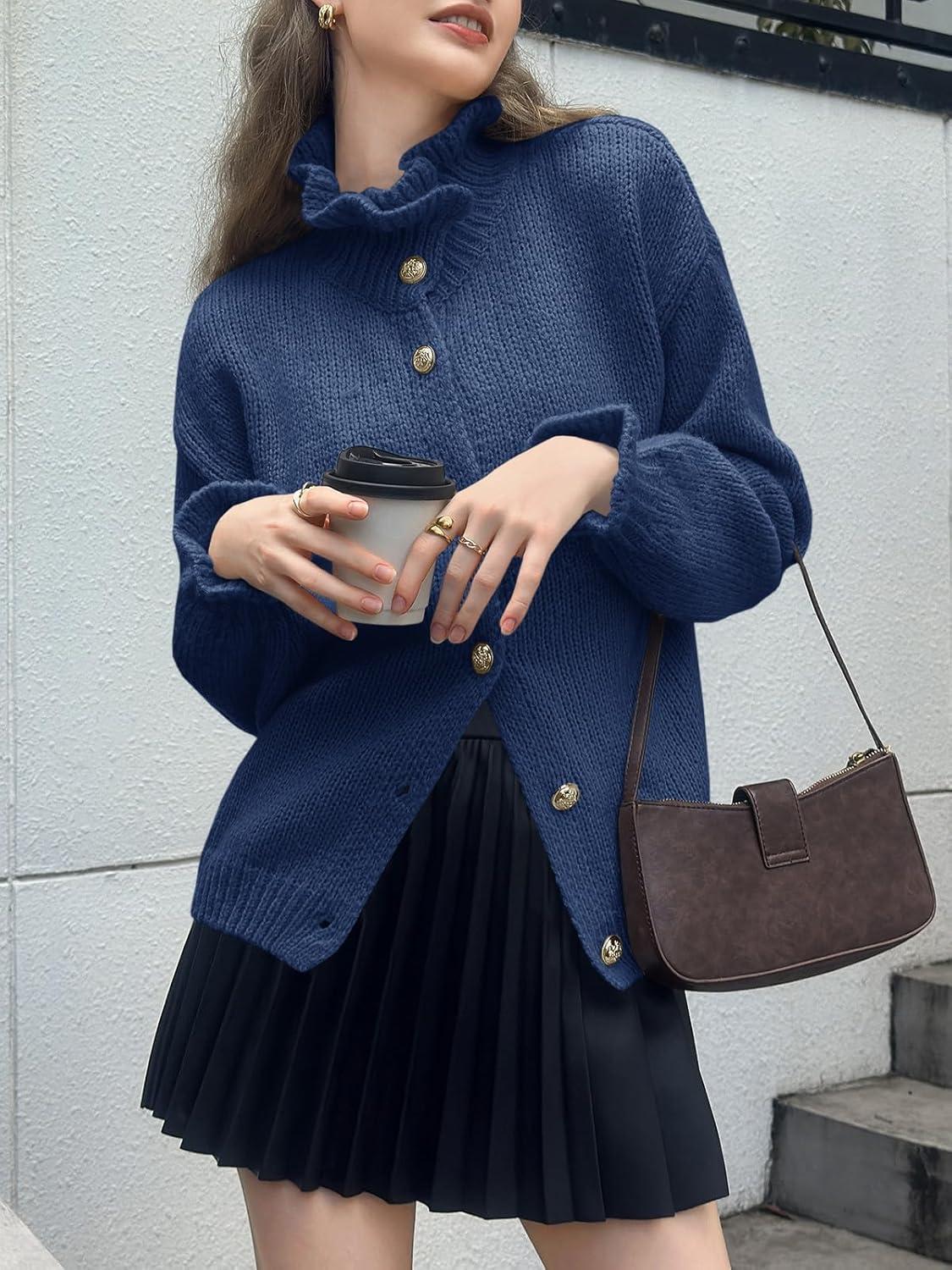 Saodimallsu Womens Ruffle Cardigan Oversized Button Up Fall Trendy Ribbed Knit Open Front Long Sleeve Loose Cute Sweater(Navy)