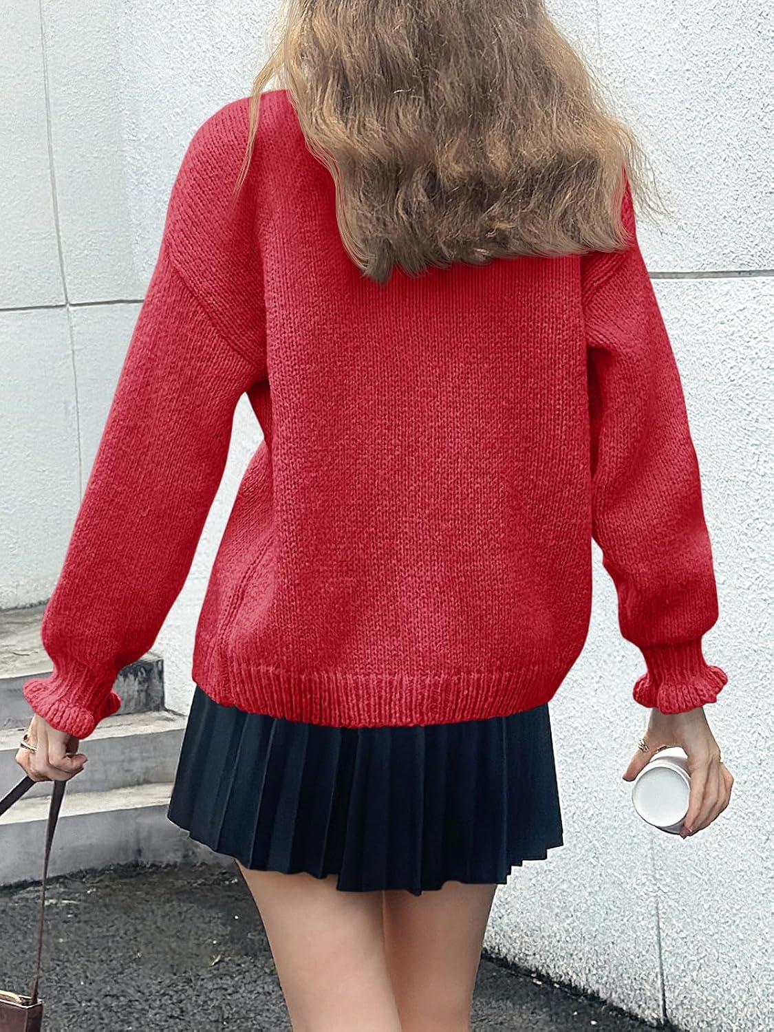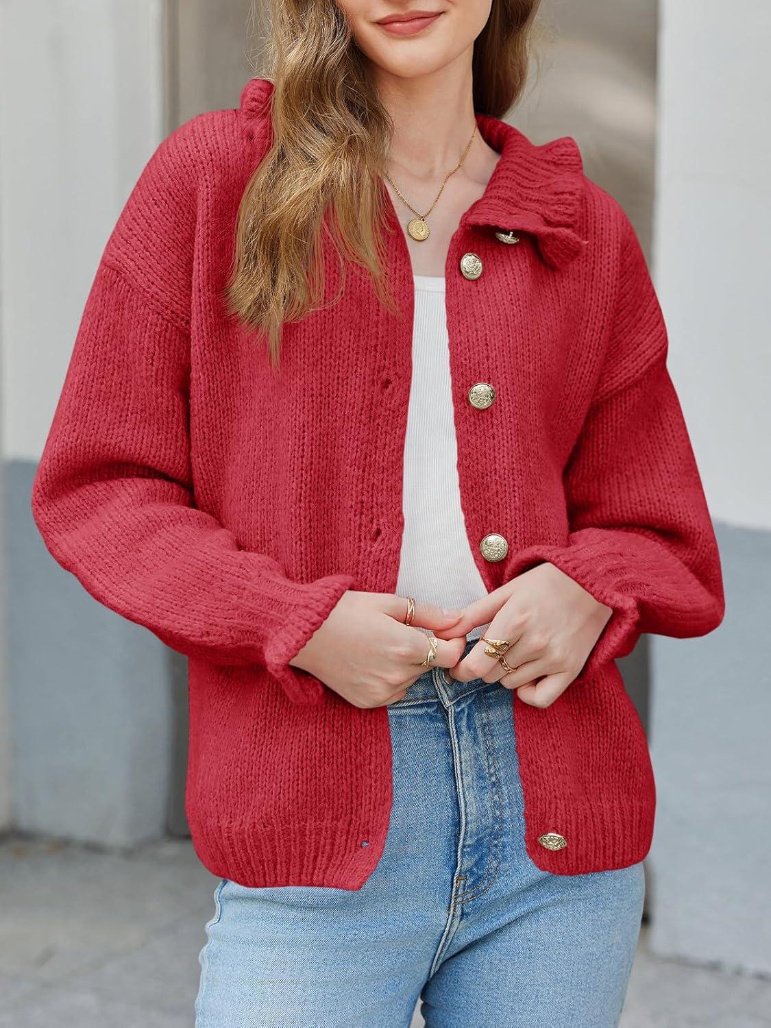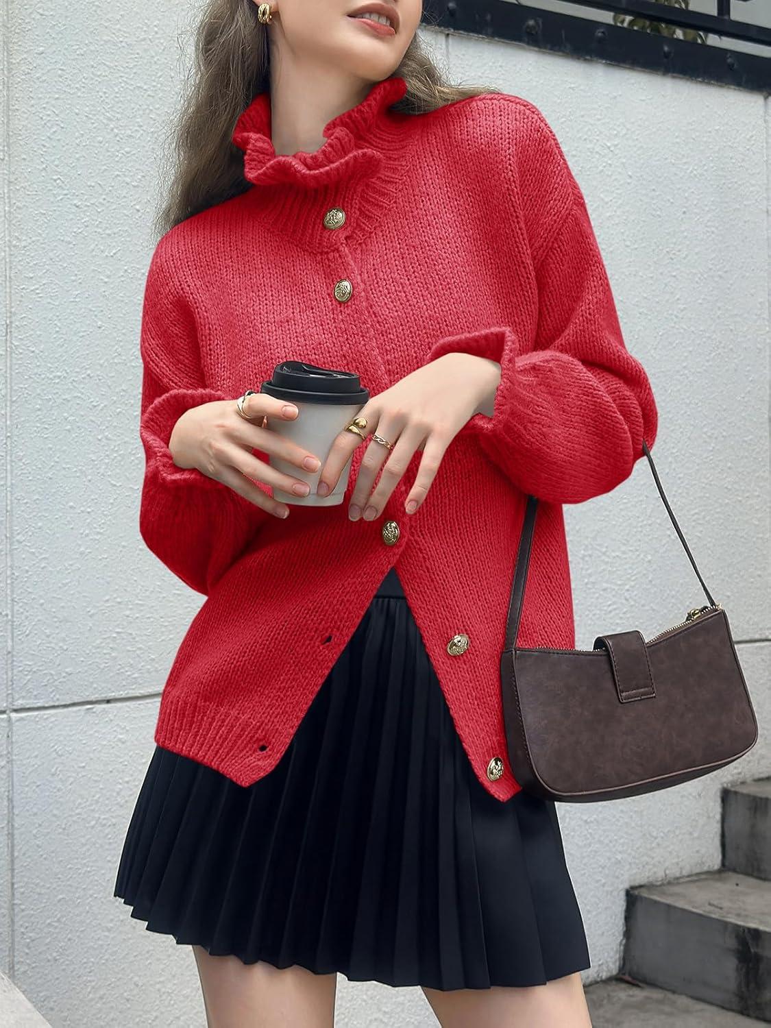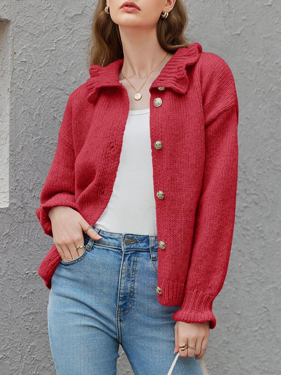 Saodimallsu Womens Ruffle Cardigan Oversized Button Up Fall Trendy Ribbed Knit Open Front Long Sleeve Loose Cute Sweater(Red)