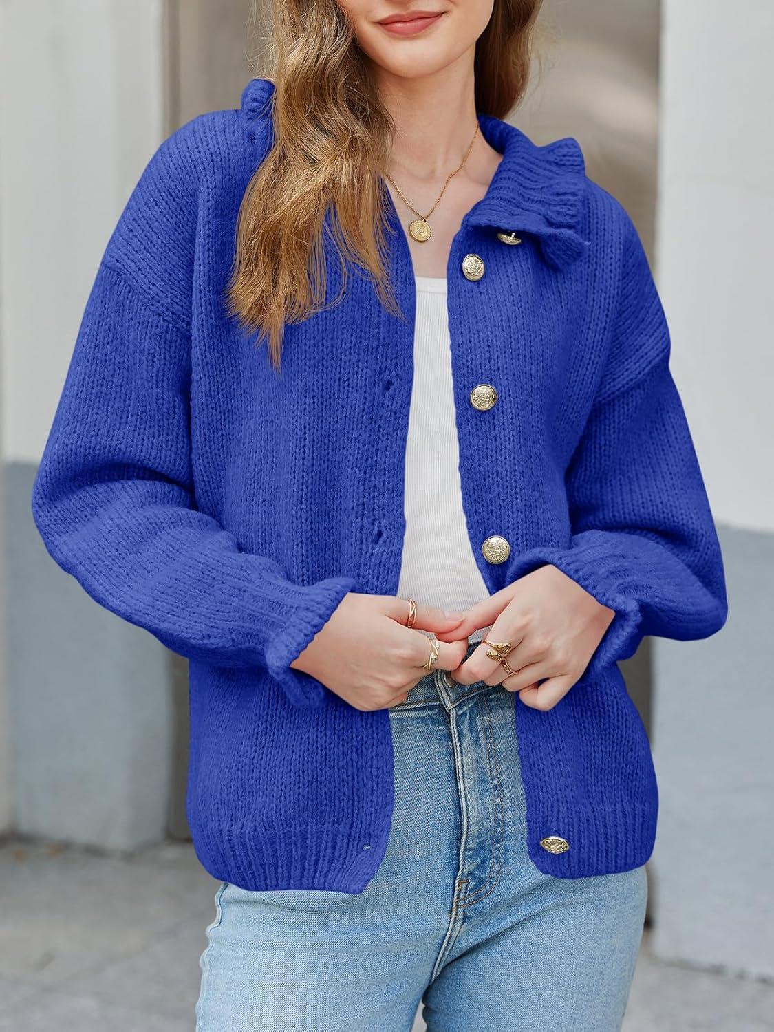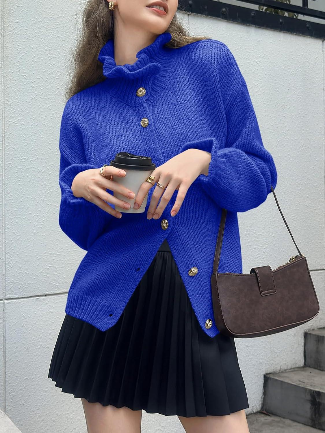 Saodimallsu Womens Ruffle Cardigan Oversized Button Up Fall Trendy Ribbed Knit Open Front Long Sleeve Loose Cute Sweater(Royal Blue)