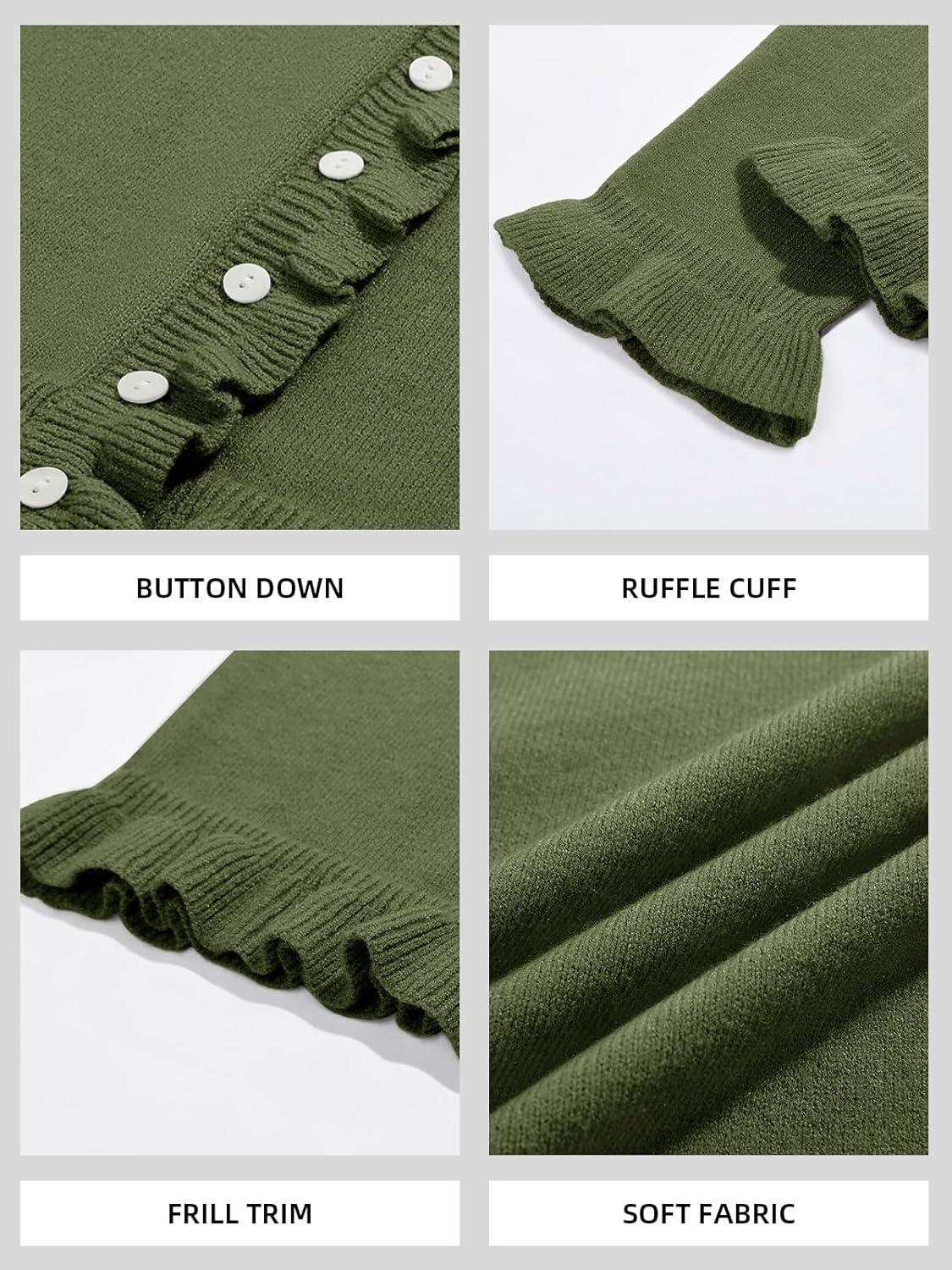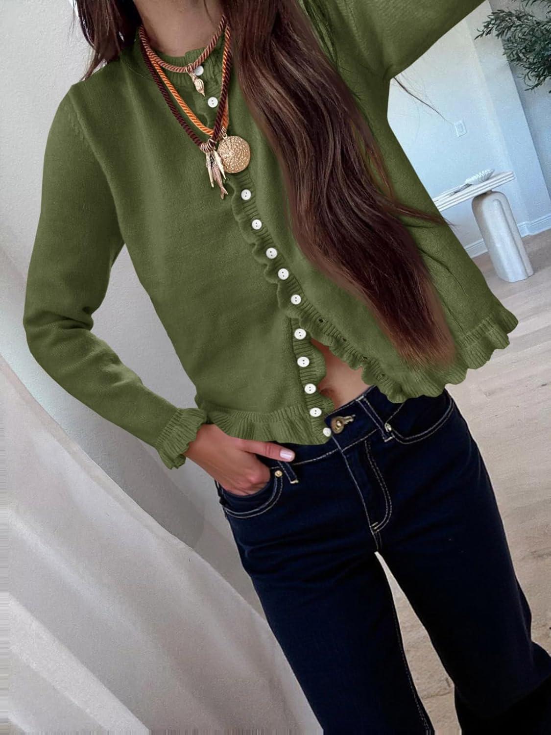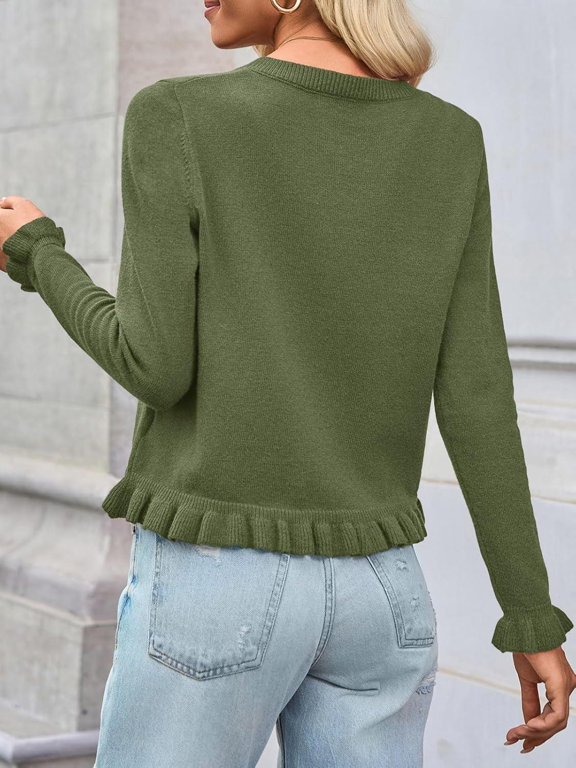 Saodimallsu Womens Ruffle Cardigan Sweaters Button Up Crew Neck Long Sleeve Cropped Sweater Cute Soft Knit Tops(Army Green)