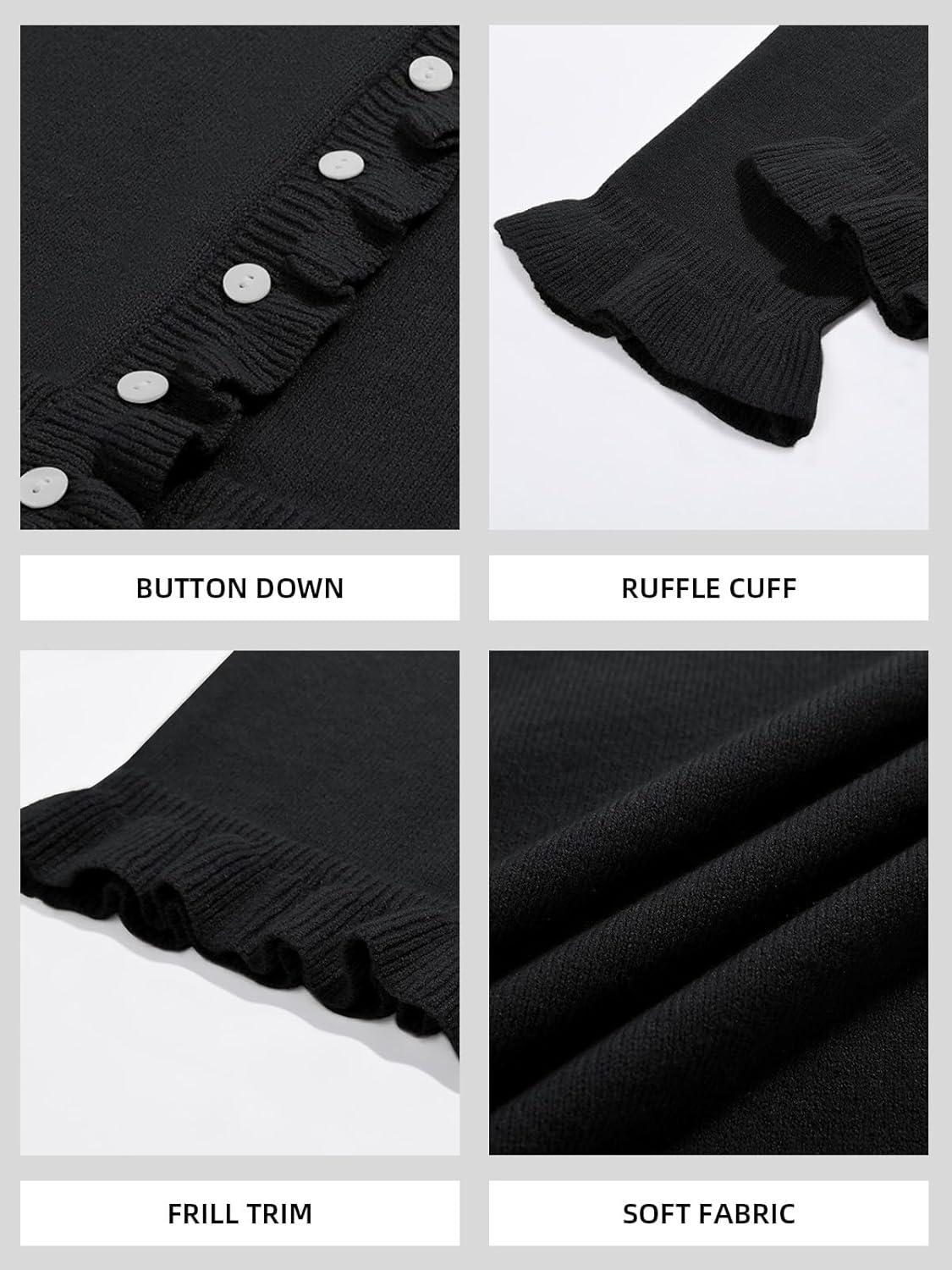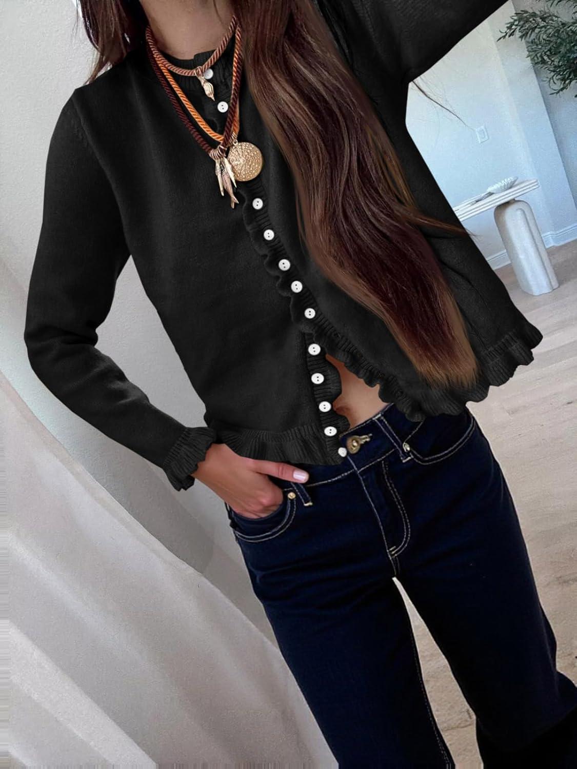 Saodimallsu Womens Ruffle Cardigan Sweaters Button Up Crew Neck Long Sleeve Cropped Sweater Cute Soft Knit Tops(Black)