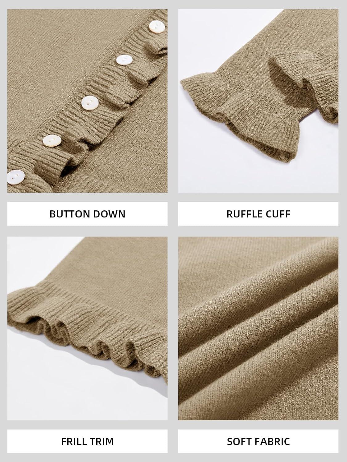 Saodimallsu Womens Ruffle Cardigan Sweaters Button Up Crew Neck Long Sleeve Cropped Sweater Cute Soft Knit Tops(Khaki)