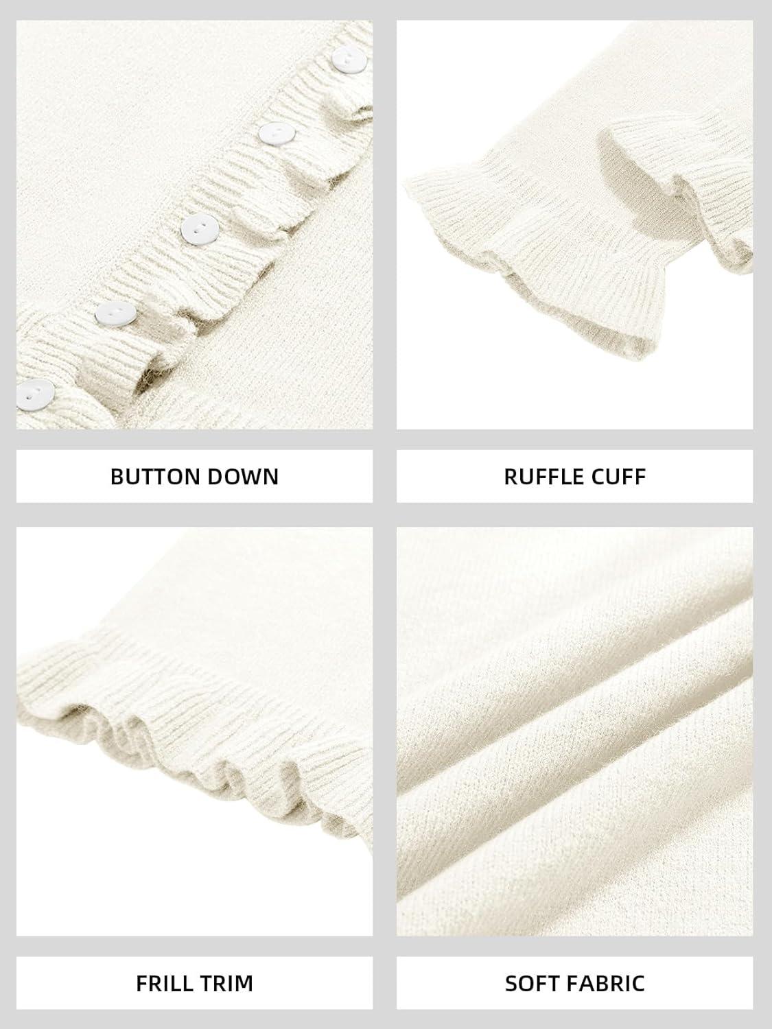 Saodimallsu Womens Ruffle Cardigan Sweaters Button Up Crew Neck Long Sleeve Cropped Sweater Cute Soft Knit Tops(White)