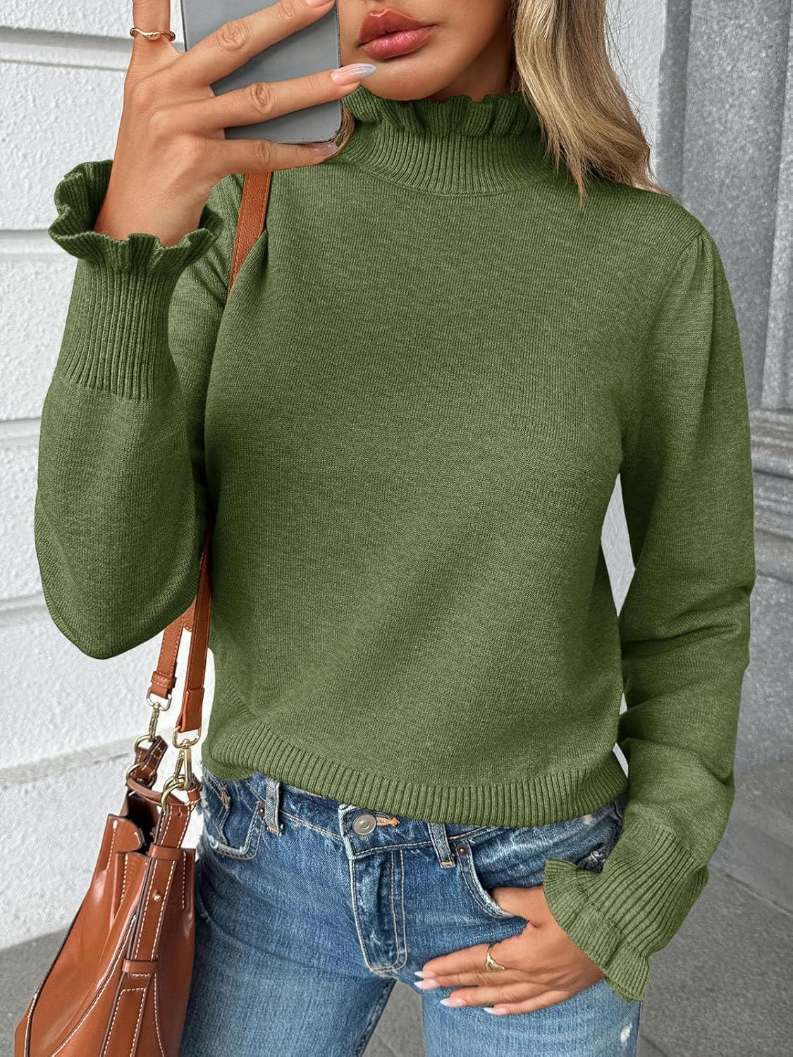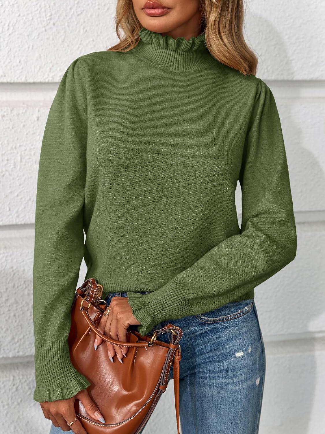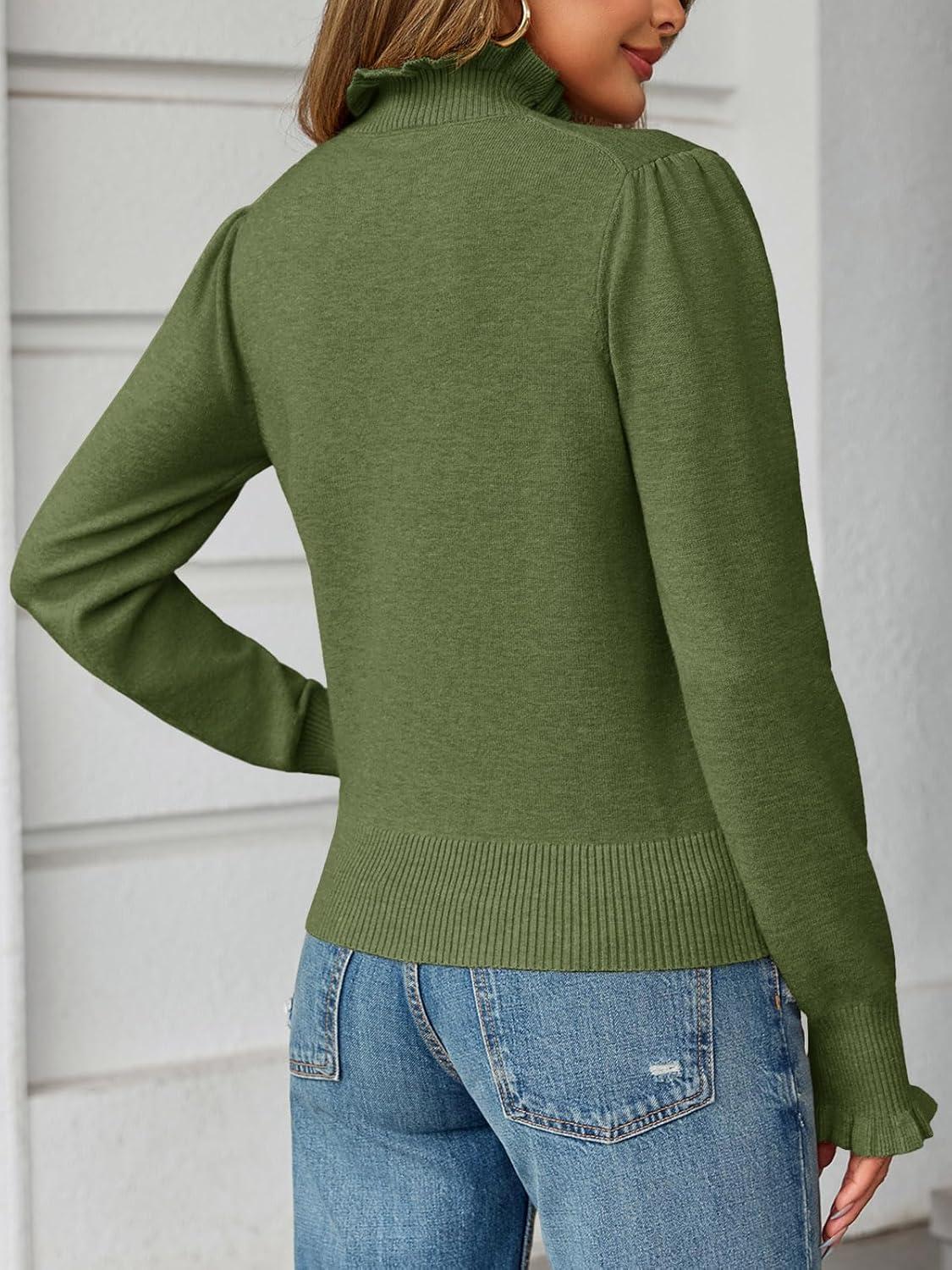 Saodimallsu Womens Ruffle Mock Neck Sweater Puff Long Sleeve Fall Soft Knit Casual Pullover Sweaters Top(Army Green)