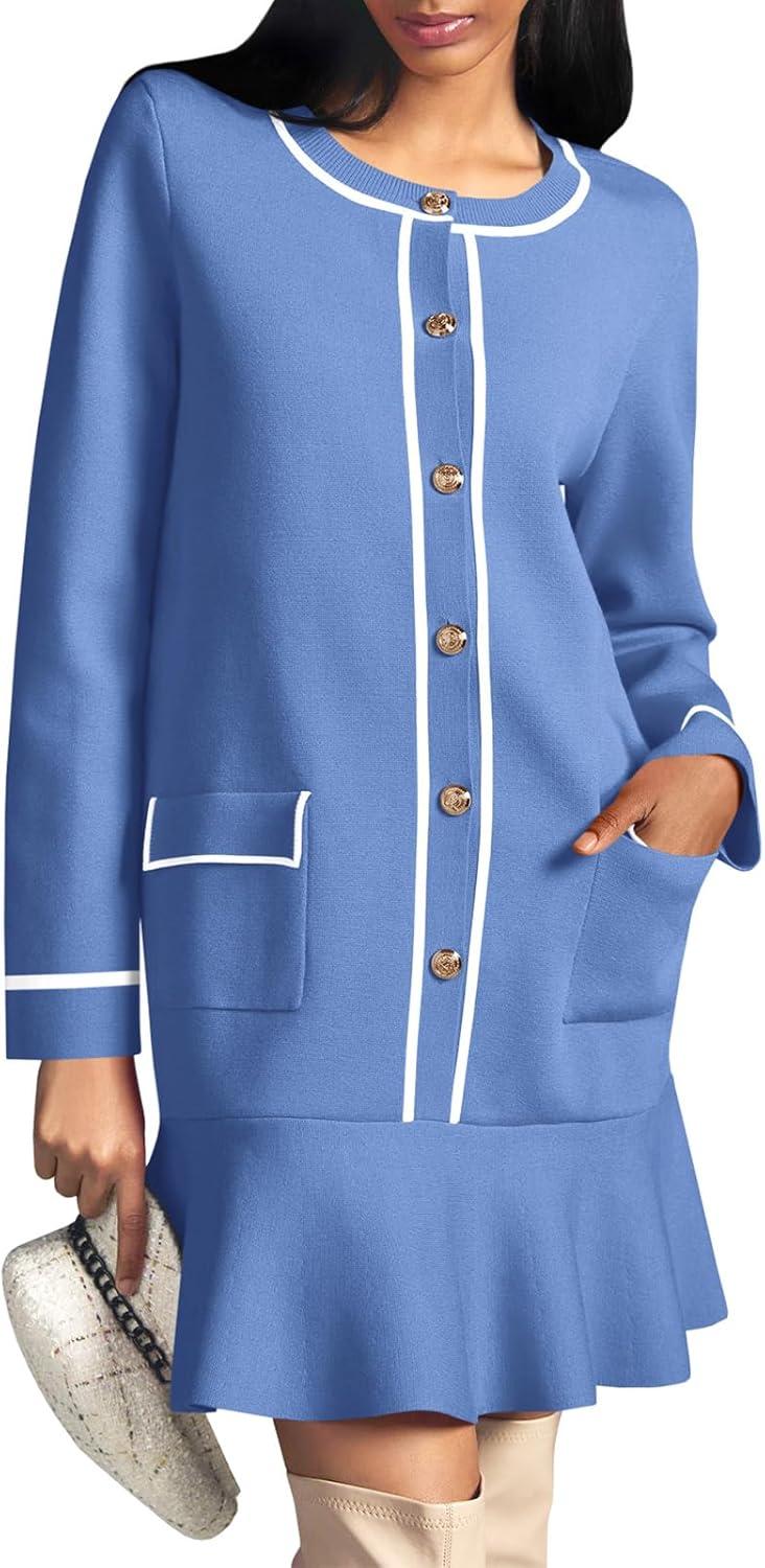 Saodimallsu Womens Ruffle Sweater Dress Button Fall Crew Neck Trendy Color Block Long Sleeve Mini Dresses with Pockets(Navy)