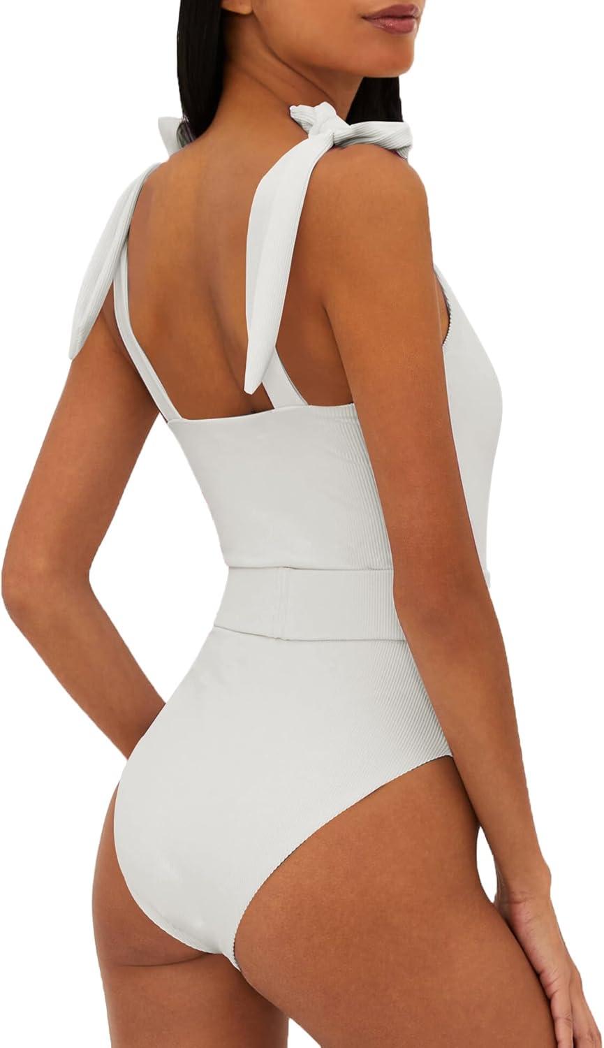 Saodimallsu Womens Sexy One Piece Bathing Suit High Cut Knit Square Neck Tied Strappy Swimsuit with Belt(白色)
