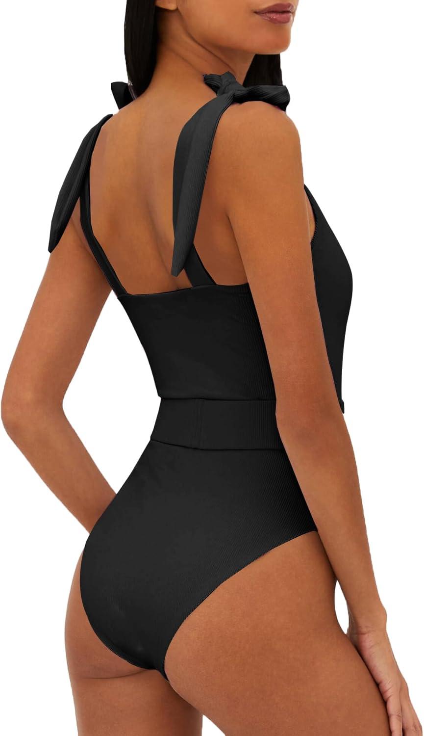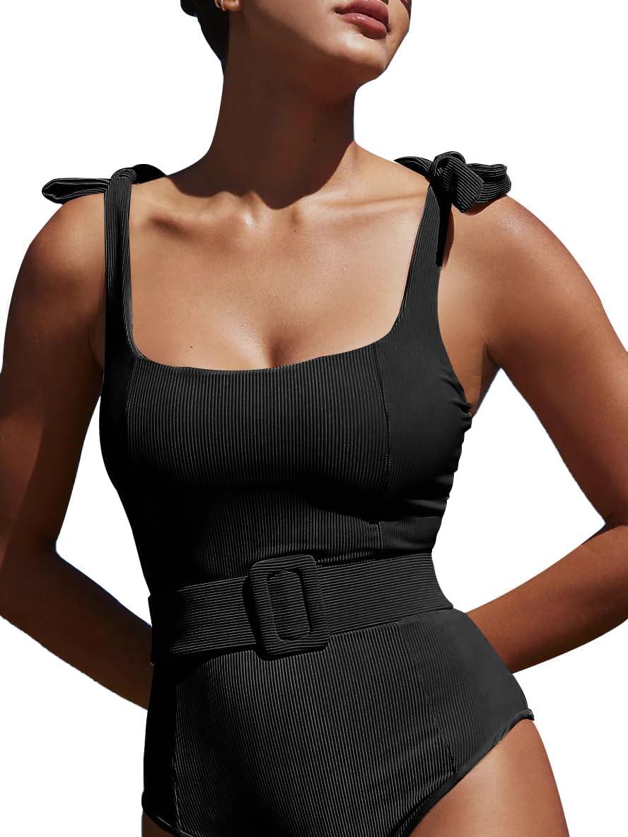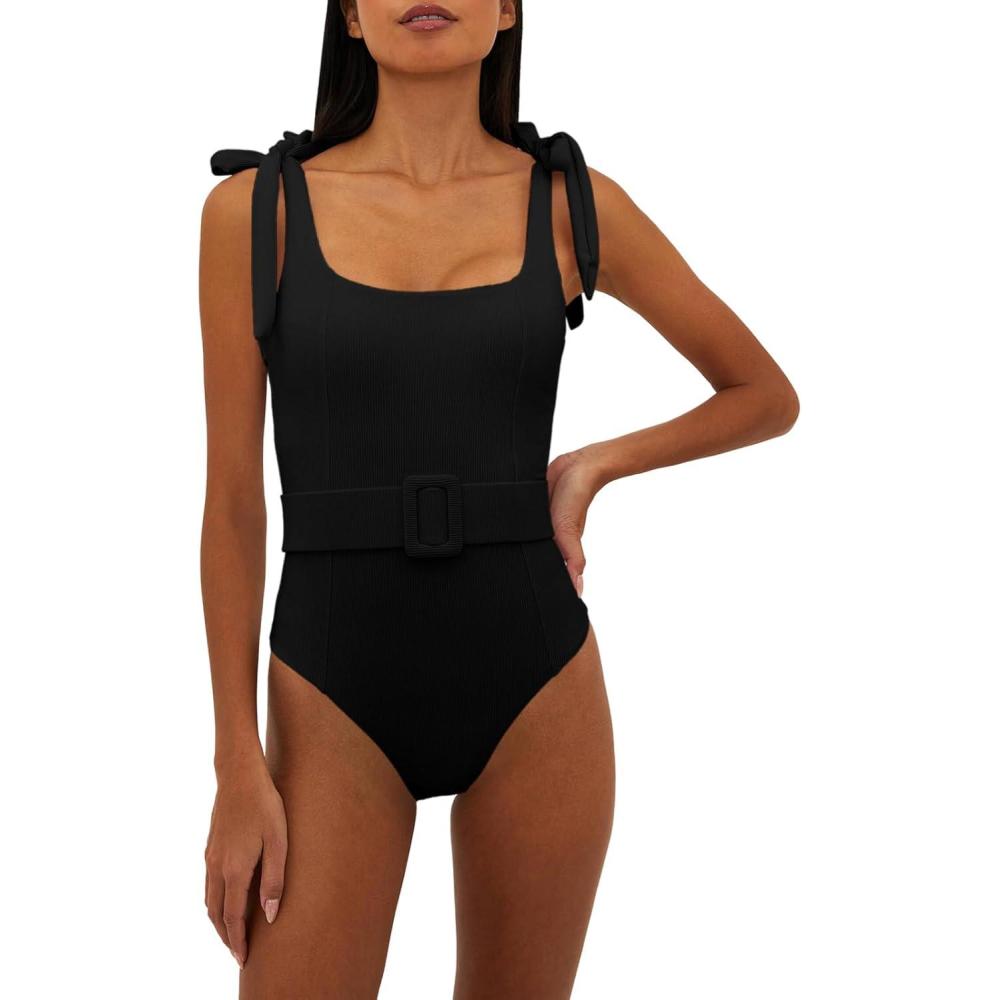 Saodimallsu Womens Sexy One Piece Bathing Suit High Cut Knit Square Neck Tied Strappy Swimsuit with Belt(Black)