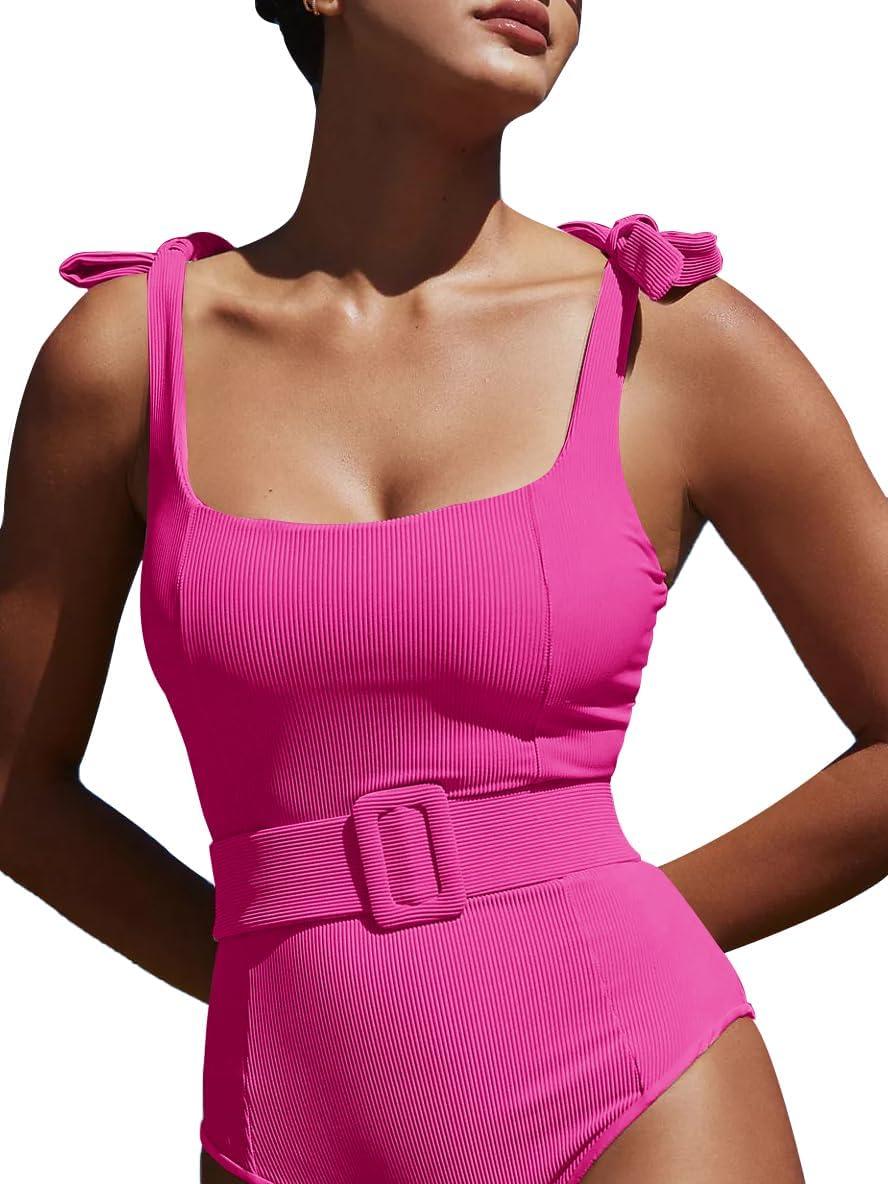 Saodimallsu Womens Sexy One Piece Bathing Suit High Cut Knit Square Neck Tied Strappy Swimsuit with Belt(Rose Red)