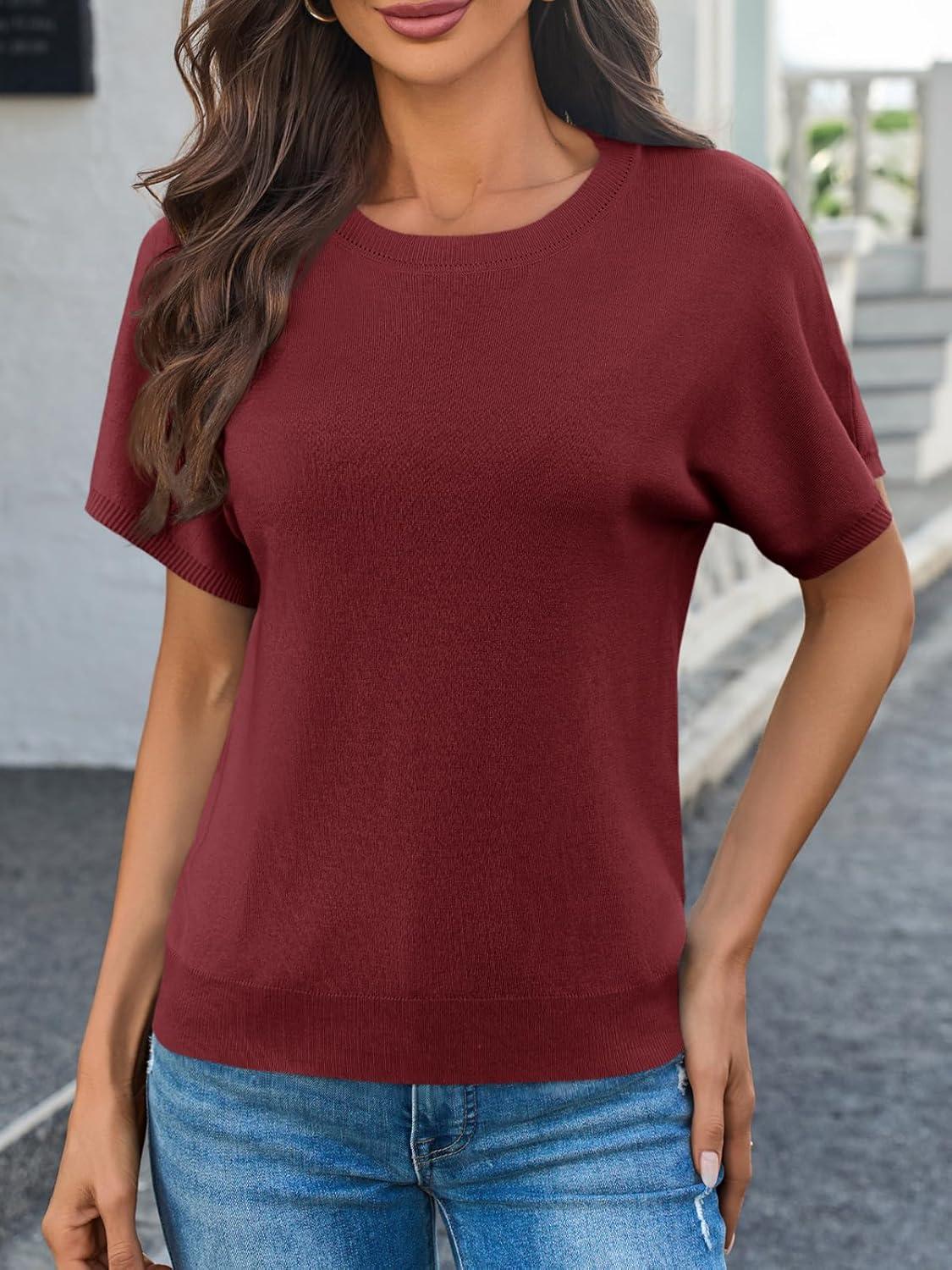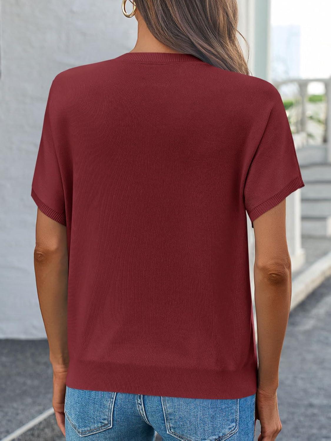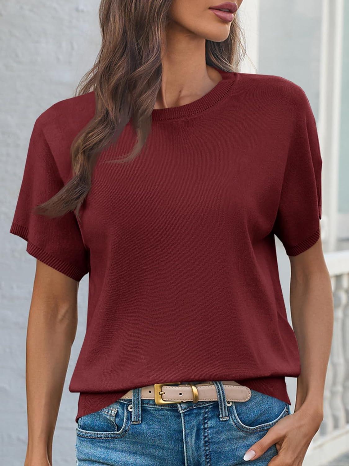 Saodimallsu Womens Short Sleeve Sweater Casual Basic Crew Neck Loose Knit Pullover Tops Summer Lightweight Blouses(Burgundy)