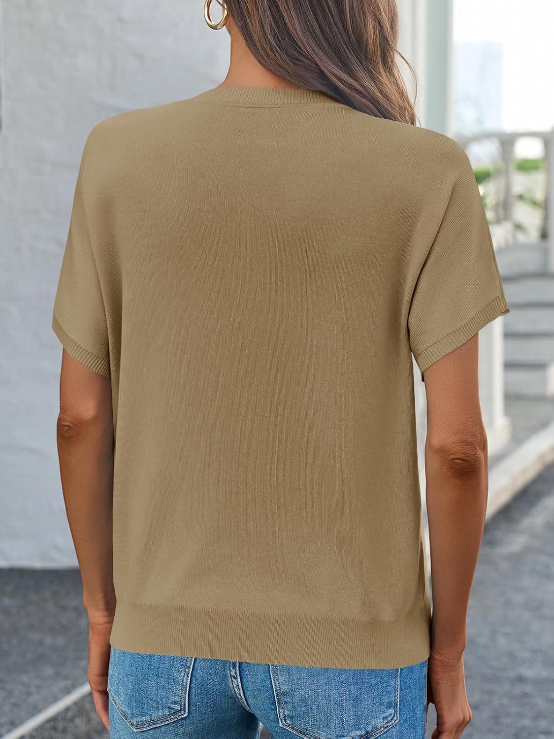 Saodimallsu Womens Short Sleeve Sweater Casual Basic Crew Neck Loose Knit Pullover Tops Summer Lightweight Blouses(Khaki)