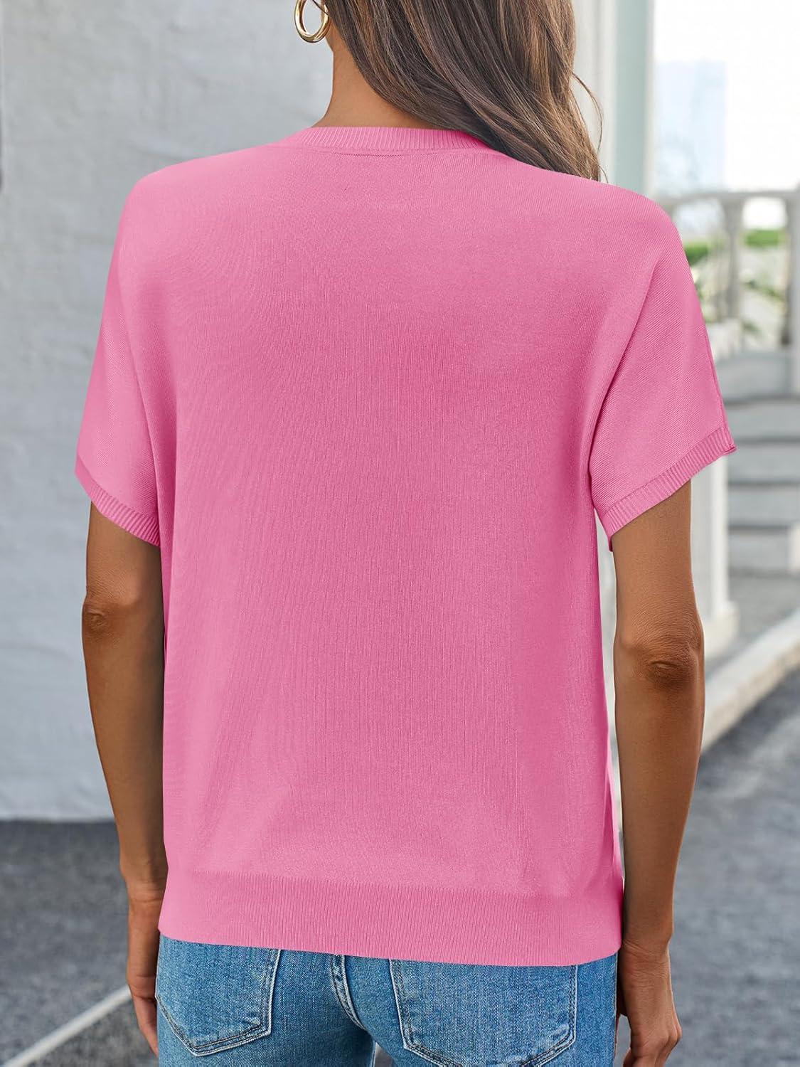 Saodimallsu Womens Short Sleeve Sweater Casual Basic Crew Neck Loose Knit Pullover Tops Summer Lightweight Blouses(Pink)
