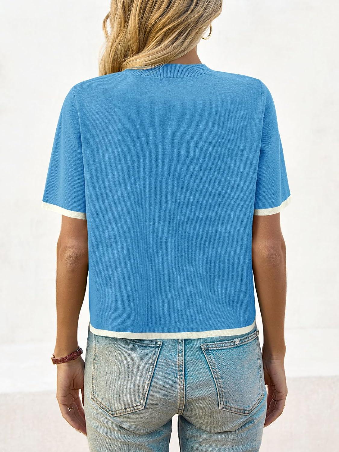 Saodimallsu Womens Short Sleeve Sweater Color Block Crew Neck Summer Crop Tops Loose Casual Knit Shirts with Pockets(Blue)