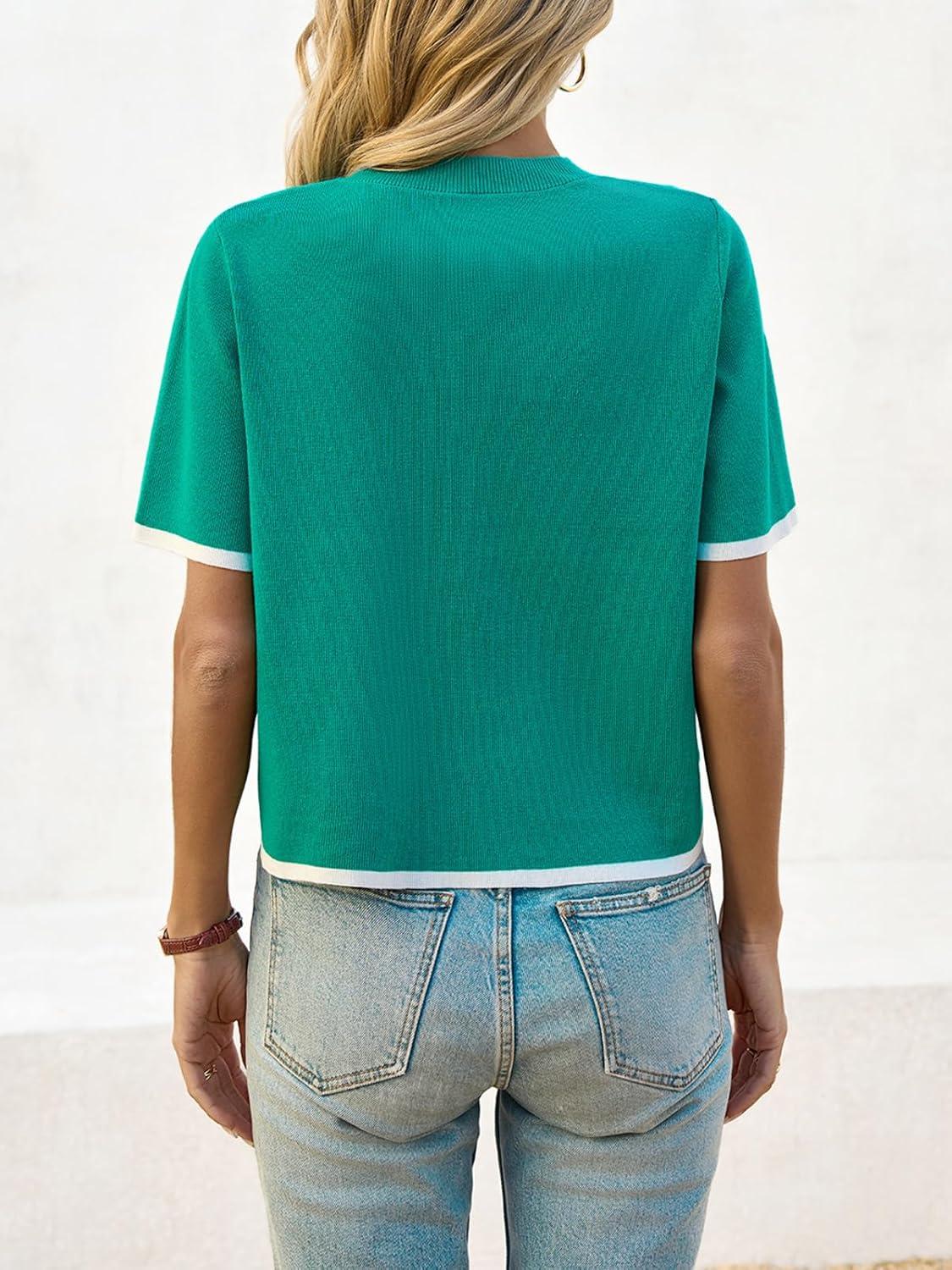 Saodimallsu Womens Short Sleeve Sweater Color Block Crew Neck Summer Crop Tops Loose Casual Knit Shirts with Pockets(Green)