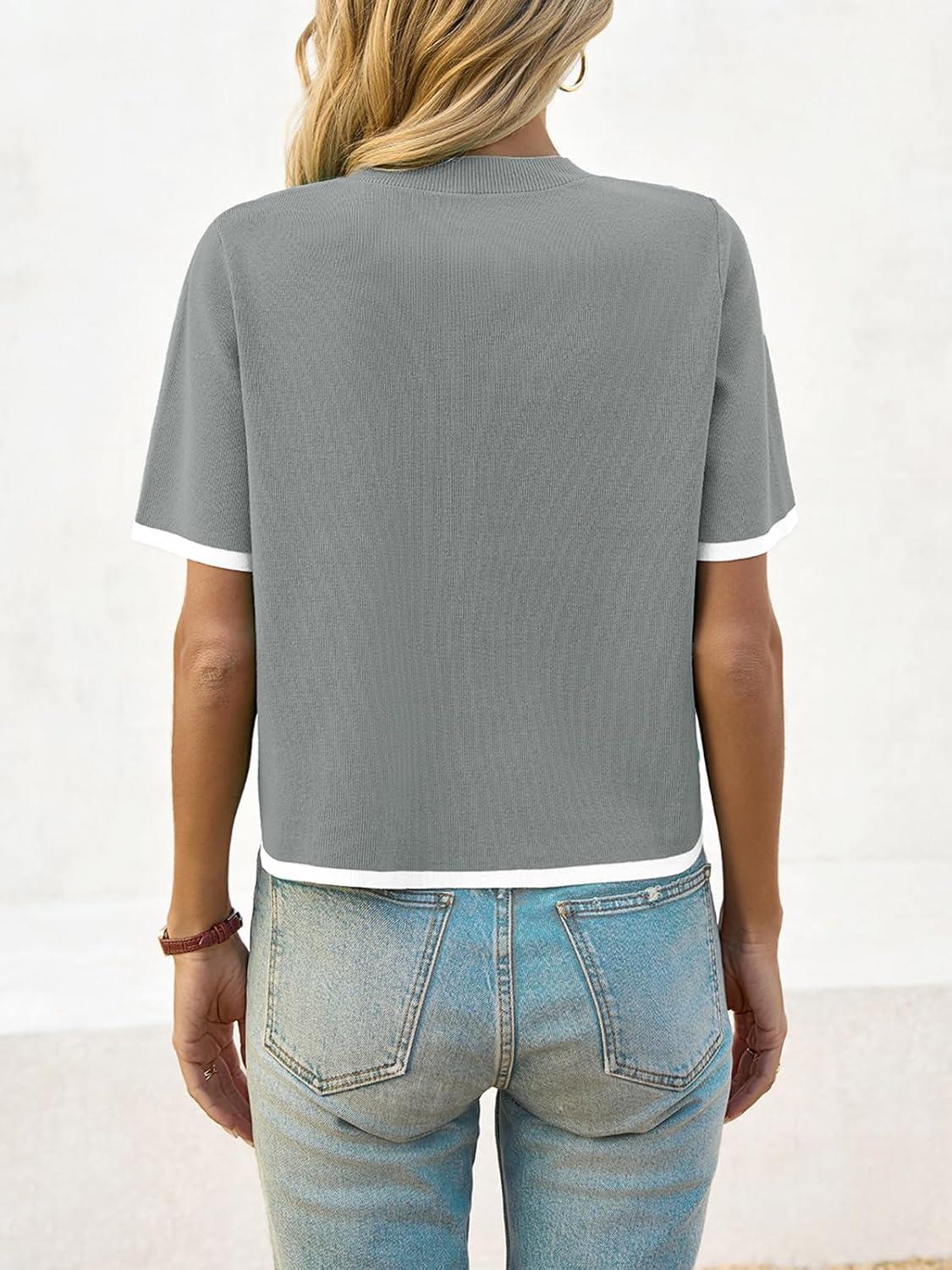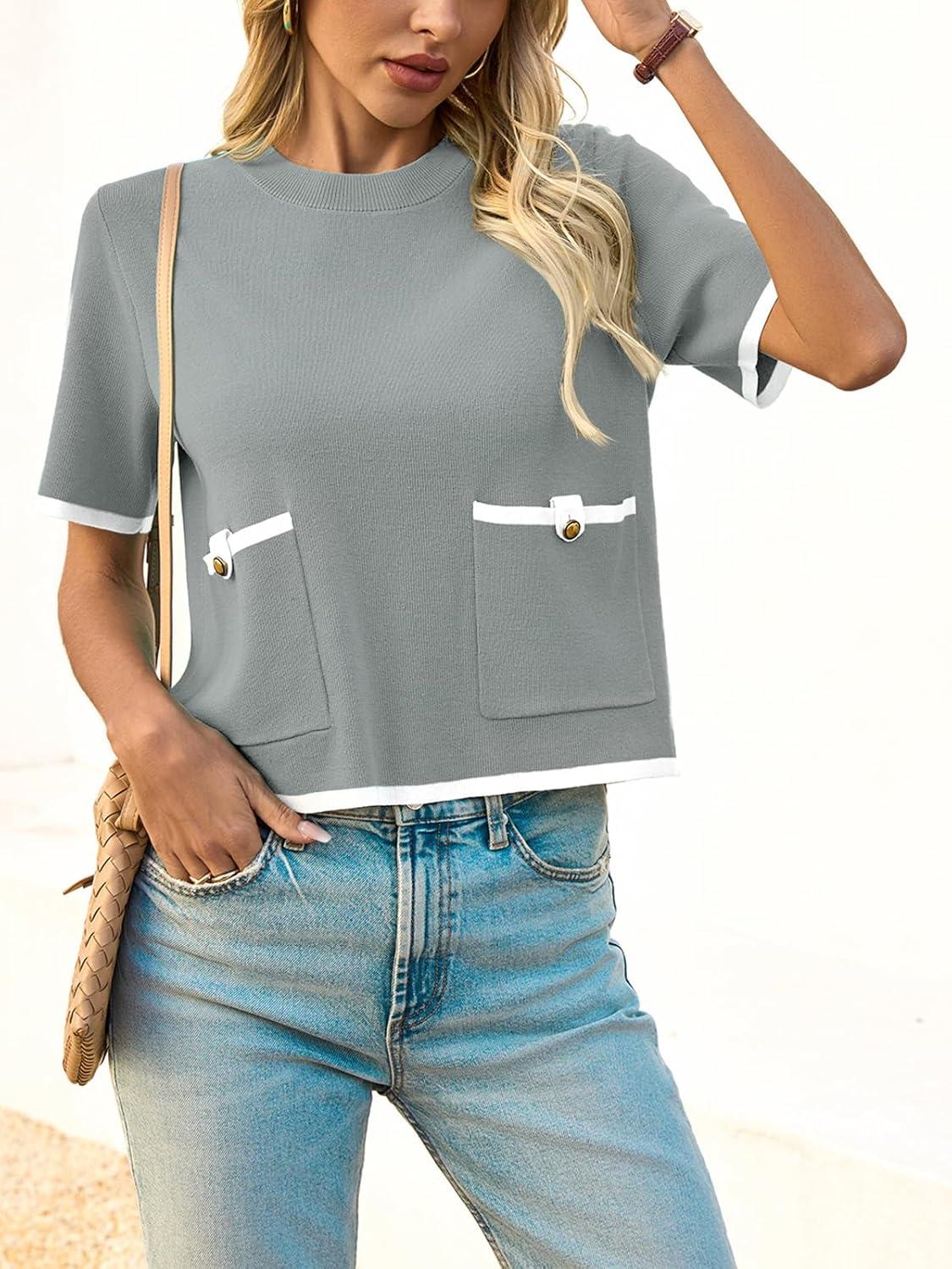 Saodimallsu Womens Short Sleeve Sweater Color Block Crew Neck Summer Crop Tops Loose Casual Knit Shirts with Pockets(Grey)