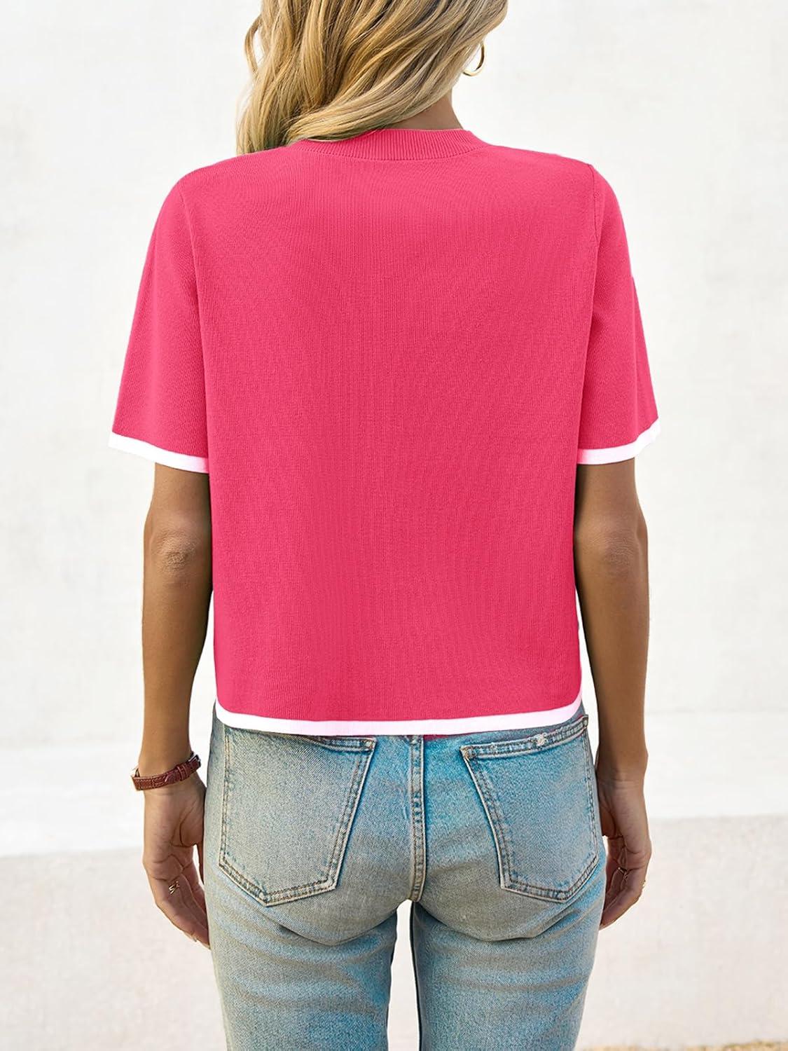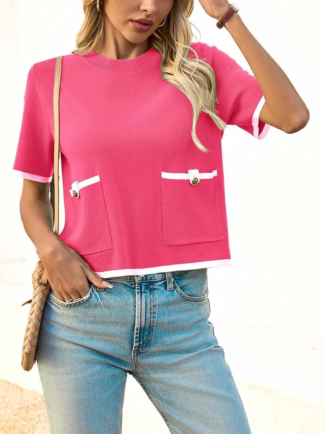 Saodimallsu Womens Short Sleeve Sweater Color Block Crew Neck Summer Crop Tops Loose Casual Knit Shirts with Pockets(Rose Red)