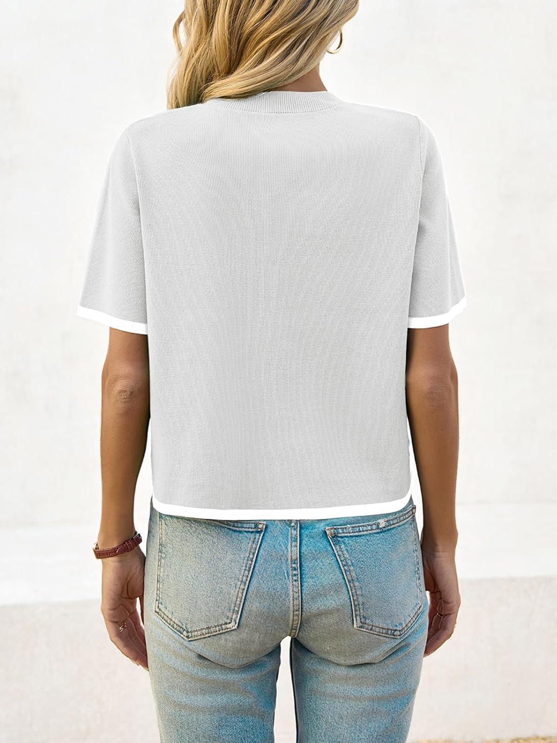 Saodimallsu Womens Short Sleeve Sweater Color Block Crew Neck Summer Crop Tops Loose Casual Knit Shirts with Pockets(White)