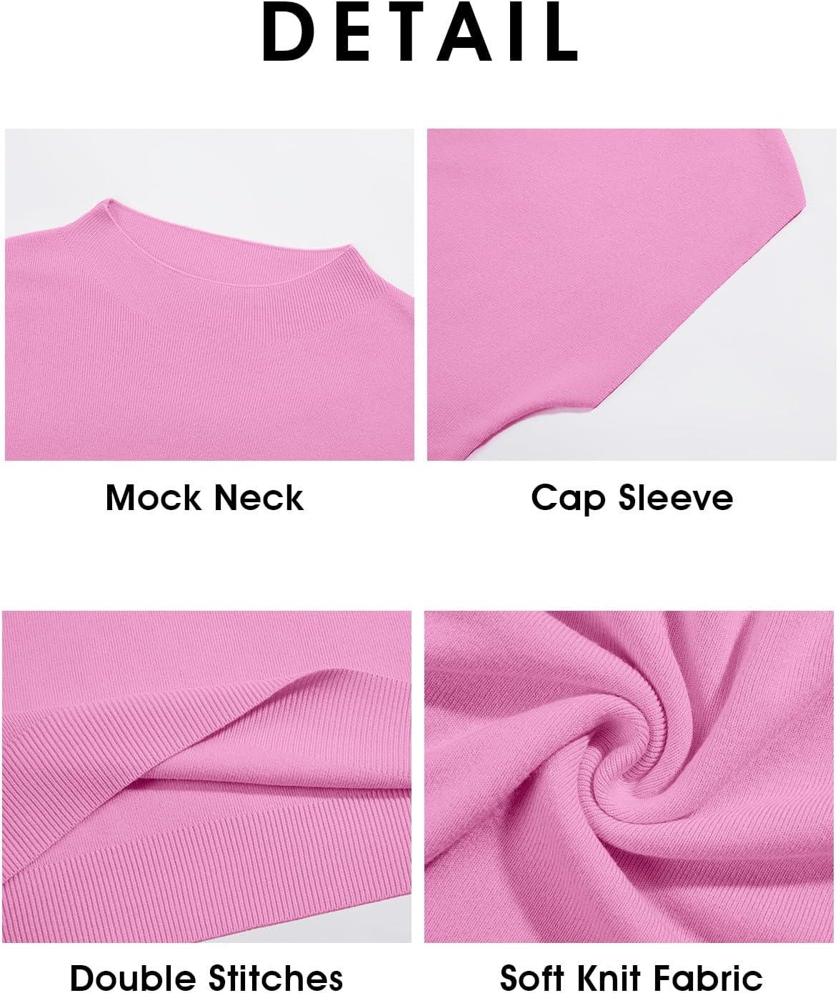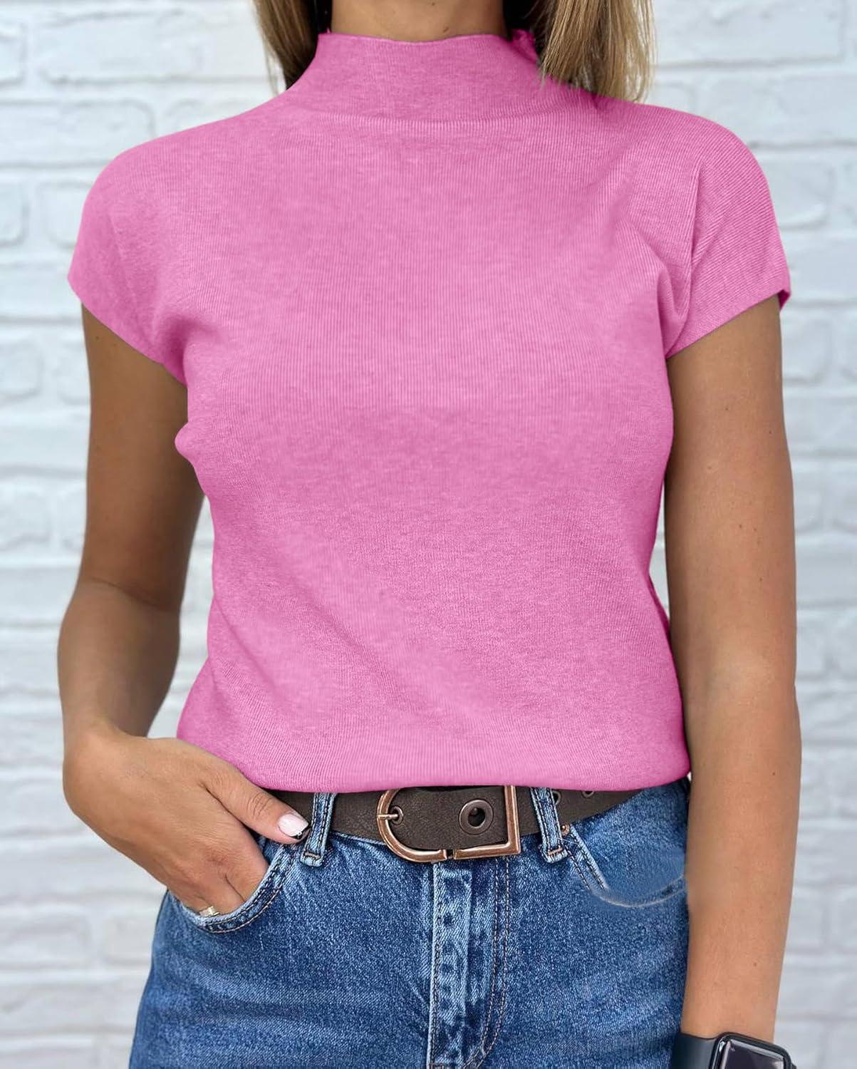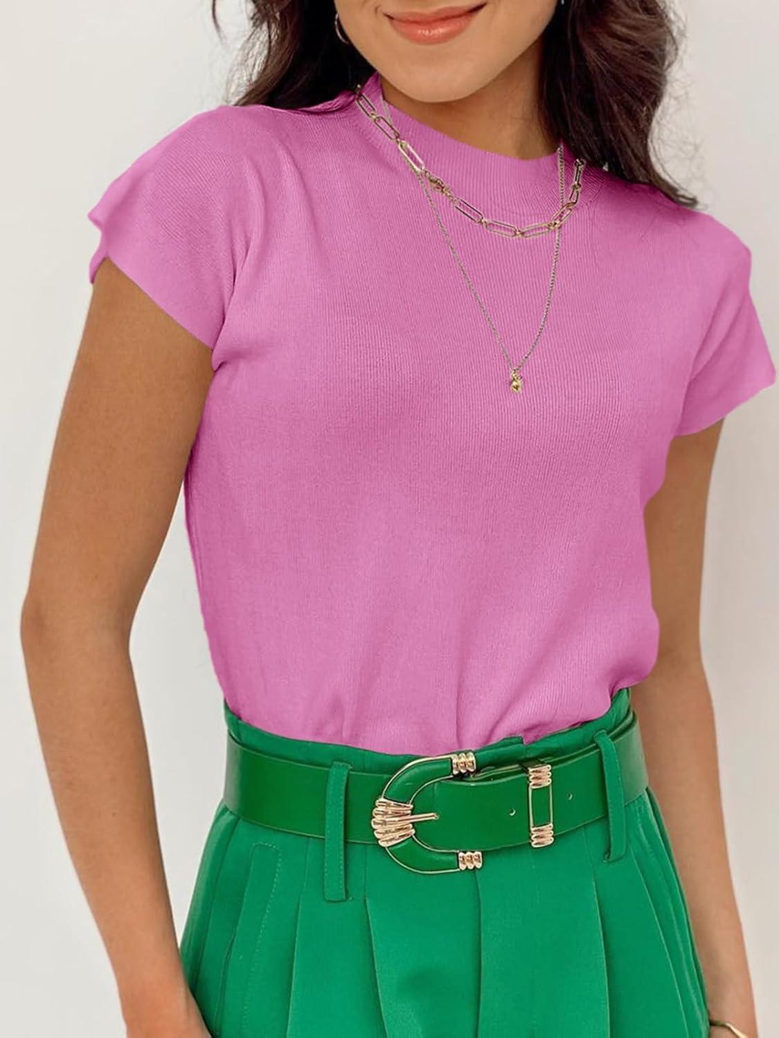 Saodimallsu Womens Short Sleeve Sweater Mock Neck Summer Casual Basic Knit Slim Fitted Pullover Tops Shirt(Hot Pink)