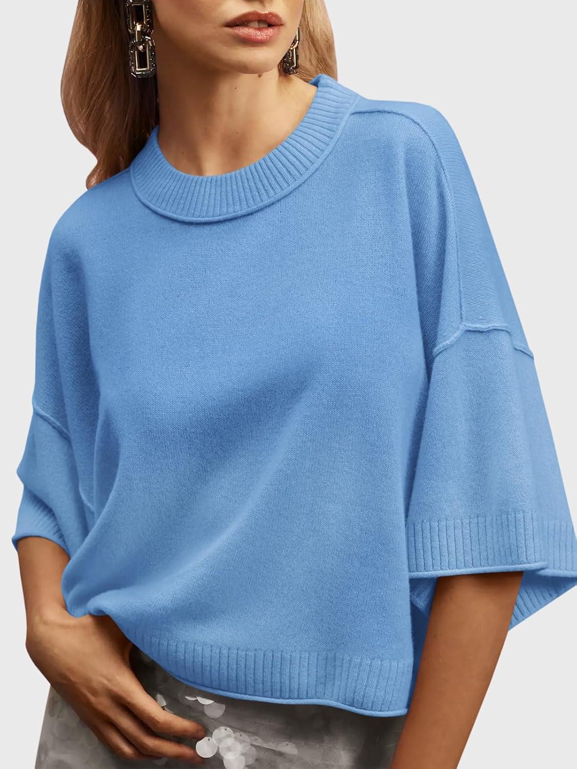 Saodimallsu Womens Short Sleeve Sweater Summer Oversized Cropped Sweaters Casual Crewneck Lightweight Knit Tops(Blue)