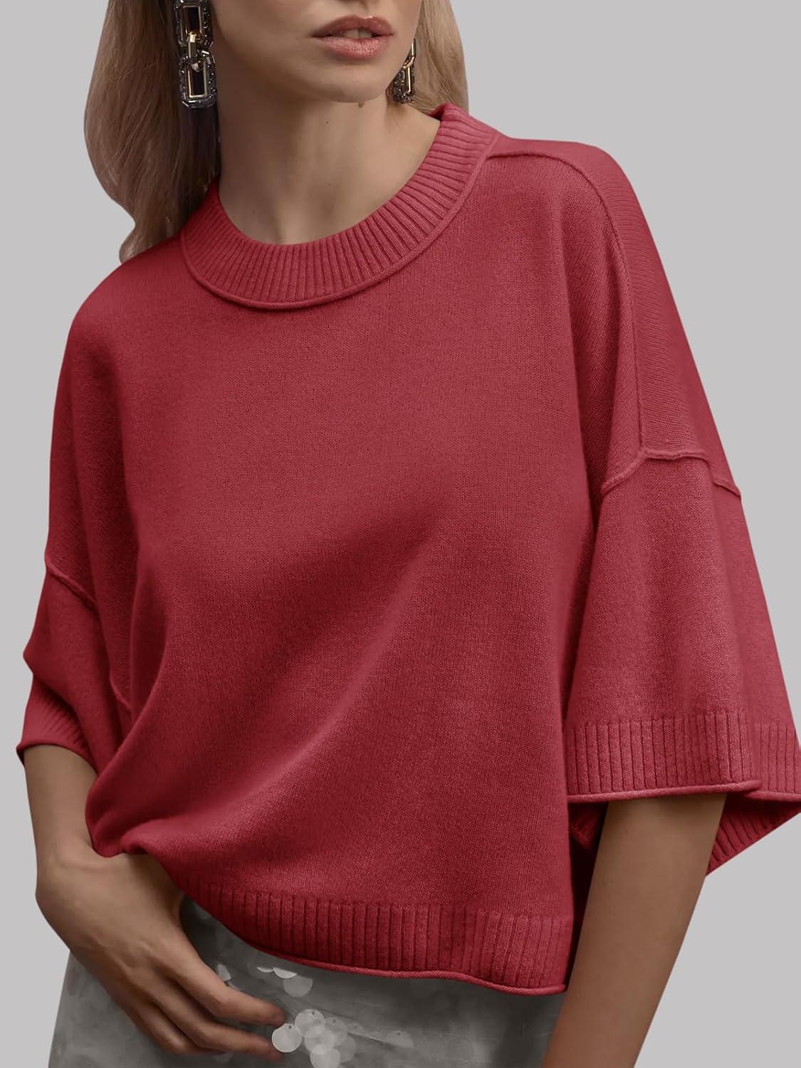 Saodimallsu Womens Short Sleeve Sweater Summer Oversized Cropped Sweaters Casual Crewneck Lightweight Knit Tops(Red)