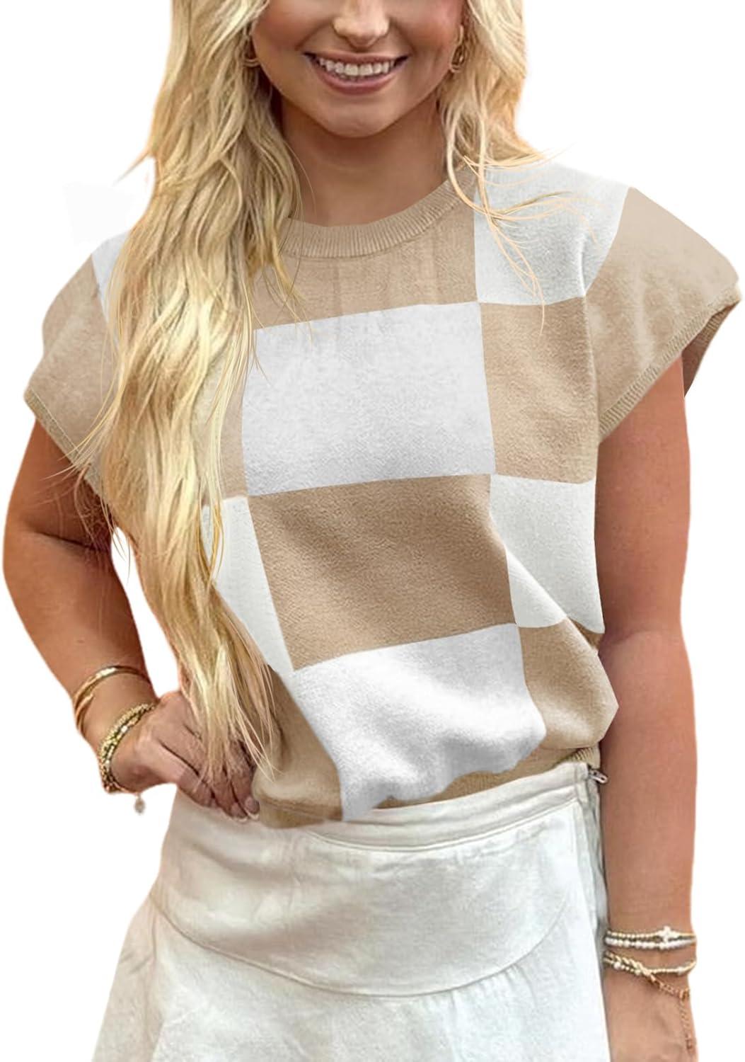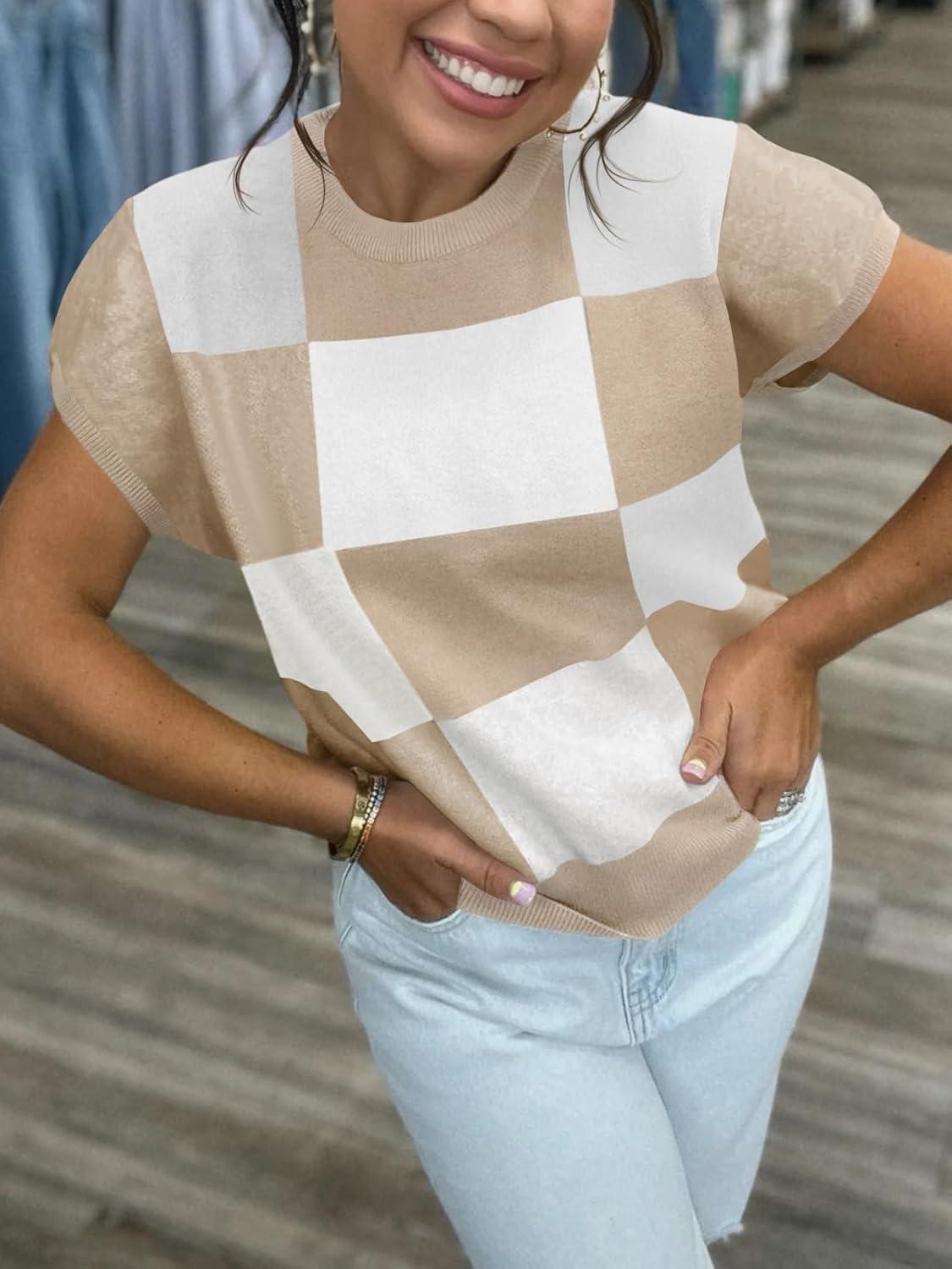 Saodimallsu Womens Short Sleeve Sweater Top Summer Color Block Lightweight Knit Crewneck Going Out Pullover Tops(Apricot)