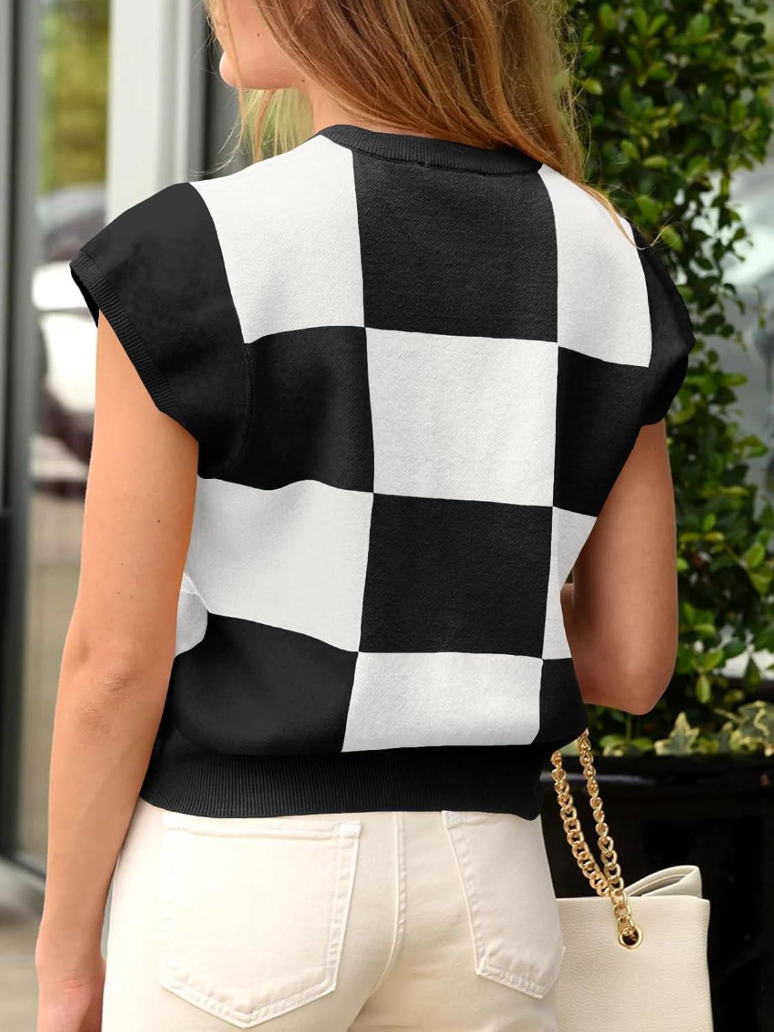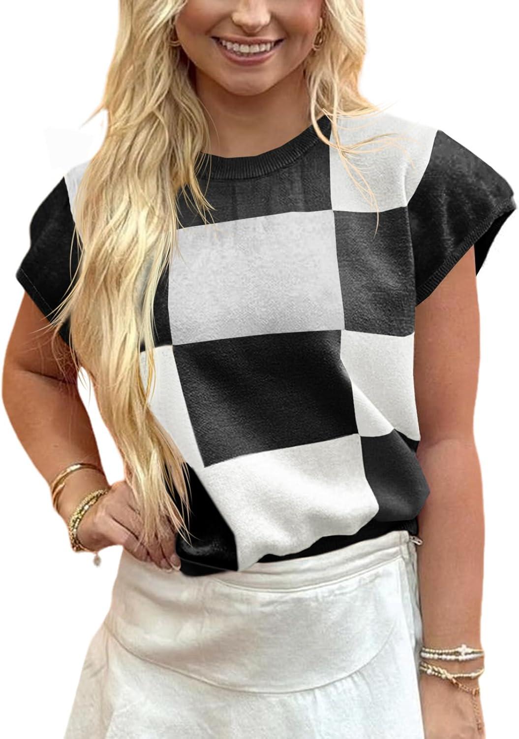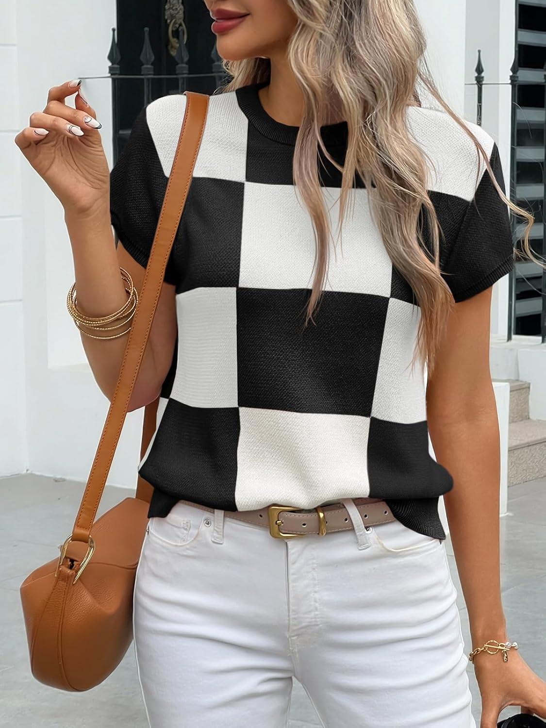 Saodimallsu Womens Short Sleeve Sweater Top Summer Color Block Lightweight Knit Crewneck Going Out Pullover Tops(Black)
