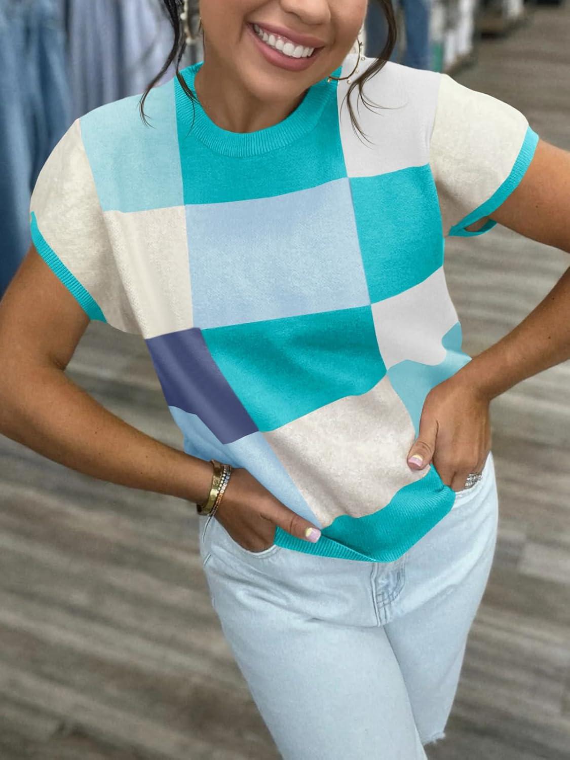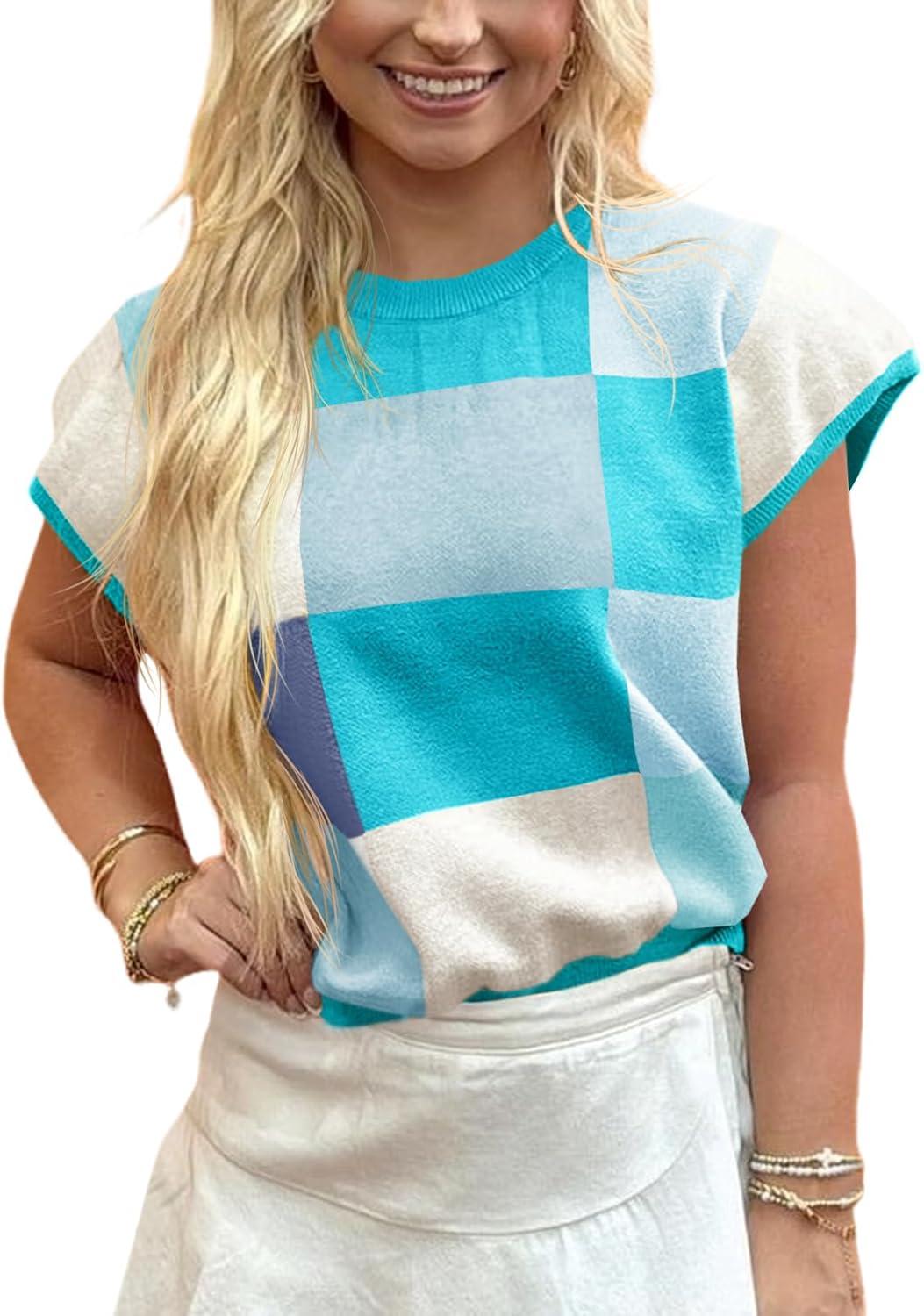 Saodimallsu Womens Short Sleeve Sweater Top Summer Color Block Lightweight Knit Crewneck Going Out Pullover Tops(Blue)