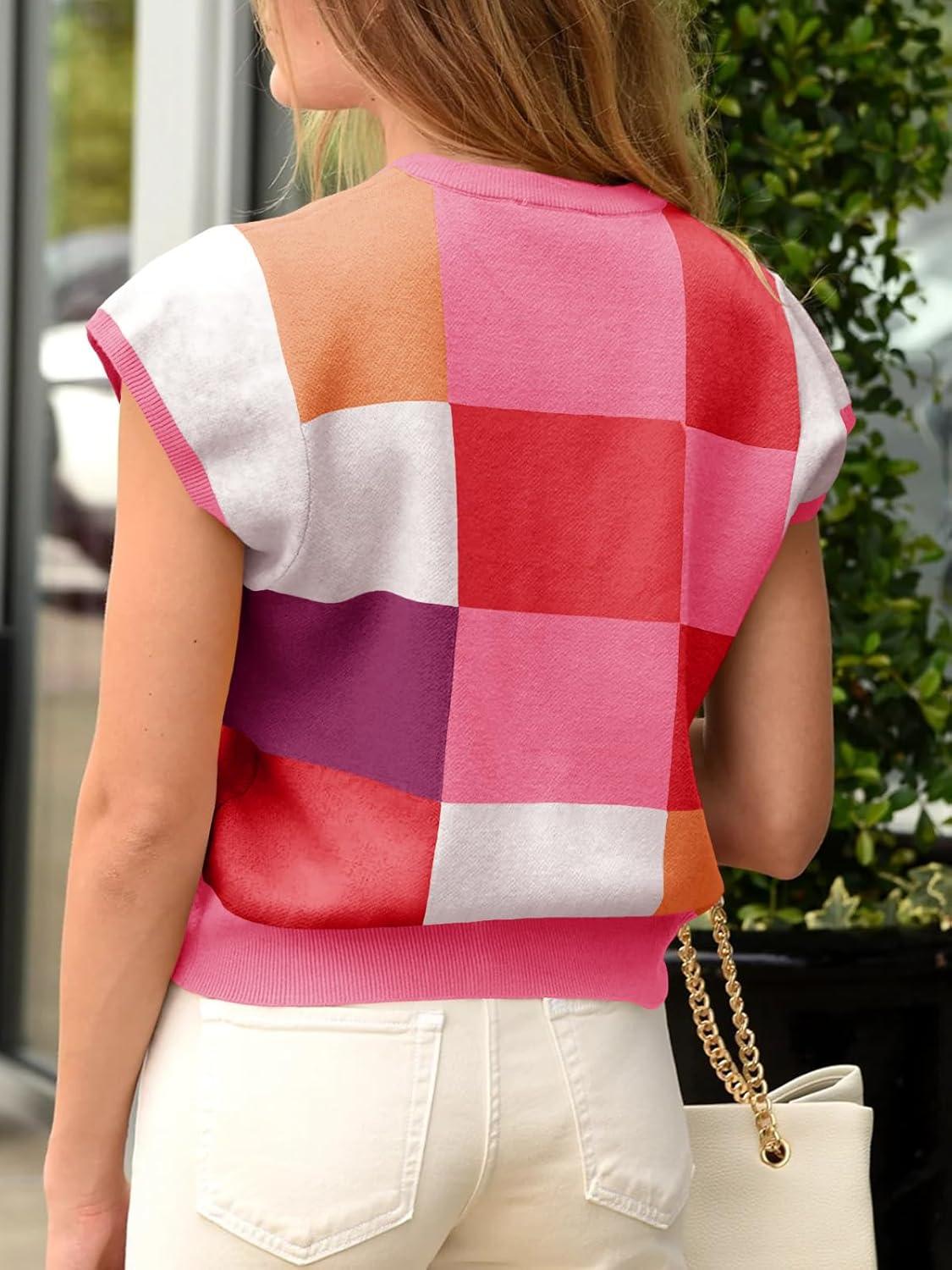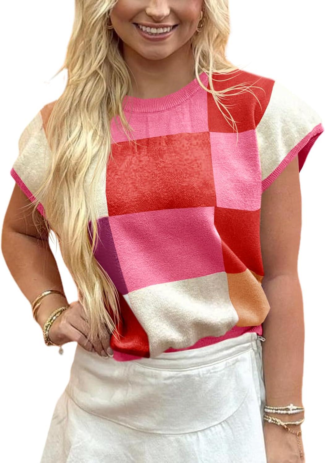 Saodimallsu Womens Short Sleeve Sweater Top Summer Color Block Lightweight Knit Crewneck Going Out Pullover Tops(Pink)